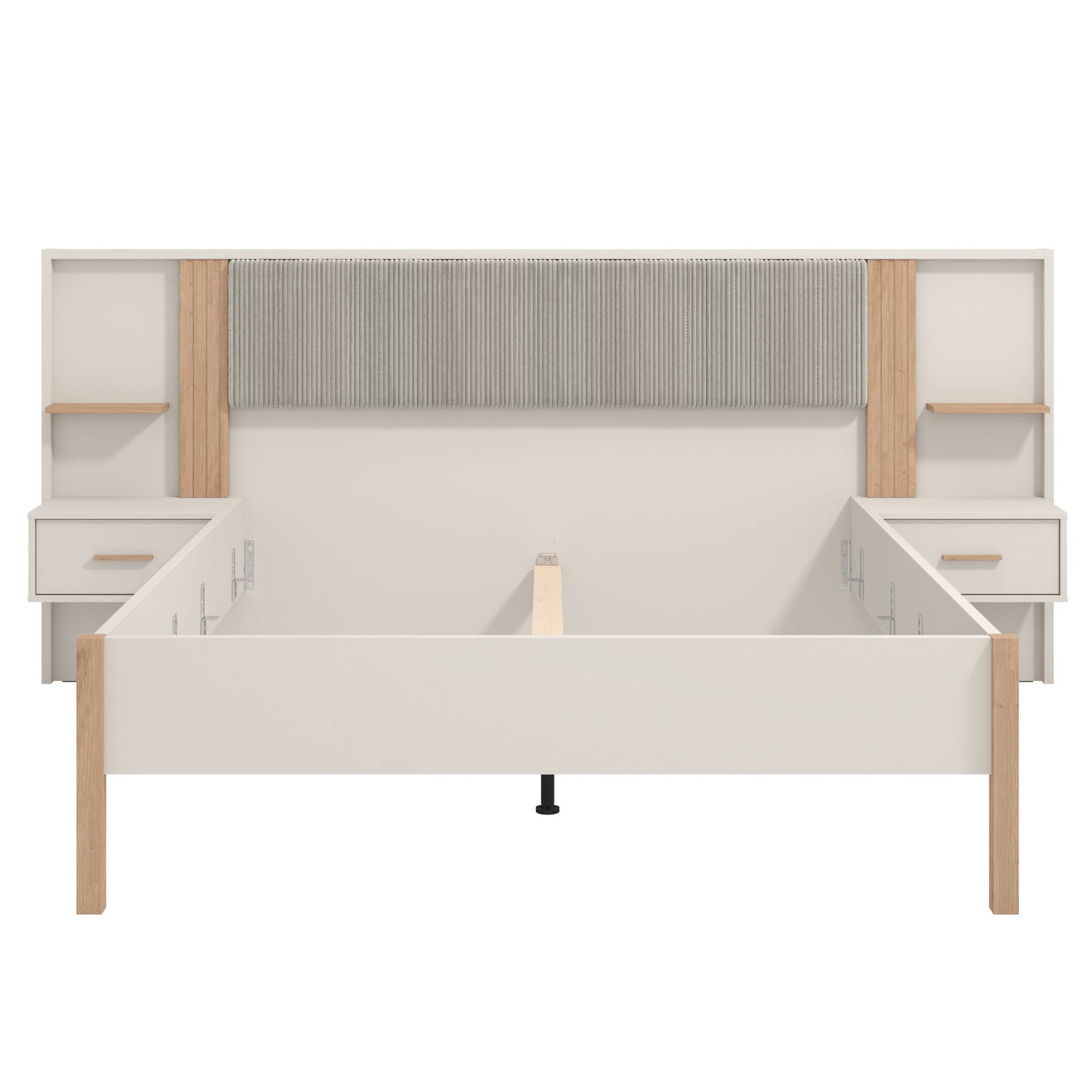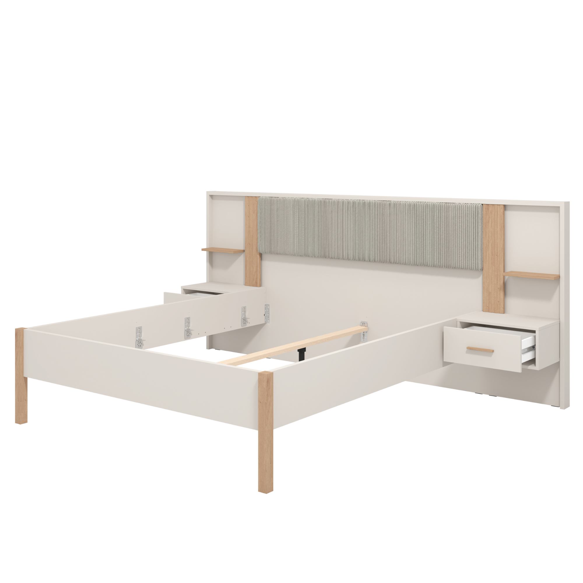 Posteľ je navyše vybavená 2 nočnými stolíkmi, ktoré sú súčasťou čelného panela. Každý stolík obsahuje 1 priestrannú zásuvku, ale využiť môžete aj vrchnú odkladaciu dosku. Na každej strane postele sa navyše nachádza odkladacia polička upevnená nad stolíkom.
