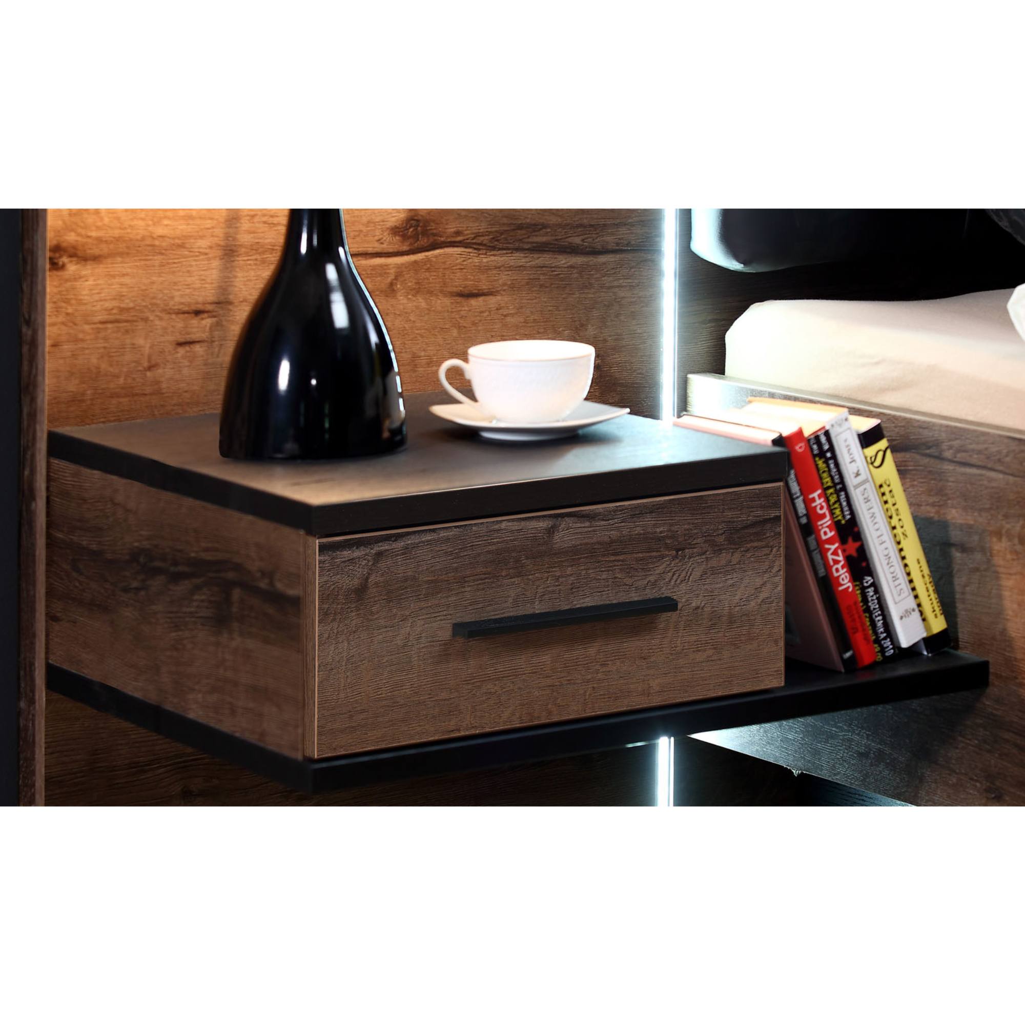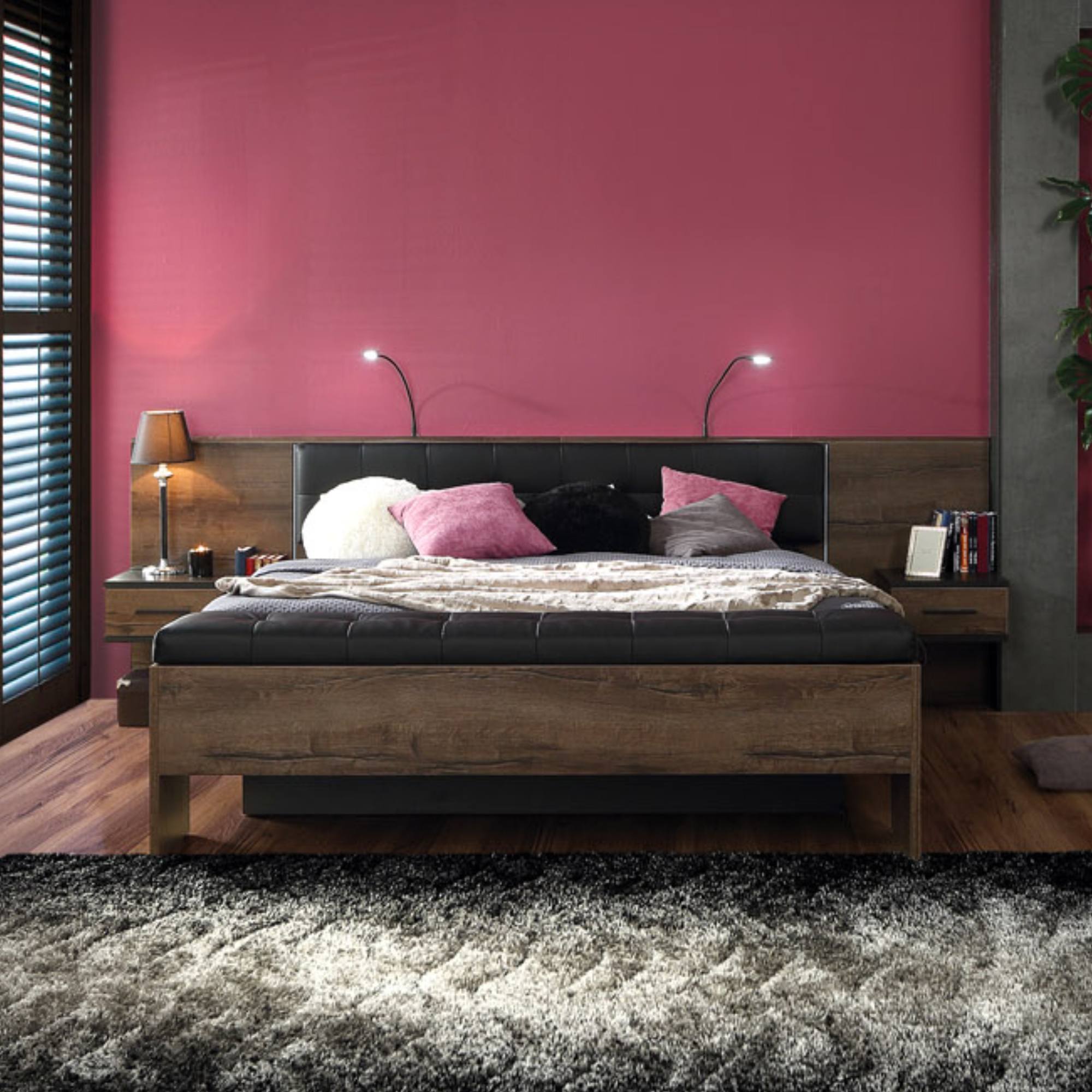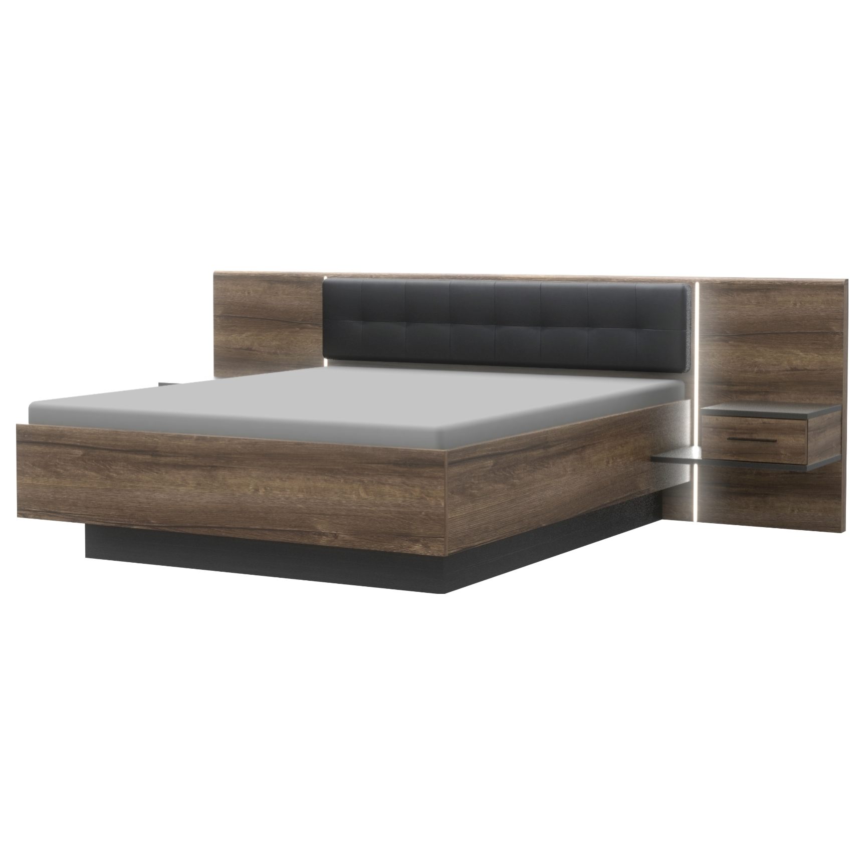 Elegantný posteľový rám BELLEVUE s nočnými stolíkmi a výrazným panelovým čelom vytvára dojem surového dreva. Posteľ je vyrobená z dobre udržiavateľného laminovaného materiálu. Čalúnené čelo z textilnej kože poskytuje oporu chrbtu pri relaxácii. Kombinácia dekoru ušľachtilého duba a duba čierneho dodáva posteli luxusný nádych. Efektné LED osvetlenie je súčasťou balenia. Posteľ je vhodná iba pre lamelové rošty. Ak zvolíte výklopné rošty, môžete využívať úložný priestor v ráme postele.