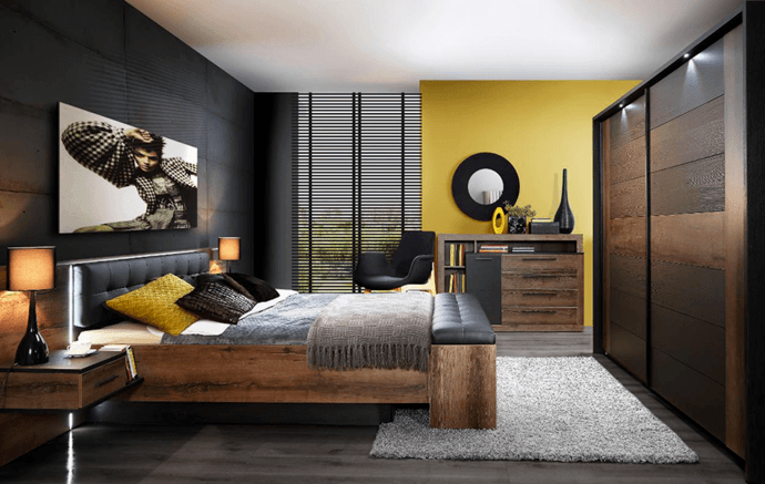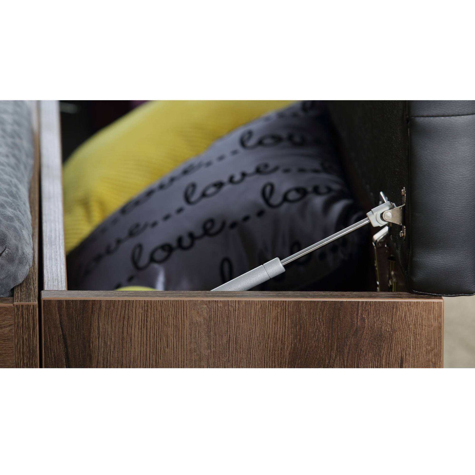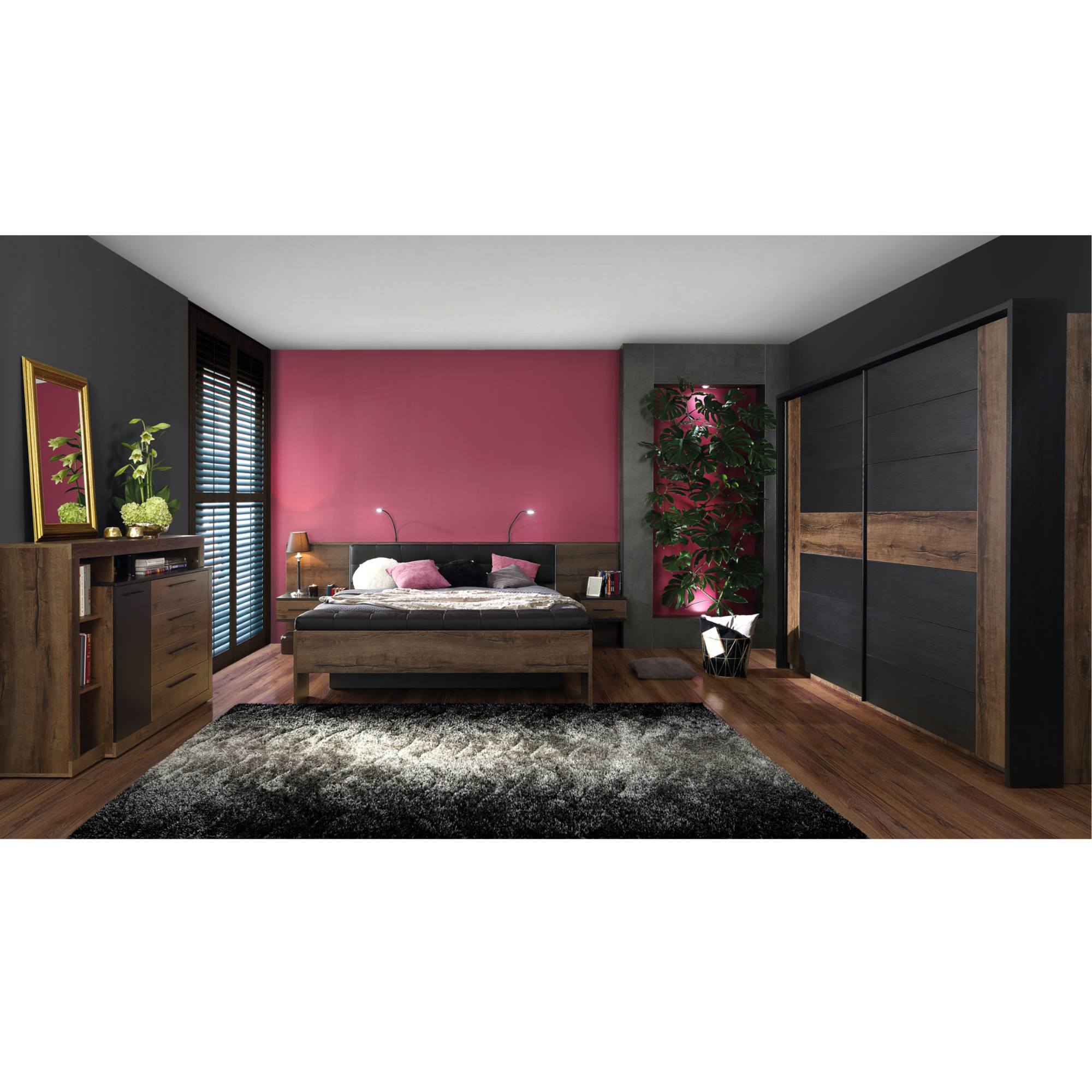 Elegantný posteľový rám BELLEVUE s nočnými stolíkmi a výrazným panelovým čelom vytvára dojem surového dreva. Posteľ je vyrobená z dobre udržiavateľného laminovaného materiálu. Čalúnené čelo z textilnej kože poskytuje oporu chrbtu pri relaxácii. Kombinácia dekoru ušľachtilého duba a duba čierneho dodáva posteli luxusný nádych. Efektné LED osvetlenie je súčasťou balenia. Posteľ je vhodná iba pre lamelové rošty. Ak zvolíte výklopné rošty, môžete využívať úložný priestor v ráme postele.