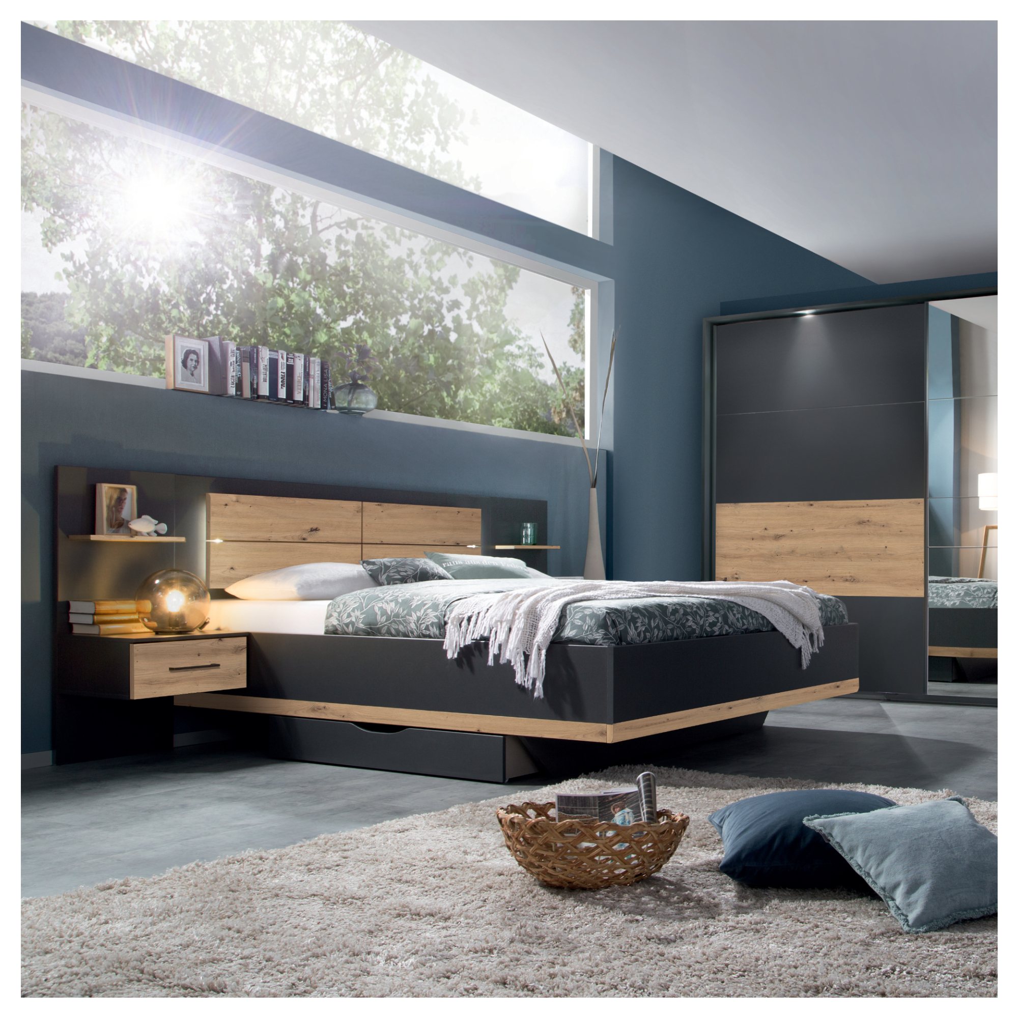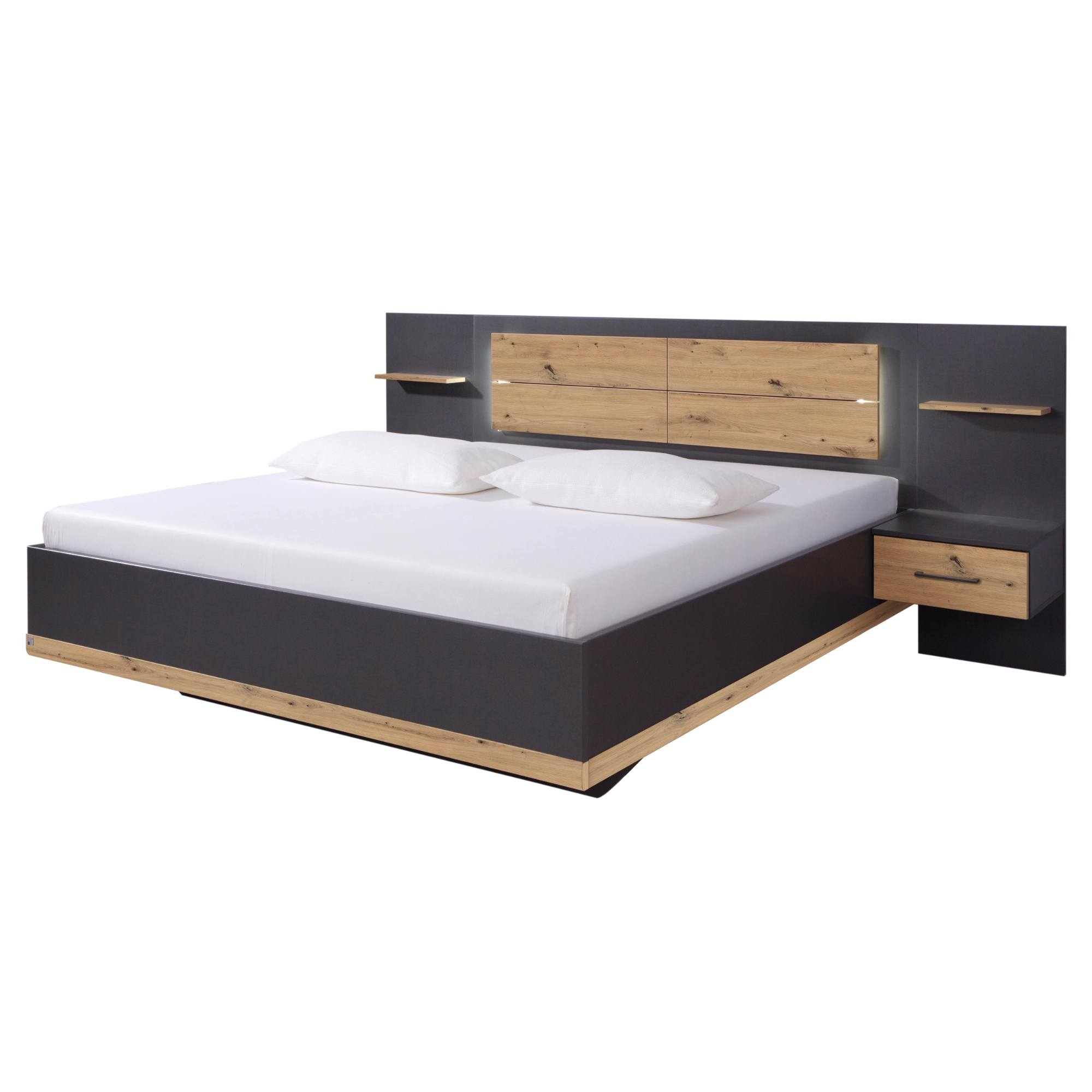 Posteľ s nočnými stolíkmi NEWTON - tmavosivá/dub artisan, 180x200 cm