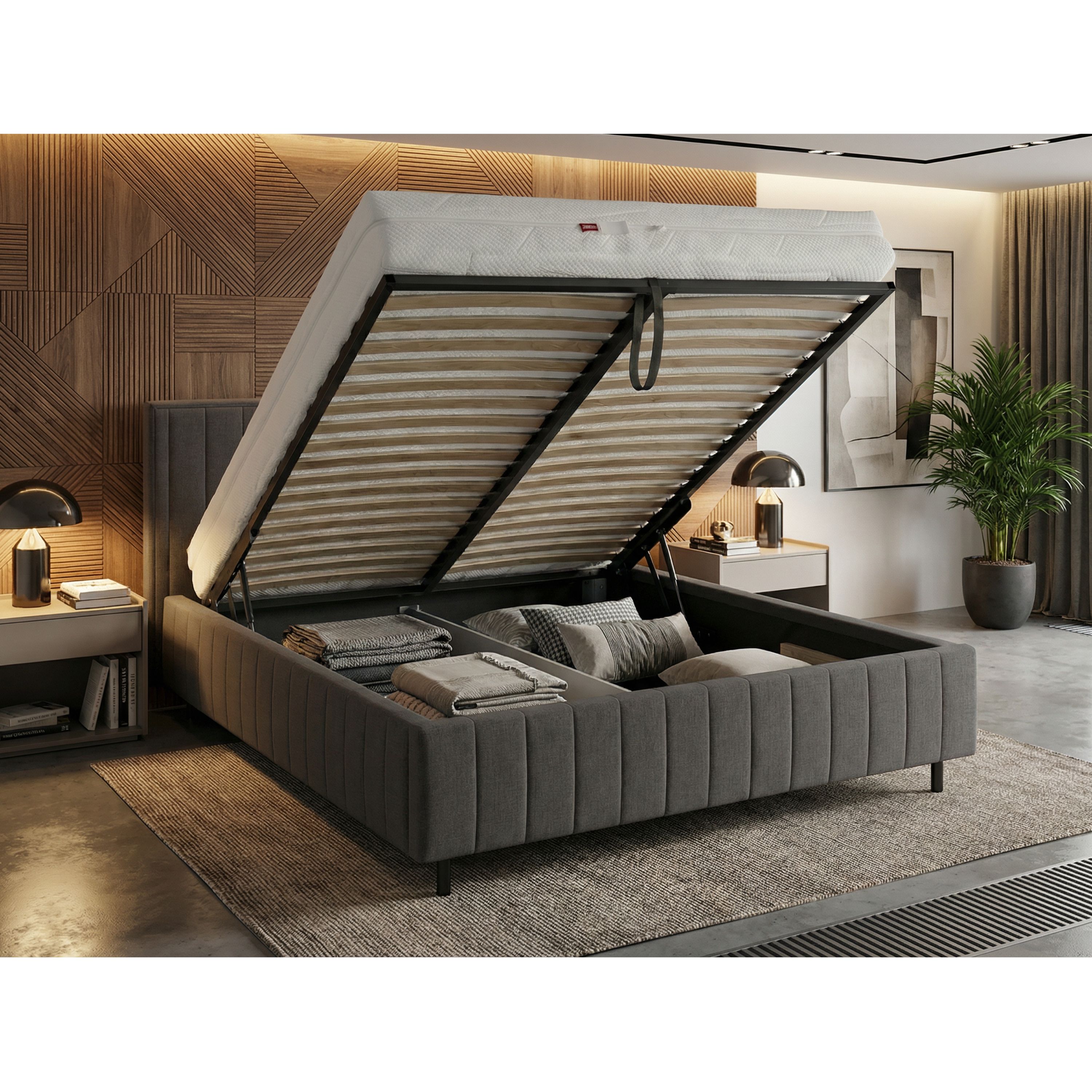 Jej konštrukcia je čalúnená na dotyk príjemnou tkaninou v jednofarebnom prevedení. Vysoké dekoratívne čelo postele umožňuje dopriať si komfortné opretie počas relaxácie. Posteľ je dodávaná vrátane lamelového roštu s čelným výklopom, ktorý umožňuje jednoduchý prístup do úložného priestoru v ráme postele.