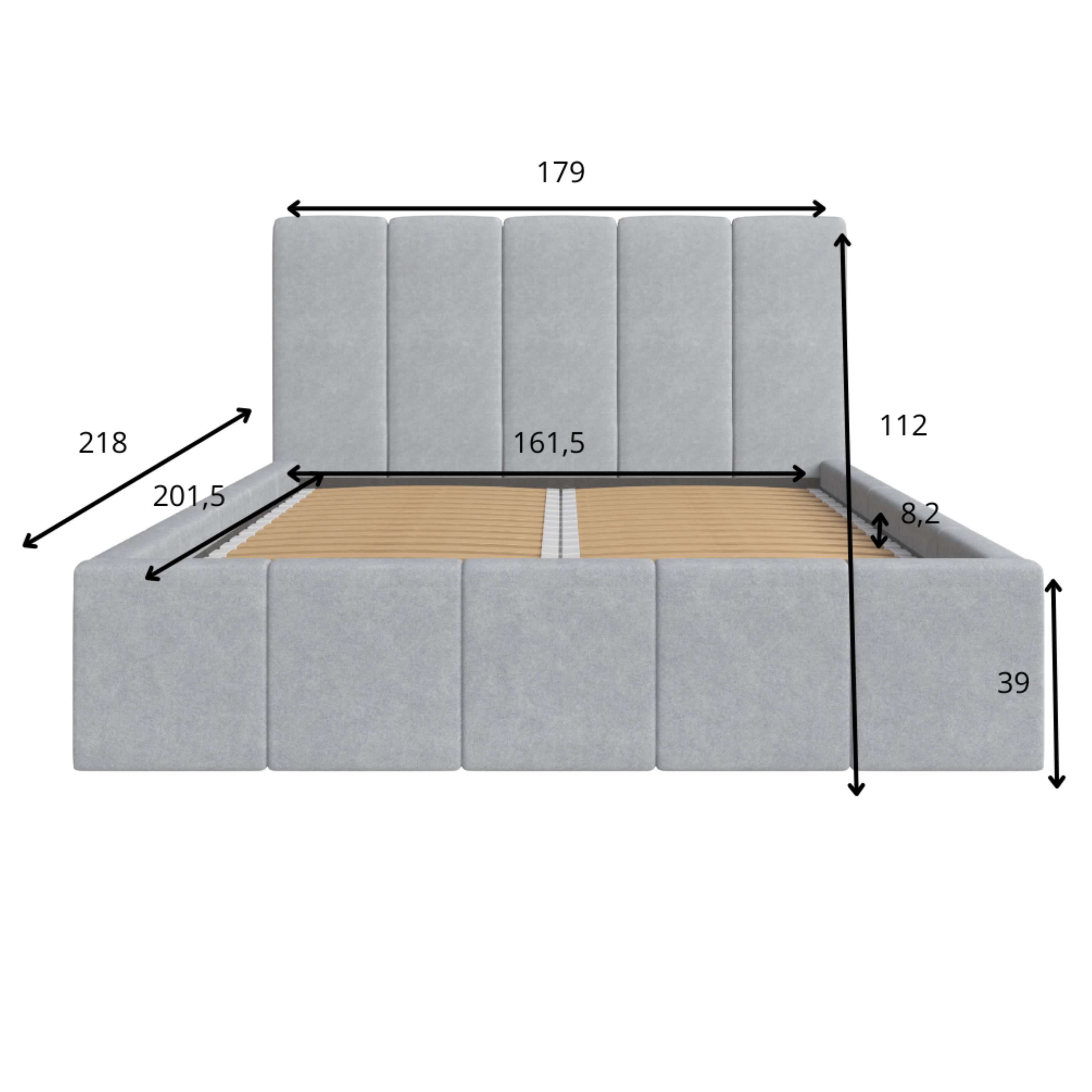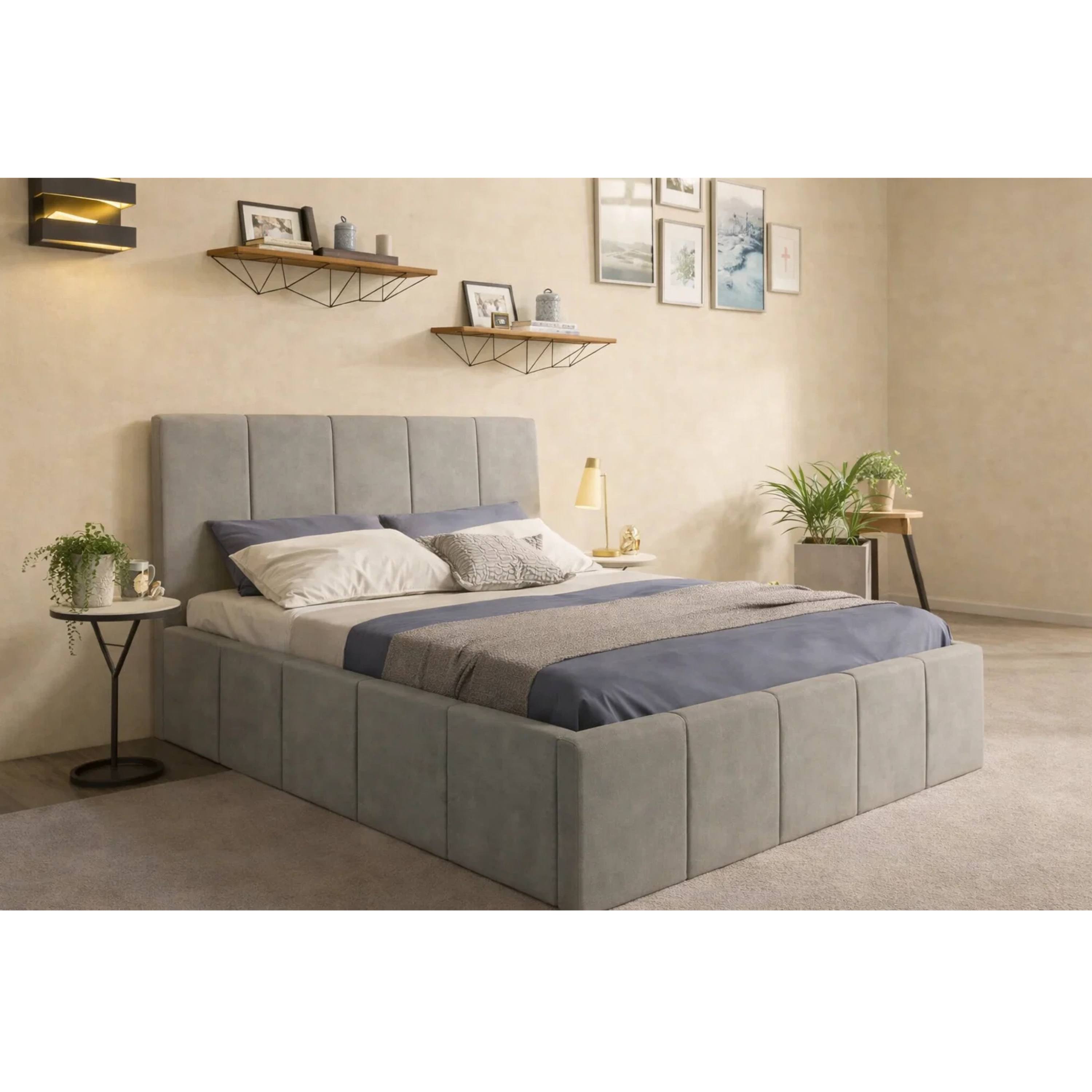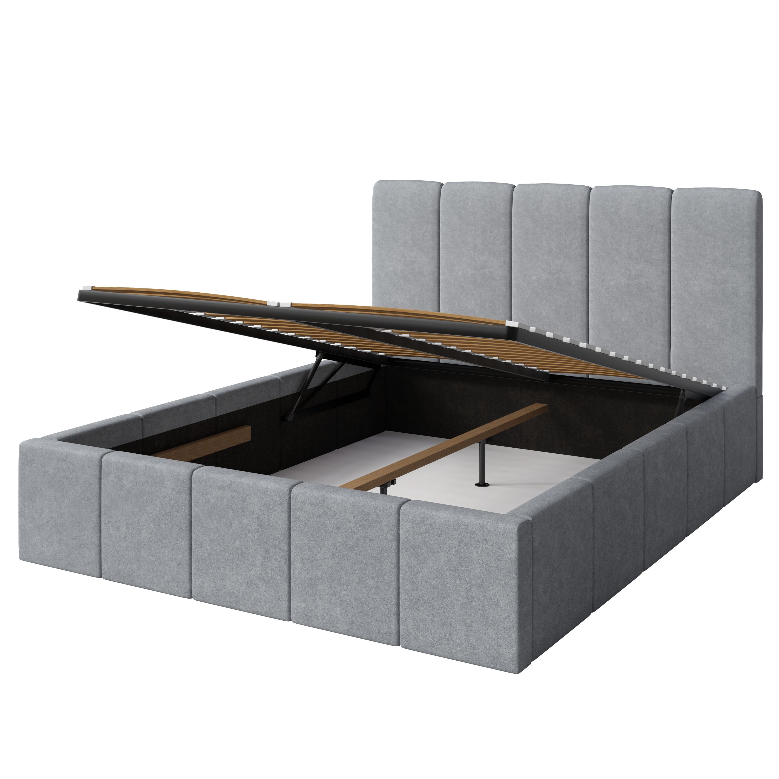 Jej konštrukcia je čalúnená na dotyk príjemnou, mäkkou tkaninou v neutrálnom sivom prevedení, ktoré ľahko zladíte s ďalším vybavením miestnosti. Dominantným prvkom postele je priestranné vysoké čelo, ktoré okrem dekoratívnej funkcie umožňuje aj komfortné opretie hlavy počas relaxácie. Posteľ je dodávaná vrátane lamelového roštu s čelným výklopom, ktorý zabezpečuje jednoduchý prístup do úložného priestoru v ráme postele. Na zabezpečenie potrebnej opory ložnej plochy je navyše posteľ vybavená stredovým nosníkom.