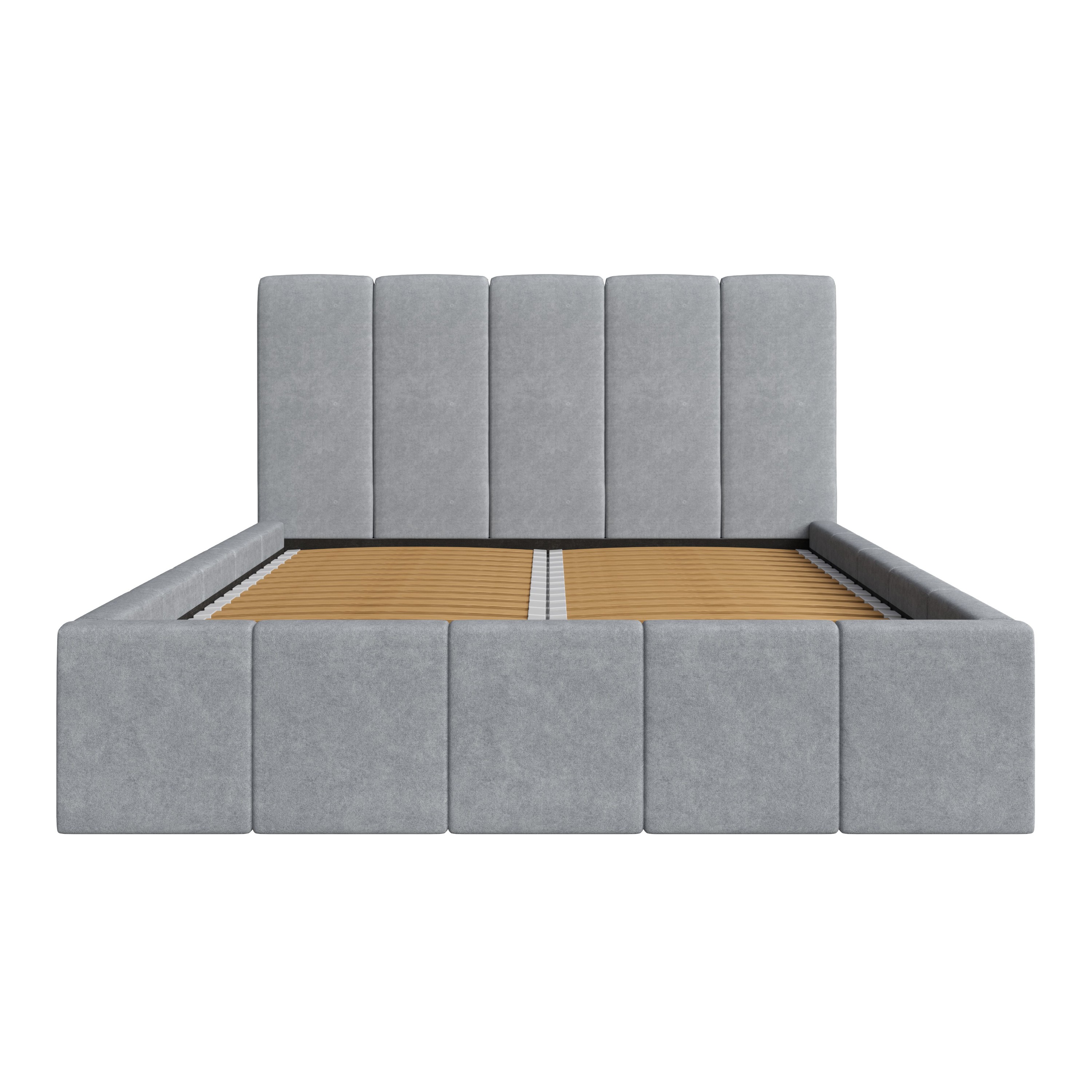 Jej konštrukcia je čalúnená na dotyk príjemnou, mäkkou tkaninou v neutrálnom sivom prevedení, ktoré ľahko zladíte s ďalším vybavením miestnosti. Dominantným prvkom postele je priestranné vysoké čelo, ktoré okrem dekoratívnej funkcie umožňuje aj komfortné opretie hlavy počas relaxácie. Posteľ je dodávaná vrátane lamelového roštu s čelným výklopom, ktorý zabezpečuje jednoduchý prístup do úložného priestoru v ráme postele. Na zabezpečenie potrebnej opory ložnej plochy je navyše posteľ vybavená stredovým nosníkom.