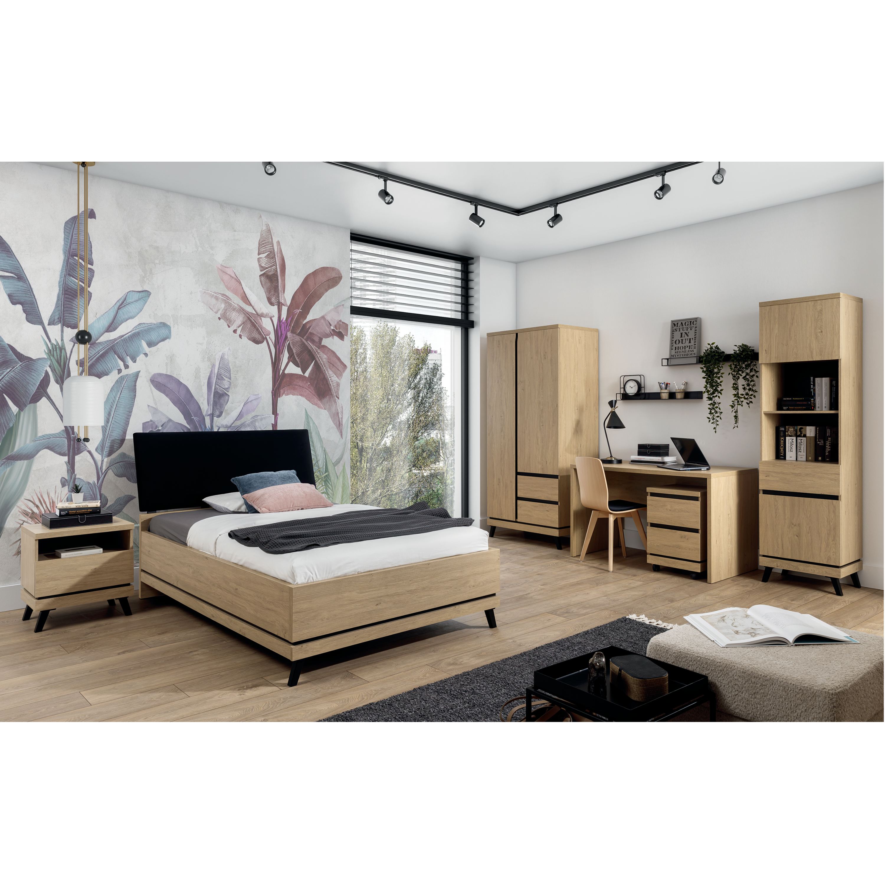 Posteľ ATHEIA AT15-2 v trendovej kombinácii prírodného dubového dekoru a čiernych detailov vytvára ideálny kontrast, ktorý upúta pozornosť a dodá miestnosti elegantný nádych.