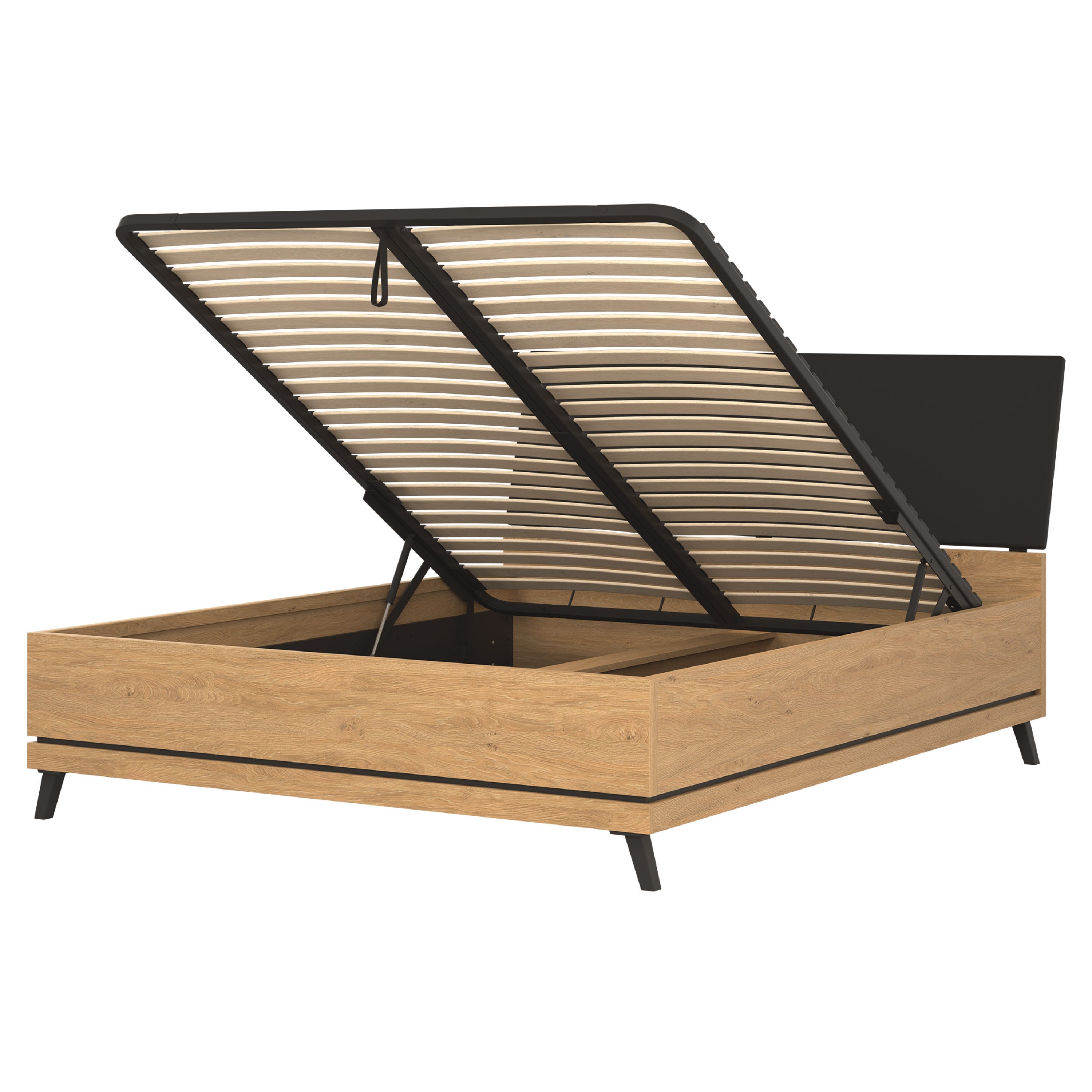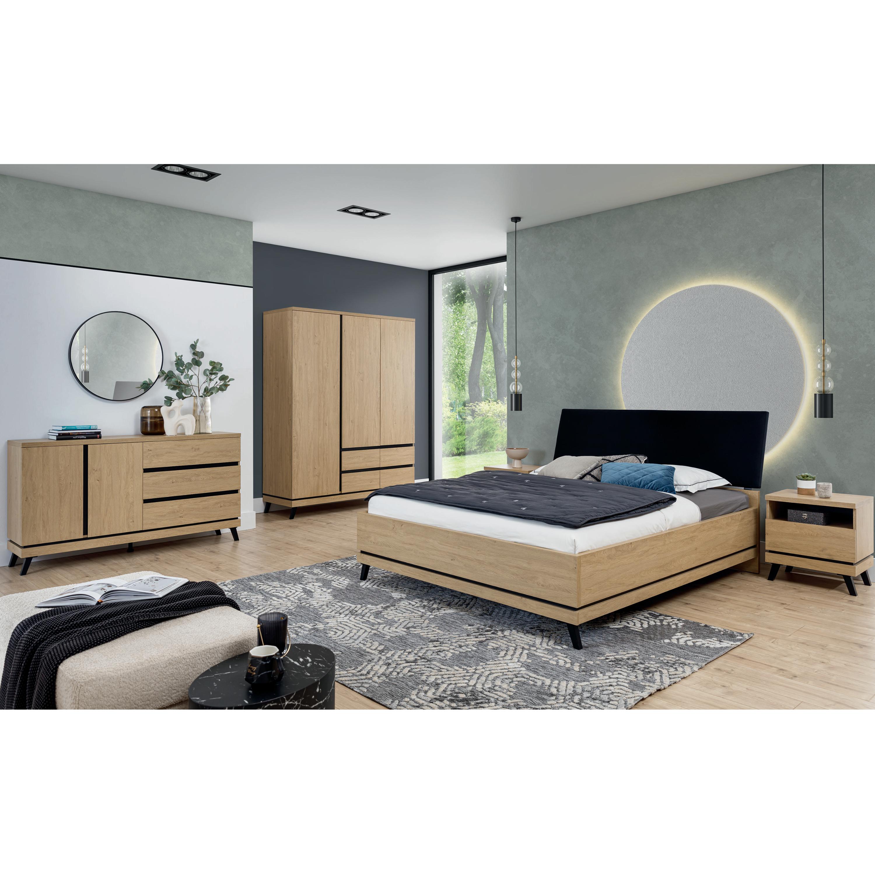 Posteľ ATHEIA AT15 v trendovej kombinácii prírodného dubového dekoru a čiernych detailov vytvára ideálny kontrast, ktorý pritiahne pozornosť a dodá miestnosti elegantný nádych.