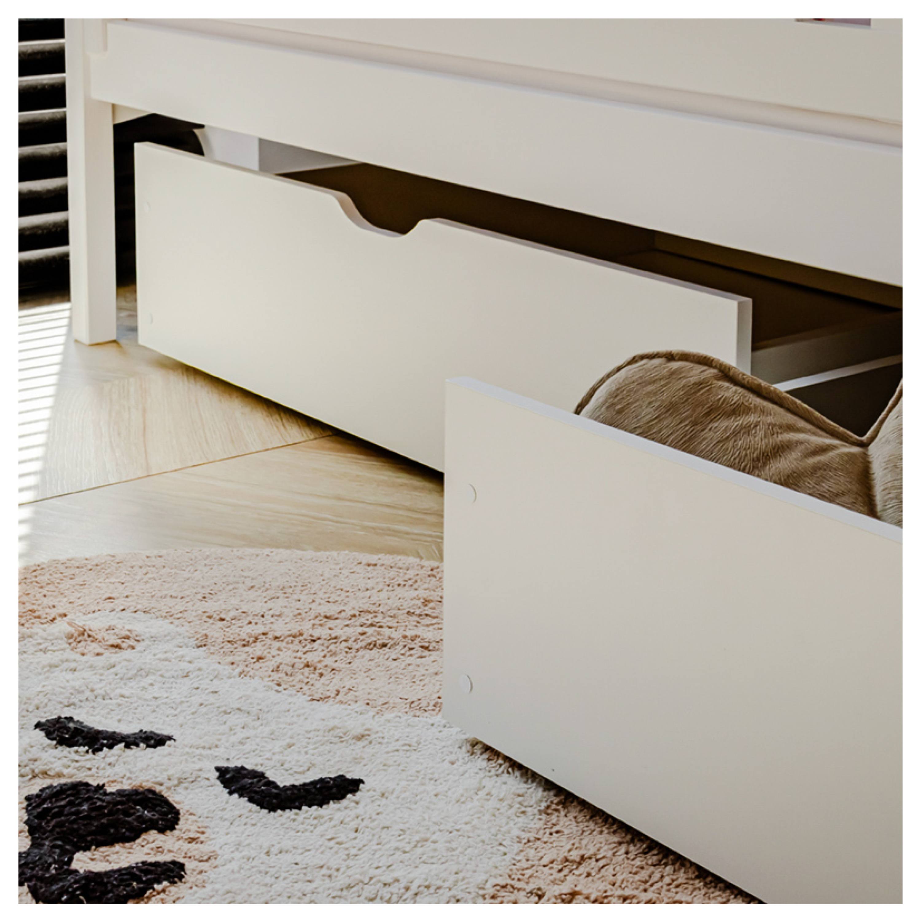 Jej konštrukcia je vyrobená z masívneho borovicového dreva, ktoré zaisťuje vysokú stabilitu a pevnosť. Pre bezpečie vášho dieťaťa je lôžko ohradené bezpečnostnými zábranami, takže je vhodné aj pre mladšie deti. Súčasťou postele je aj praktický úložný priestor v podobe 2 posteľných zásuviek z drevotriesky. Dodávaná je vrátane roštu, ale matrac je nutné dokúpiť samostatne podľa potrieb vašich detí. Odporúčaná výška matraca je maximálne 13 cm.