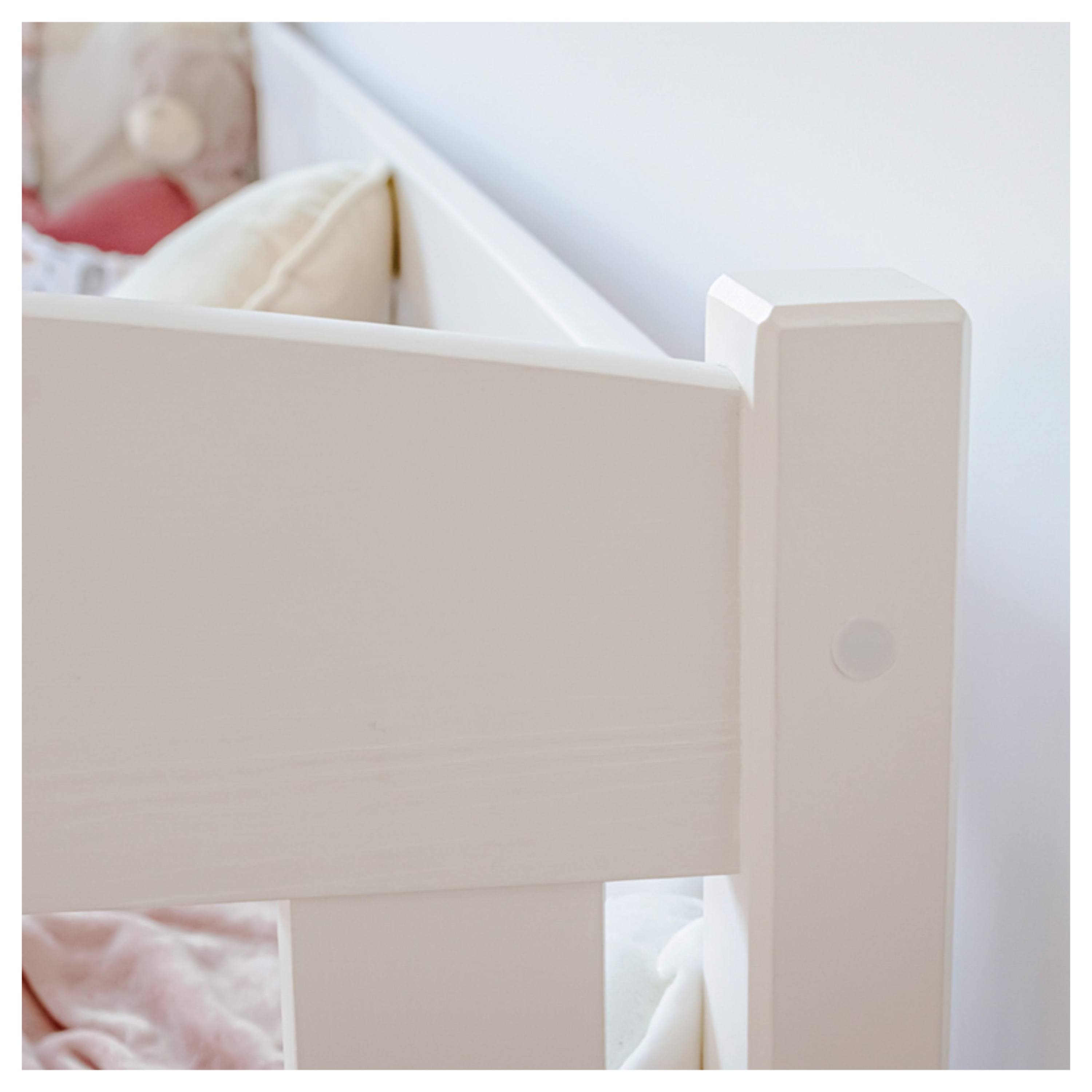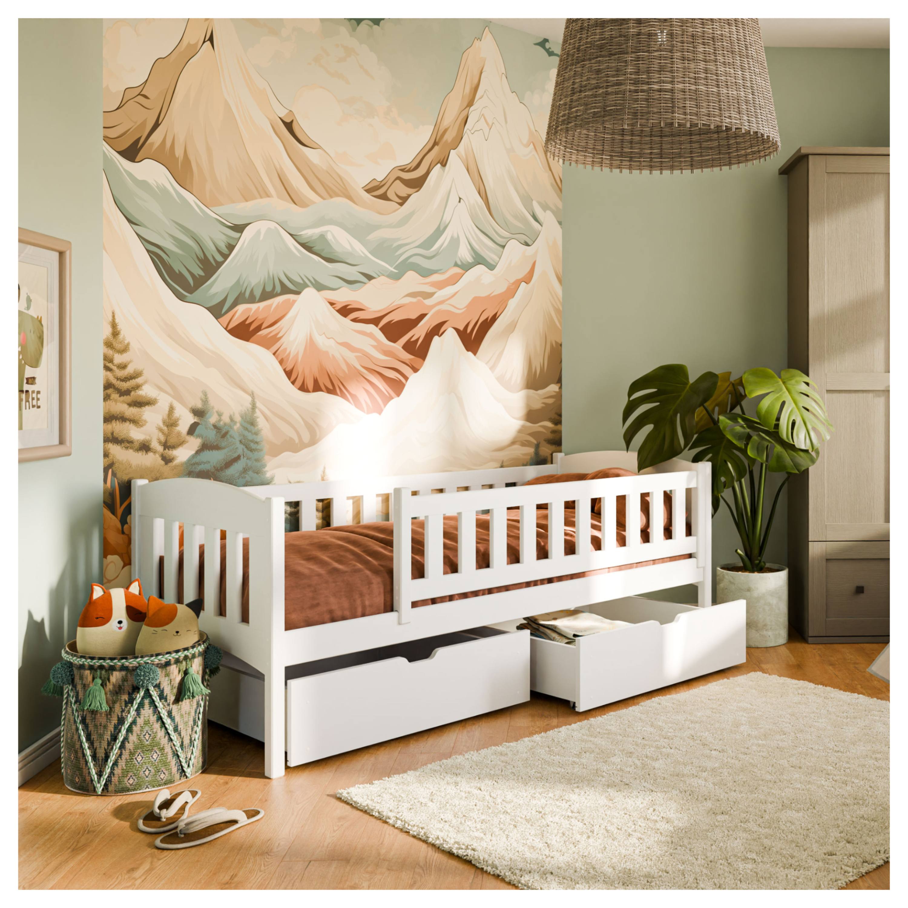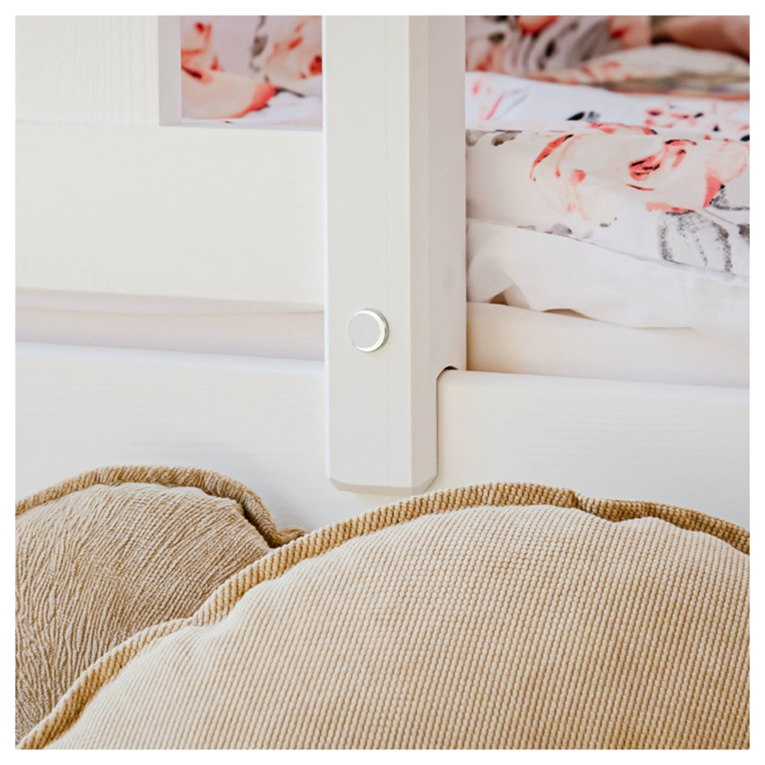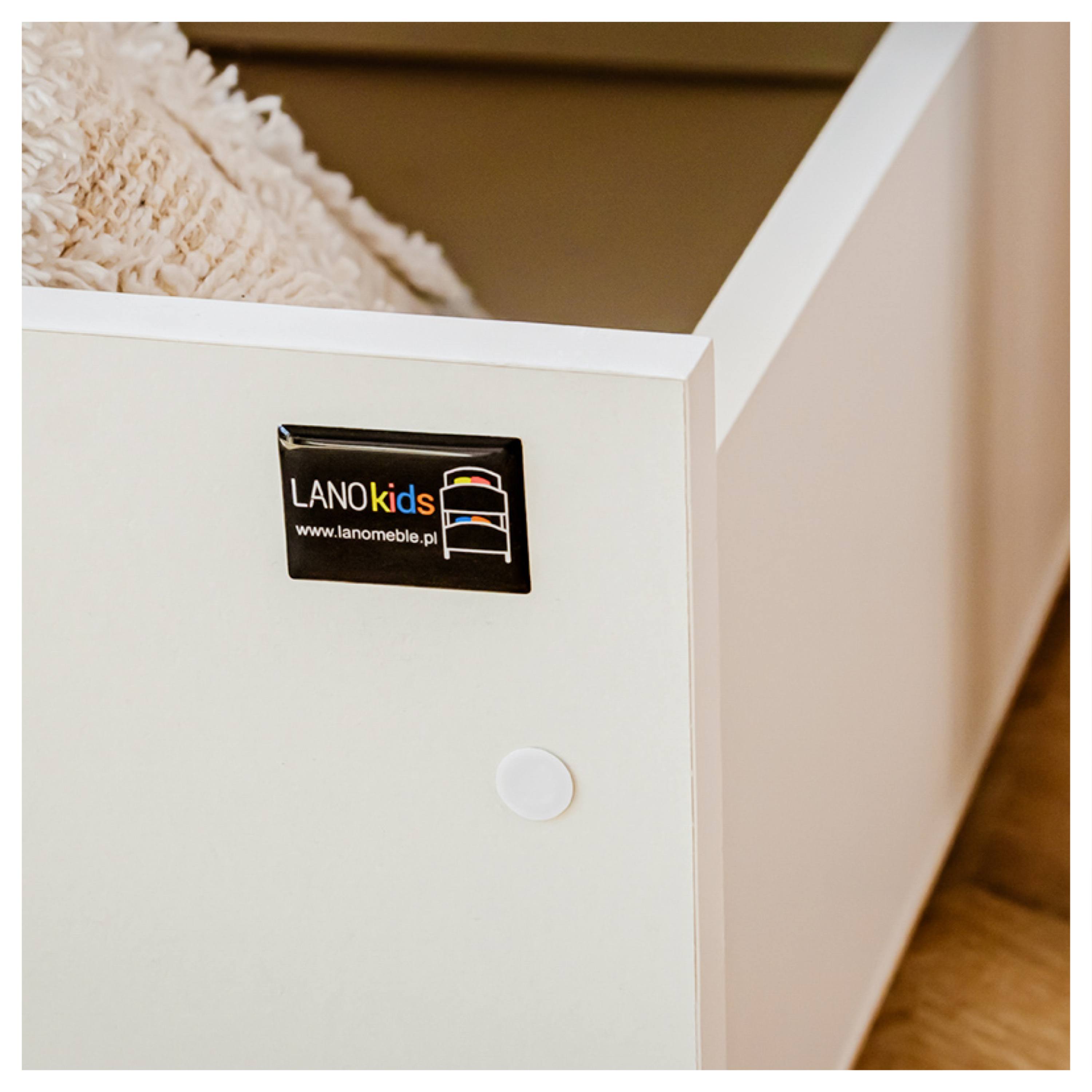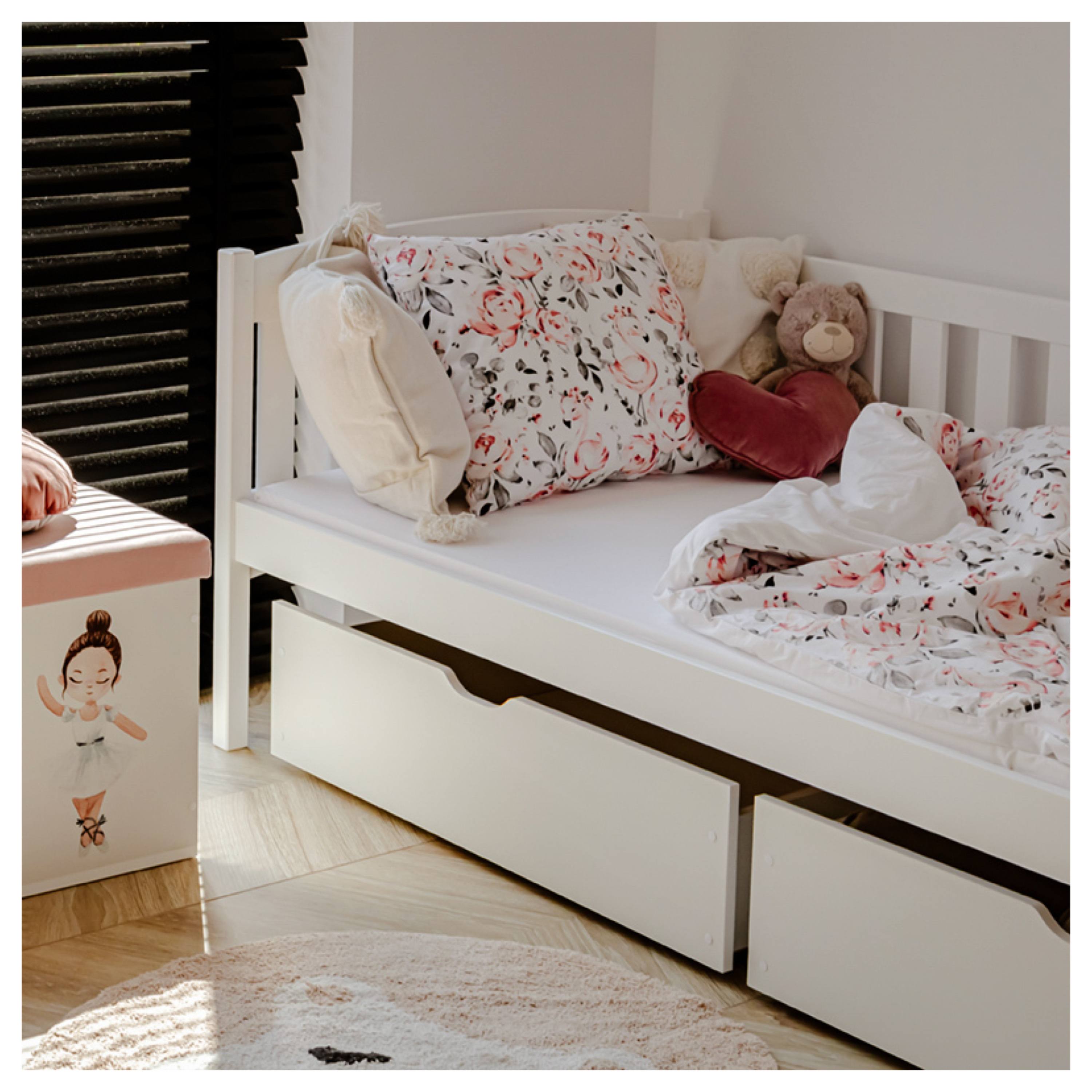 Jej konštrukcia je vyrobená z masívneho borovicového dreva, ktoré zaisťuje vysokú stabilitu a pevnosť. Pre bezpečie vášho dieťaťa je lôžko ohradené bezpečnostnými zábranami, takže je vhodné aj pre mladšie deti. Súčasťou postele je aj praktický úložný priestor v podobe 2 posteľných zásuviek z drevotriesky. Dodávaná je vrátane roštu, ale matrac je nutné dokúpiť samostatne podľa potrieb vašich detí. Odporúčaná výška matraca je maximálne 13 cm.