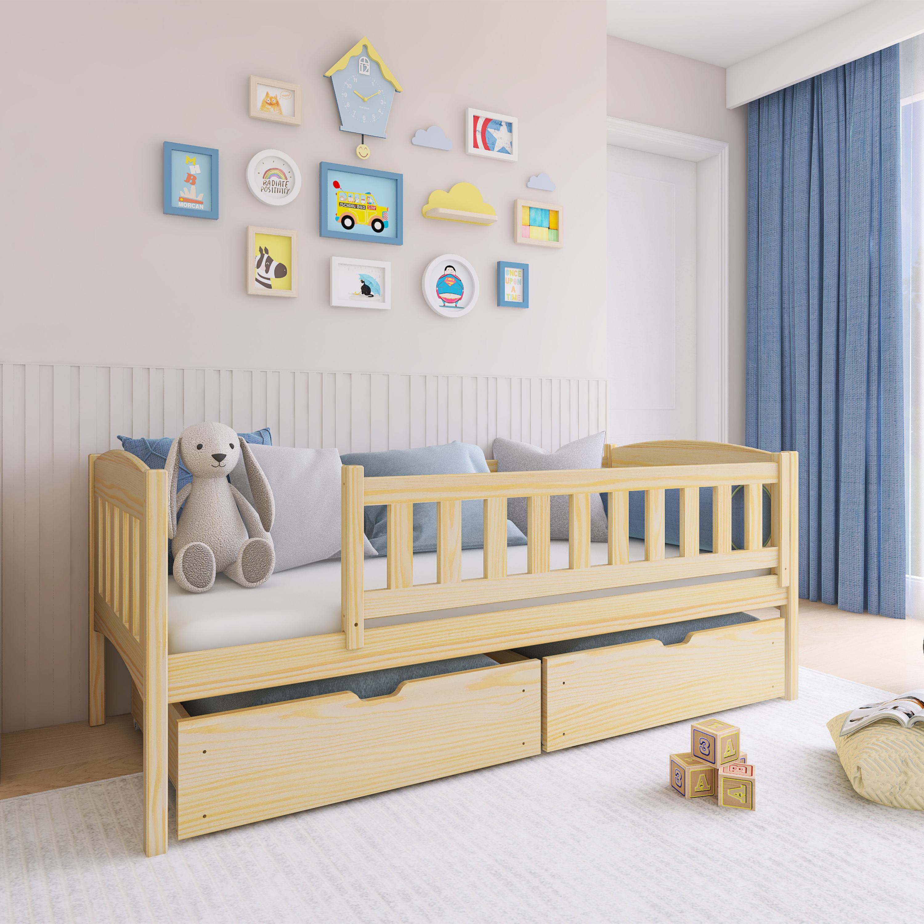 Jej konštrukcia je vyrobená z masívneho borovicového dreva, ktoré zaisťuje vysokú stabilitu a pevnosť. Pre bezpečie vášho dieťaťa je lôžko ohradené bezpečnostnými zábranami, takže je vhodné aj pre mladšie deti. Súčasťou postele je aj praktický úložný priestor v podobe 2 posteľných zásuviek z drevotriesky. Dodávaná je vrátane roštu, ale matrac je nutné dokúpiť samostatne podľa potrieb vašich detí. Odporúčaná výška matraca je maximálne 13 cm.
