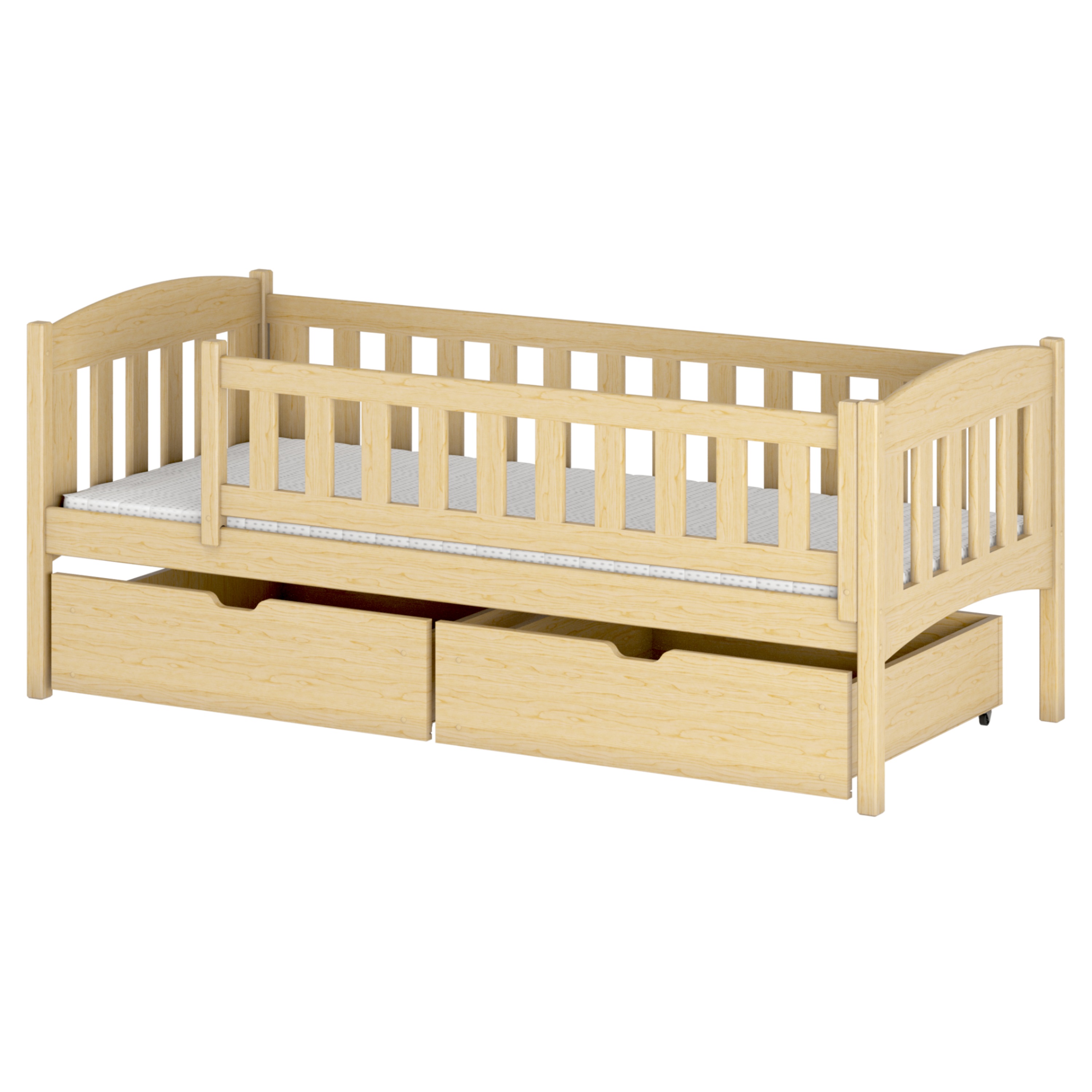 Jej konštrukcia je vyrobená z masívneho borovicového dreva, ktoré zaisťuje vysokú stabilitu a pevnosť. Pre bezpečie vášho dieťaťa je lôžko ohradené bezpečnostnými zábranami, takže je vhodné aj pre mladšie deti. Súčasťou postele je aj praktický úložný priestor v podobe 2 posteľných zásuviek z drevotriesky. Dodávaná je vrátane roštu, ale matrac je nutné dokúpiť samostatne podľa potrieb vašich detí. Odporúčaná výška matraca je maximálne 13 cm.