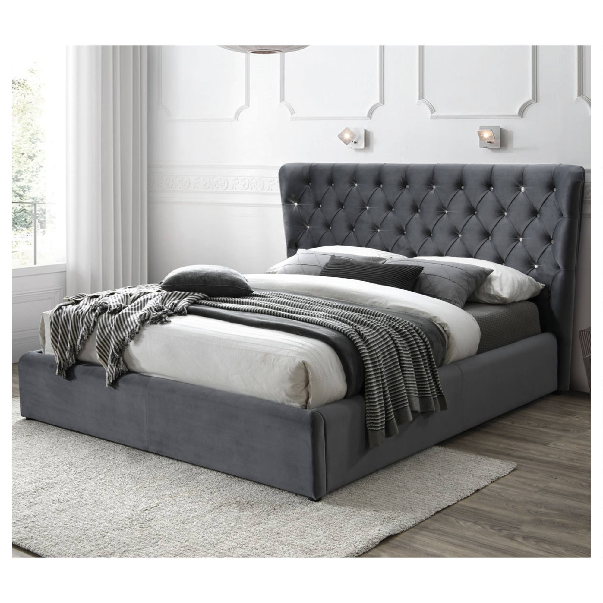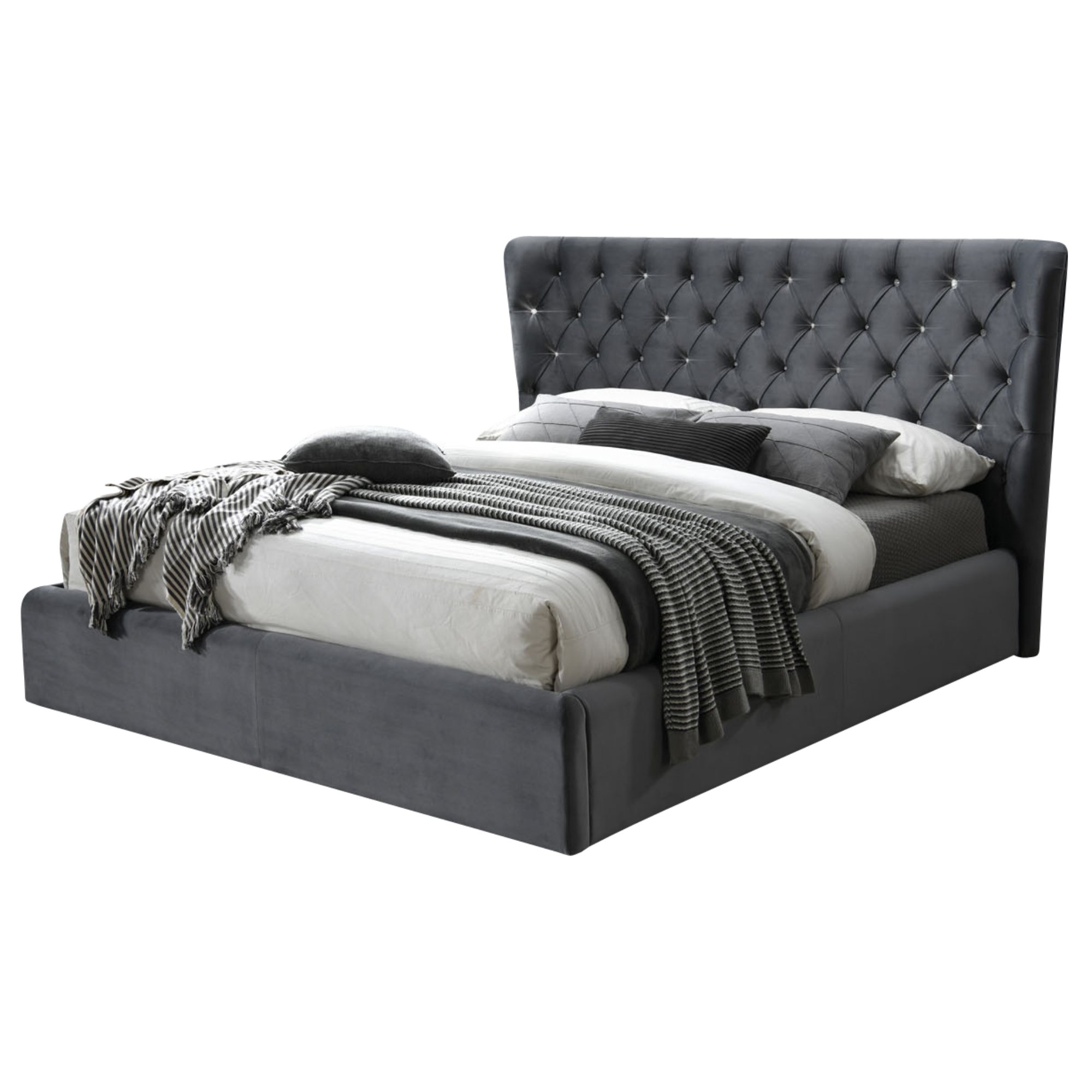 Konštrukcia je potiahnutá hladkou tkaninou zamatového vzhľadu, ktorá je vyrobená zo 100% polyesteru. Vďaka vysokému čelu sa môžete pohodlne oprieť pri čítaní obľúbenej knihy či sledovaní filmu. Poťah je v oblasti priestranného čela doplnený o výrazné prešívanie a dekoratívne gombíky. Posteľ je na každej strane vybavená kvalitným lamelovým roštom, ale matrac je nutné dokúpiť samostatne. Konštrukcia je navyše doplnená o stredový nosník pre ešte väčšiu pevnosť a vyššiu nosnosť.