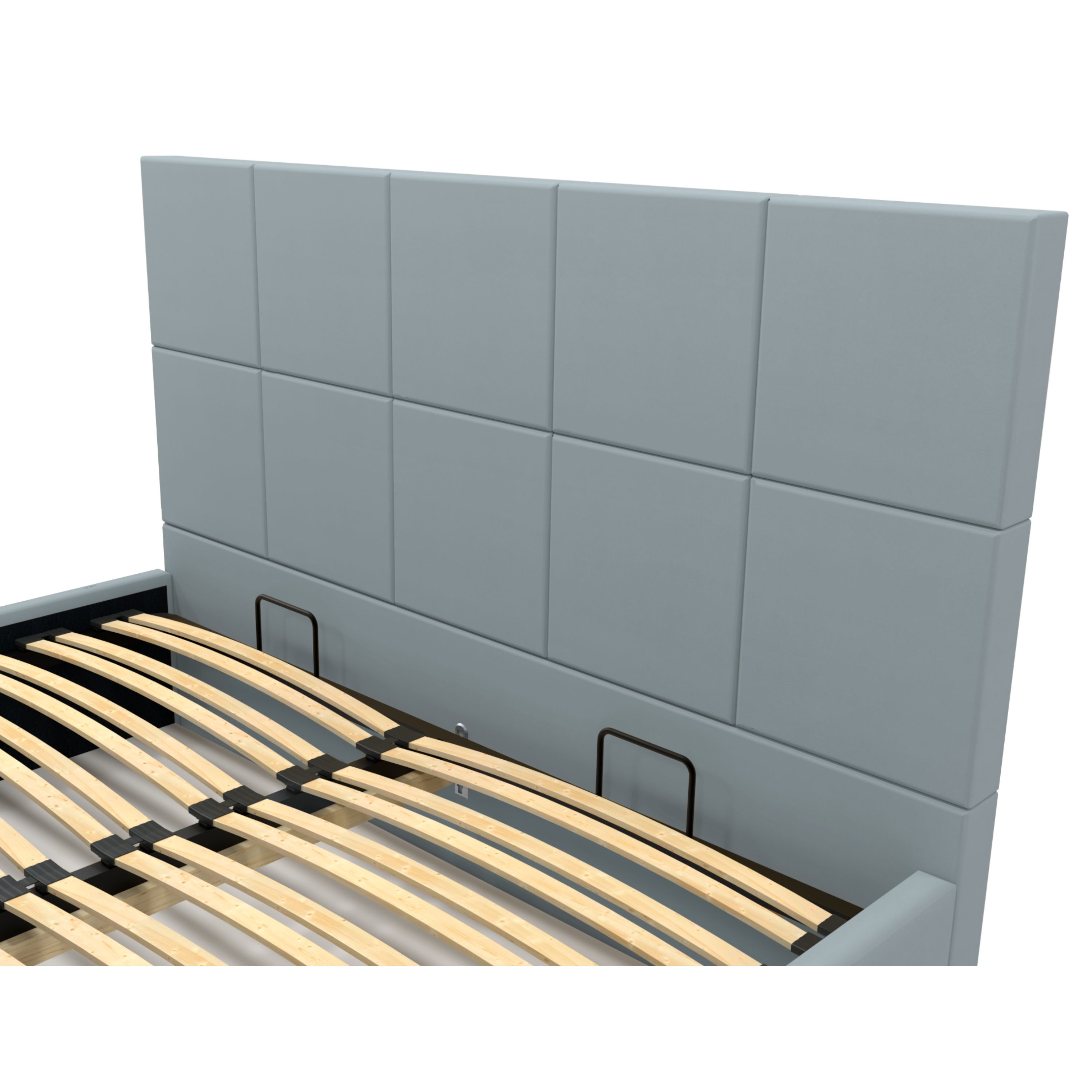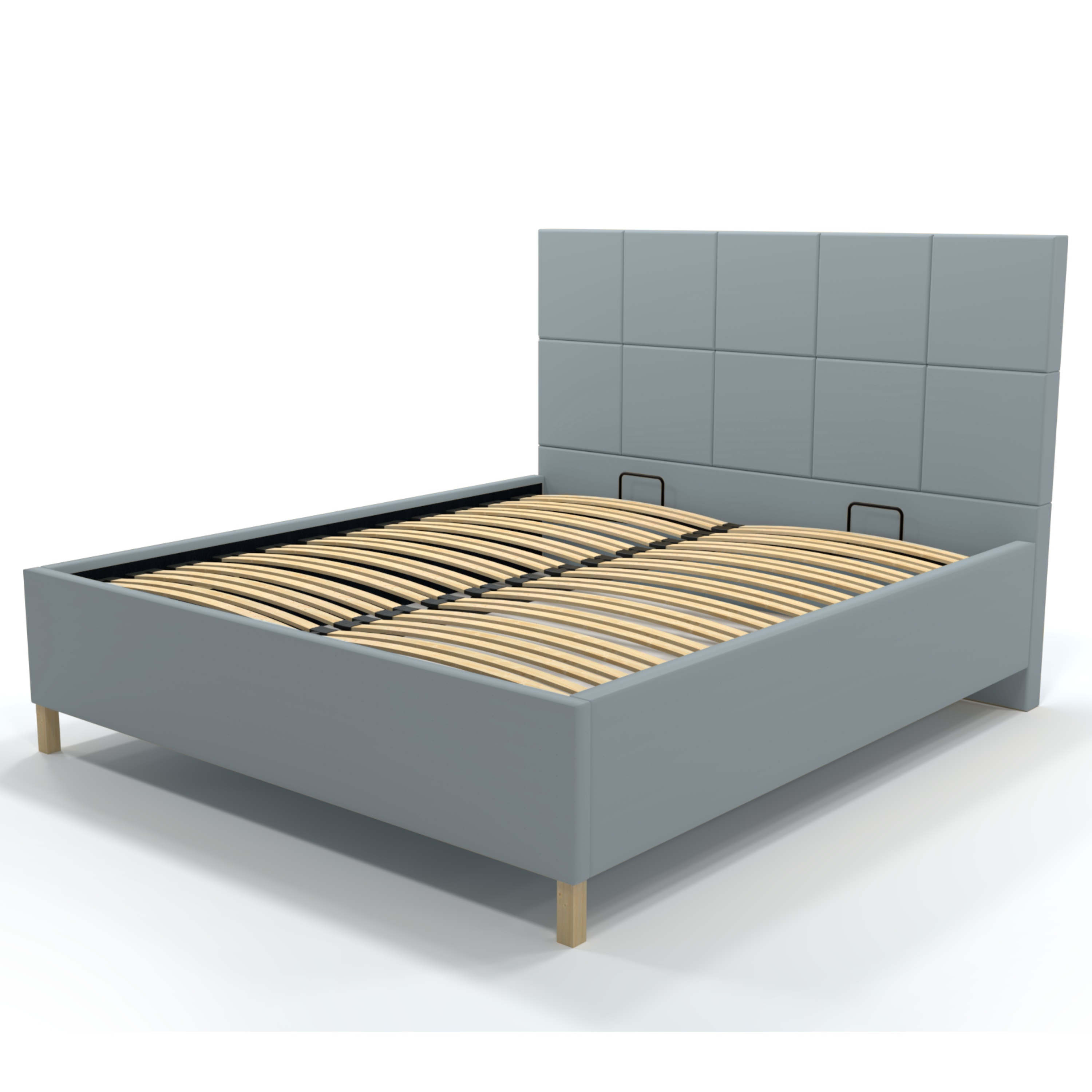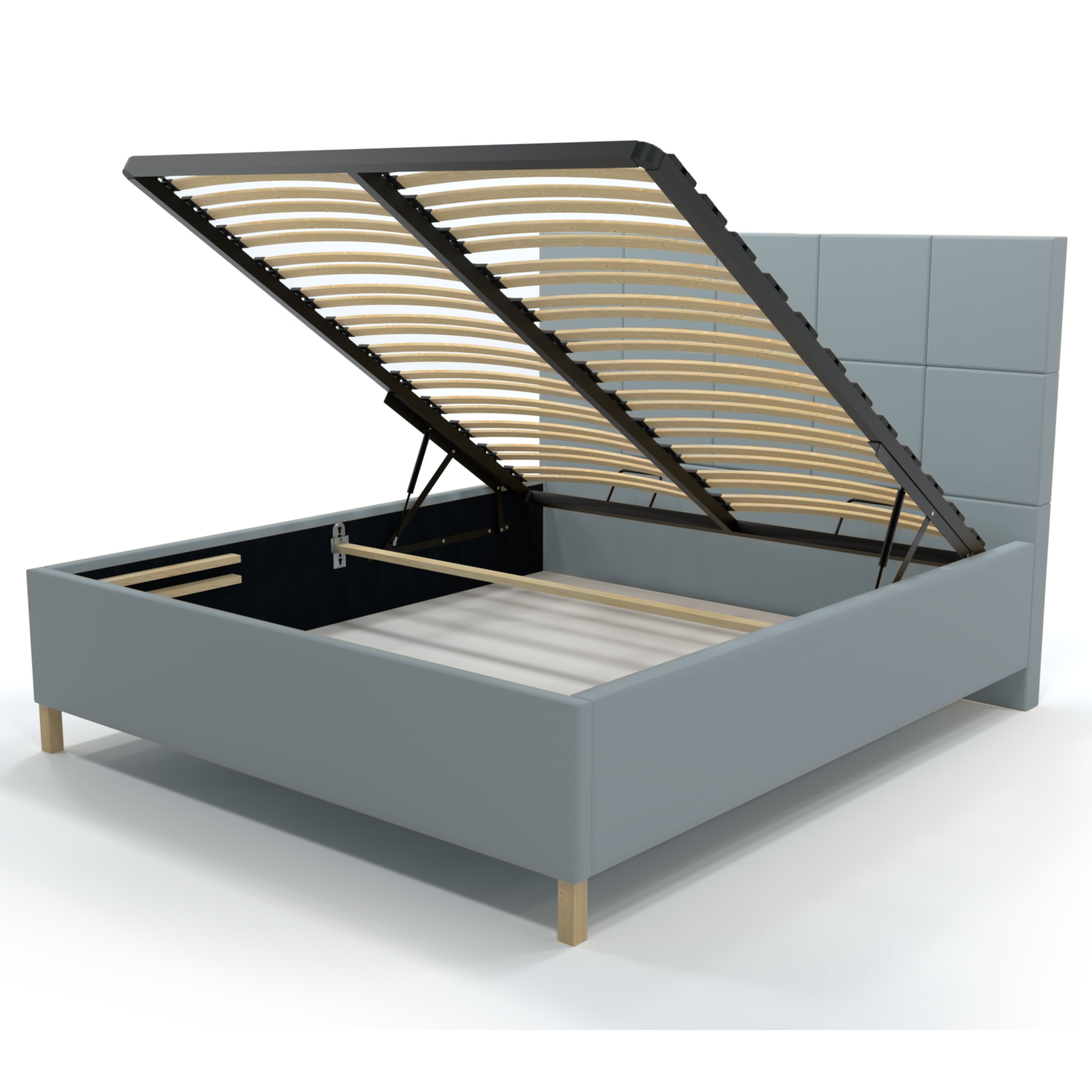 Dominantným prvkom postele je vysoké čelo, ktoré okrem estetickej funkcie umožňuje dopriať si komfortné opretie počas relaxu. Posteľ je dodávaná vrátane lamelového roštu osadeného v kovovom ráme. Čelný výklop potom umožňuje jednoduchý prístup do úložného priestoru pod ložnou plochou. Celkový vzhľad dopĺňajú drevené nožičky v prírodnom odtieni.