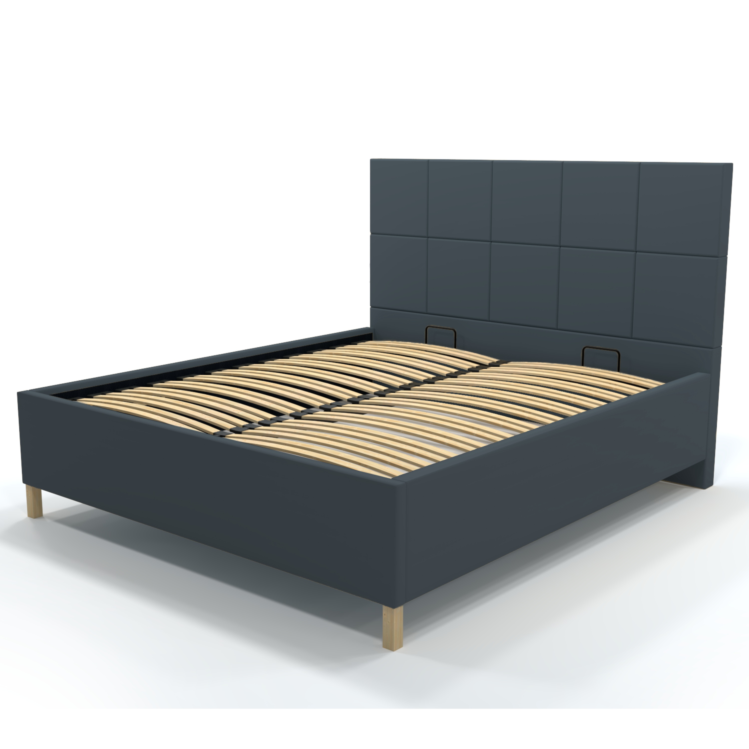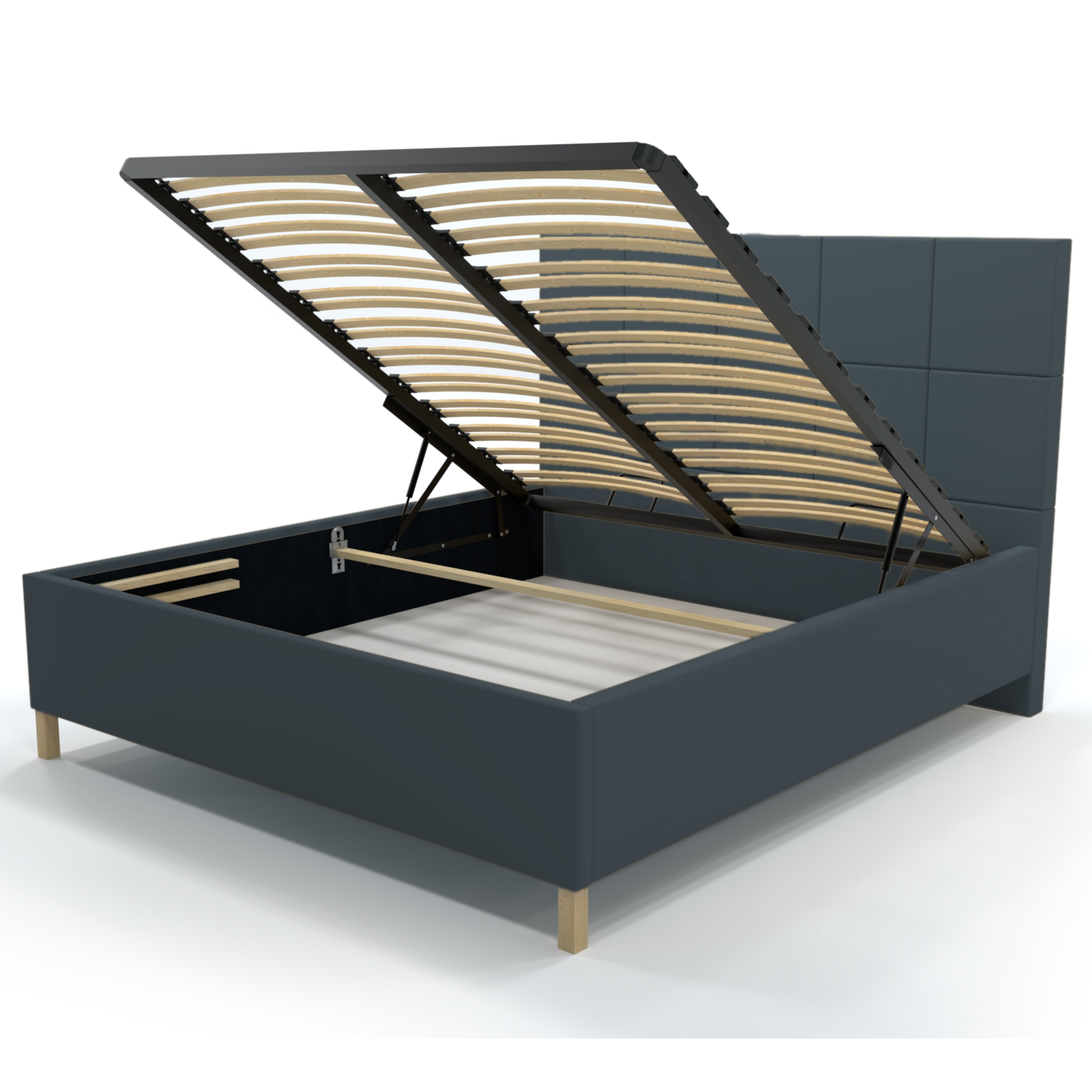 Dominantným prvkom postele je vysoké čelo, ktoré okrem estetickej funkcie umožňuje dopriať si komfortné opretie počas relaxu. Posteľ je dodávaná vrátane lamelového roštu osadeného v kovovom ráme. Čelný výklop potom umožňuje jednoduchý prístup do úložného priestoru pod ložnou plochou. Celkový vzhľad dopĺňajú drevené nožičky v prírodnom odtieni.