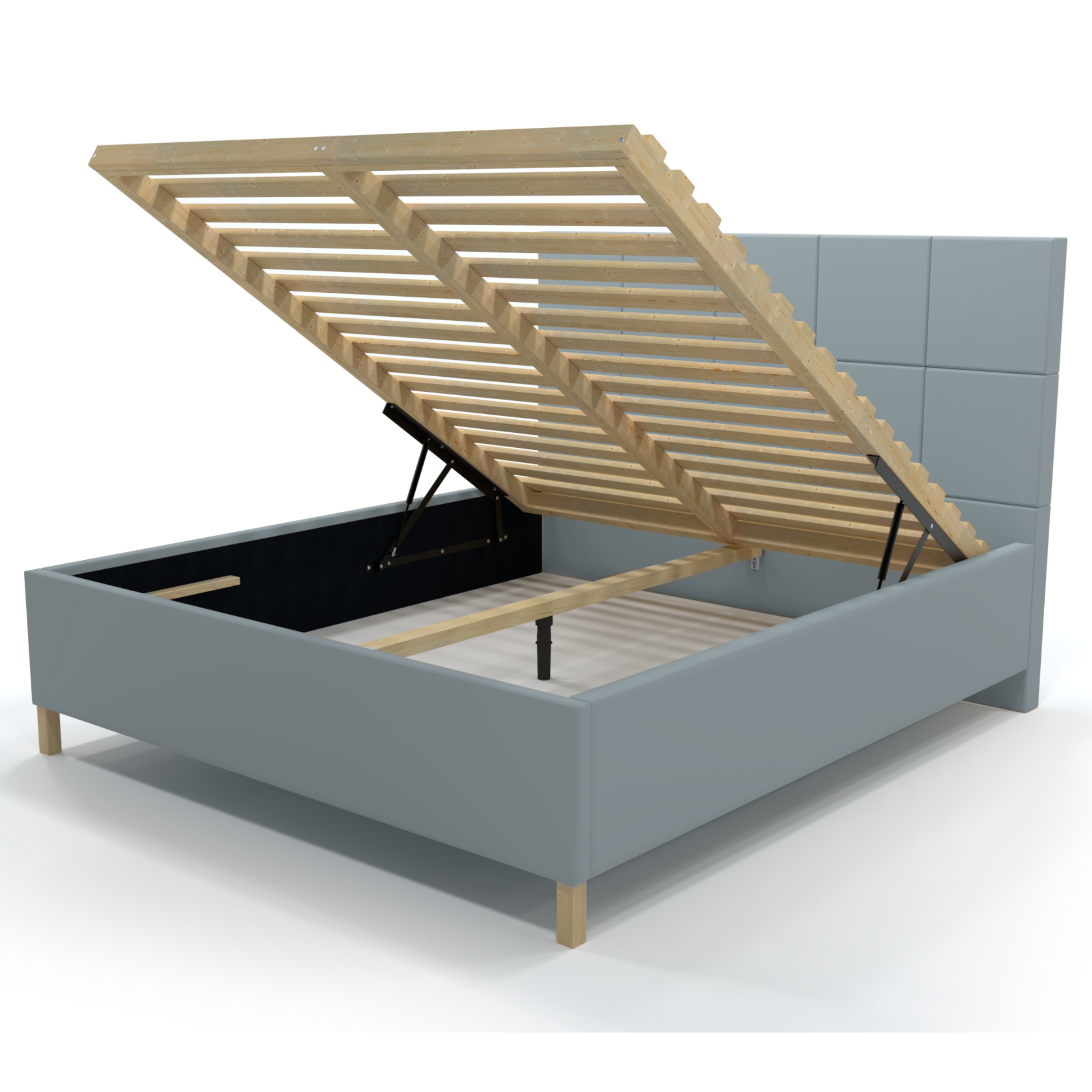Dominantným prvkom postele je vysoké čelo, ktoré okrem estetickej funkcie umožňuje dopriať si komfortné opretie počas relaxu. Posteľ je dodávaná vrátane latkového roštu osadeného v drevenom ráme. Čelný výklop potom umožňuje jednoduchý prístup do úložného priestoru pod ložnou plochou. Celkový vzhľad dopĺňajú drevené nožičky v prírodnom odtieni.