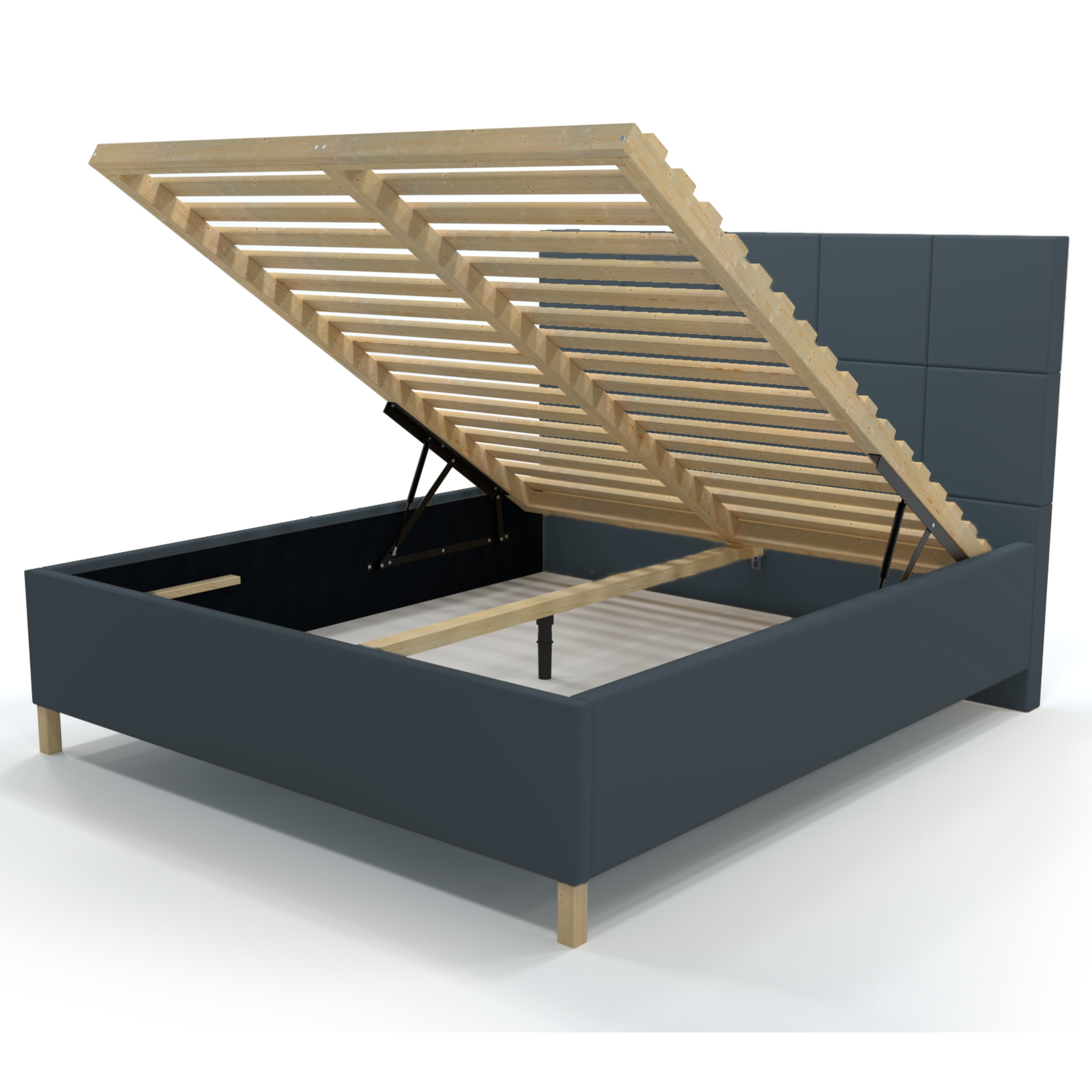 Dominantným prvkom postele je vysoké čelo, ktoré okrem estetickej funkcie umožňuje dopriať si komfortné opretie počas relaxu. Posteľ je dodávaná vrátane latkového roštu osadeného v drevenom ráme. Čelný výklop potom umožňuje jednoduchý prístup do úložného priestoru pod ložnou plochou. Celkový vzhľad dopĺňajú drevené nožičky v prírodnom odtieni.