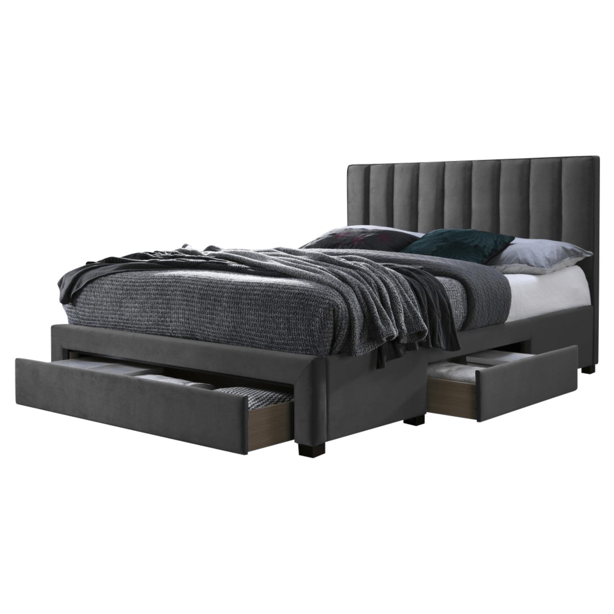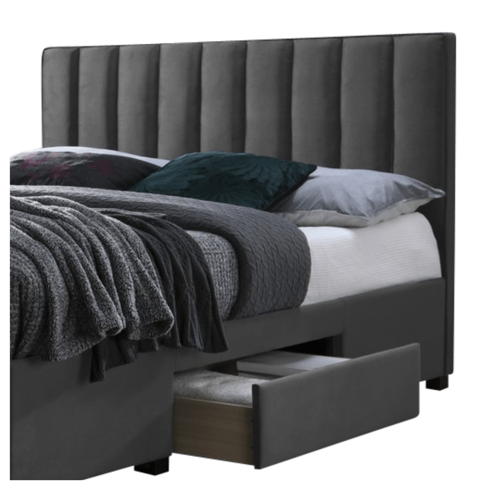Vyrobená je z masívneho kaučukového dreva, ktoré posteli dodáva pevnosť, odolnosť a zvyšuje jej nosnosť. Konštrukcia je potiahnutá hladkou látkou so zamatovým vzhľadom, ktorá je veľmi príjemná na dotyk s pokožkou. Rovnakým materiálom je potiahnuté aj vysoké čelo s výrazným, ozdobným prešívaním. Čelo poskytuje priestor na pohodlné oprenie, chráni stenu pred odreninami a zašpinením a zároveň slúži ako dekoratívny prvok. Prednosťou postele je tiež členený zásuvkový úložný priestor, kam môžete pohodlne uložiť posteľnú bielizeň alebo sezónne predmety.