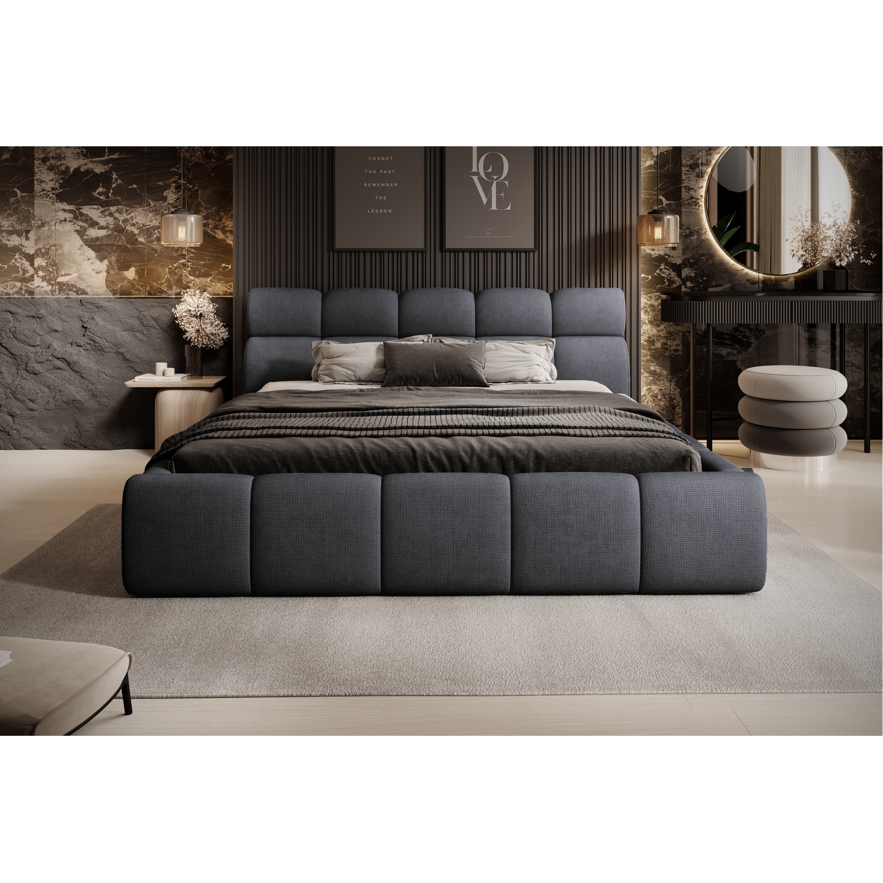 Jej konštrukcia je čalúnená na dotyk príjemnou tkanou látkou v jednofarebnom prevedení. Poťah doplnený o výrazné dekoratívne prešívanie dodáva posteli eleganciu a dotvára jej celkový vzhľad. Vysoké čelo postele s polstrovaním z polyuretánovej peny umožňuje dopriať si komfortné opretie počas relaxu.