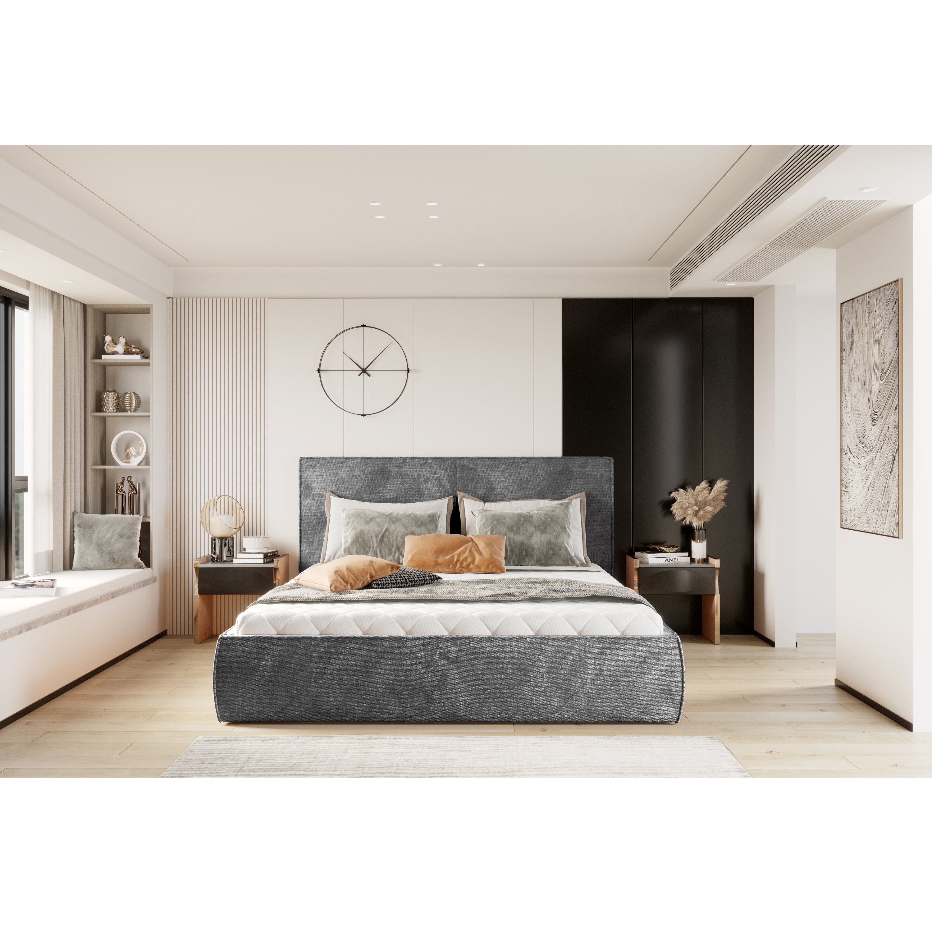 Jej drevená konštrukcia je čalúnená na dotyk príjemnou tkaninou zamatového typu s viditeľnou štruktúrou. Zadná strana postele však nie je potiahnutá. Posteľ je vybavená vysokým čelom, ktoré poslúži ako ideálna opora hlavy počas relaxu. Korpus je doplnený aj o drobné plastové nožičky.