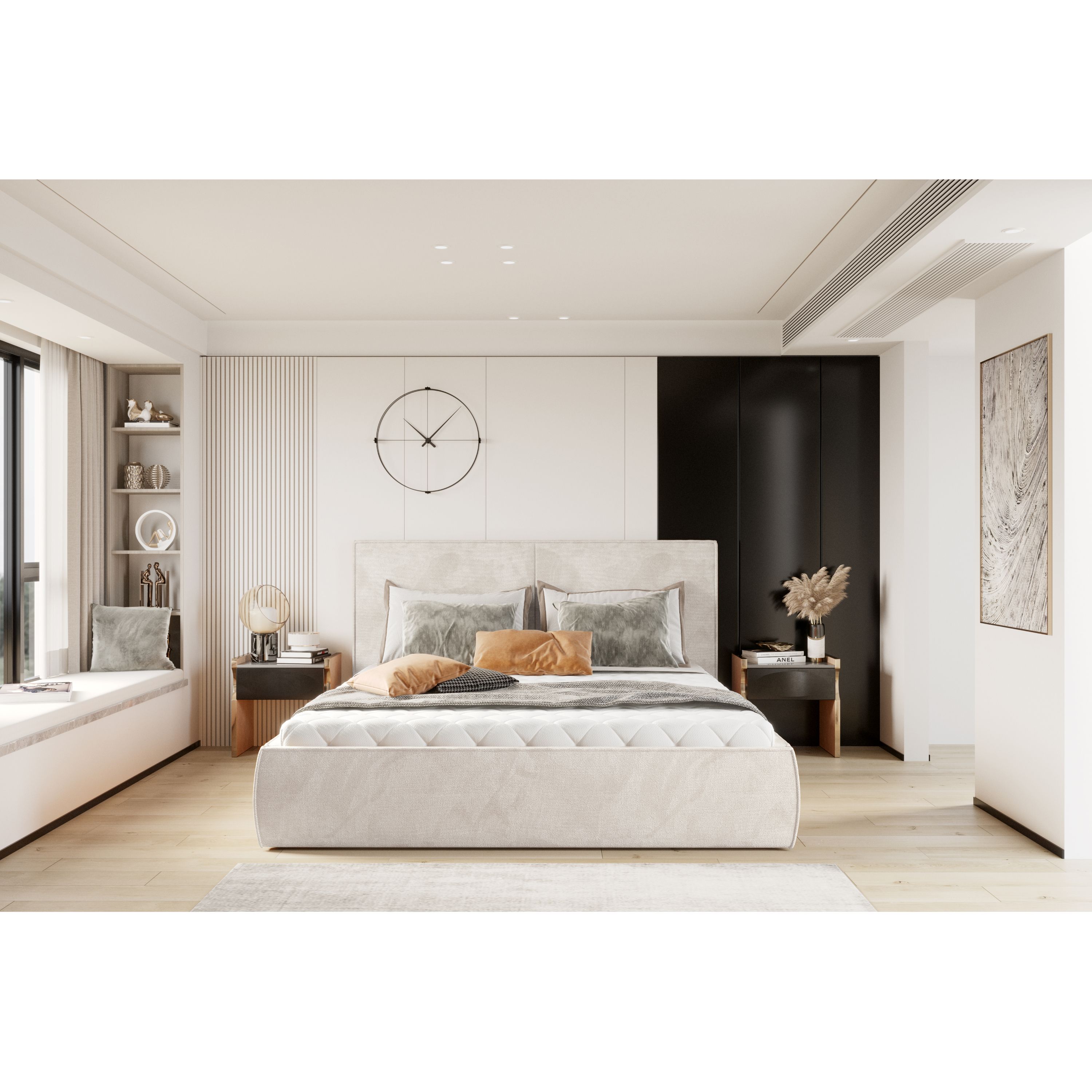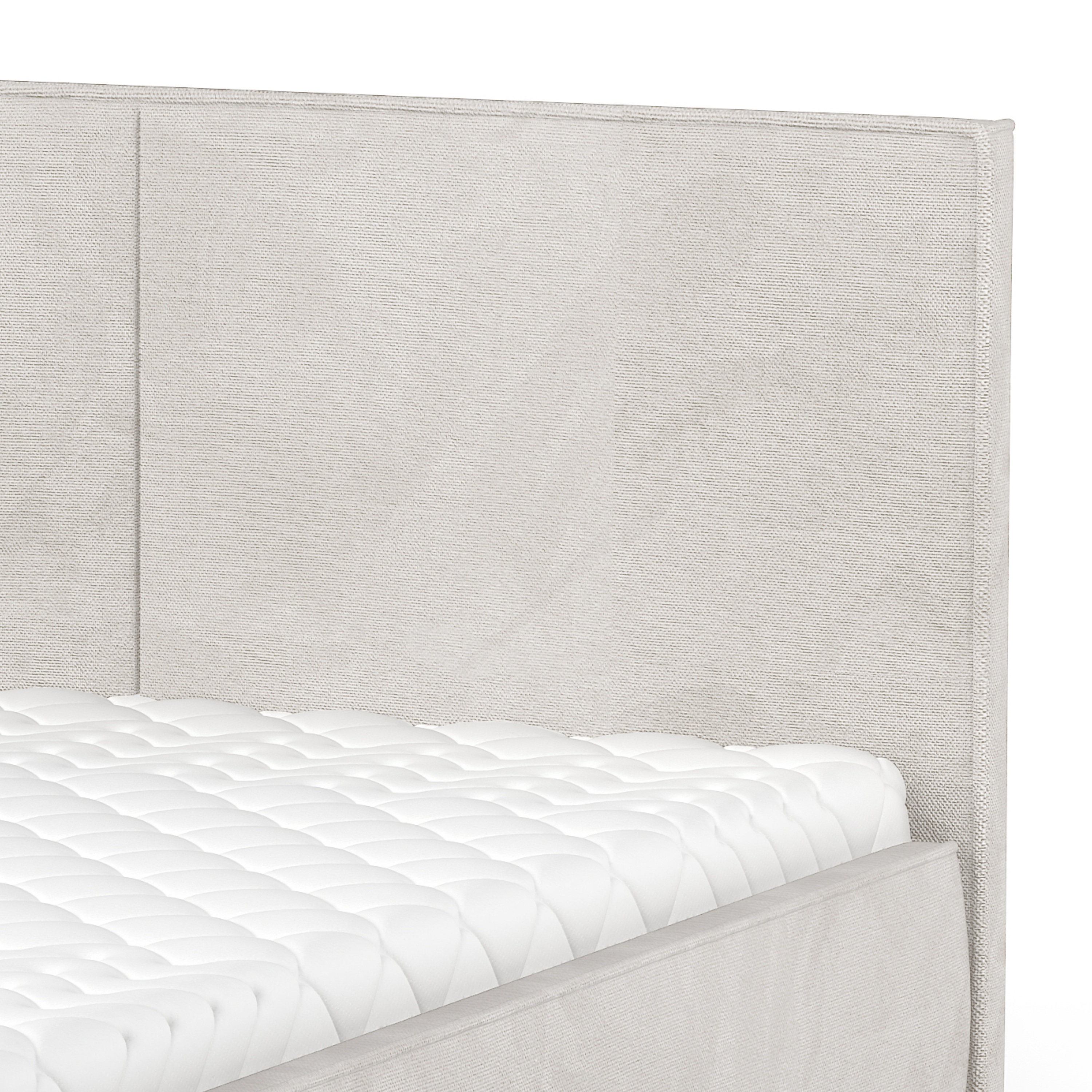Jej drevená konštrukcia je čalúnená na dotyk príjemnou tkaninou zamatového typu s viditeľnou štruktúrou. Zadná strana postele však nie je potiahnutá. Posteľ je vybavená vysokým čelom, ktoré poslúži ako ideálna opora hlavy počas relaxu. Korpus je doplnený aj o drobné plastové nožičky.