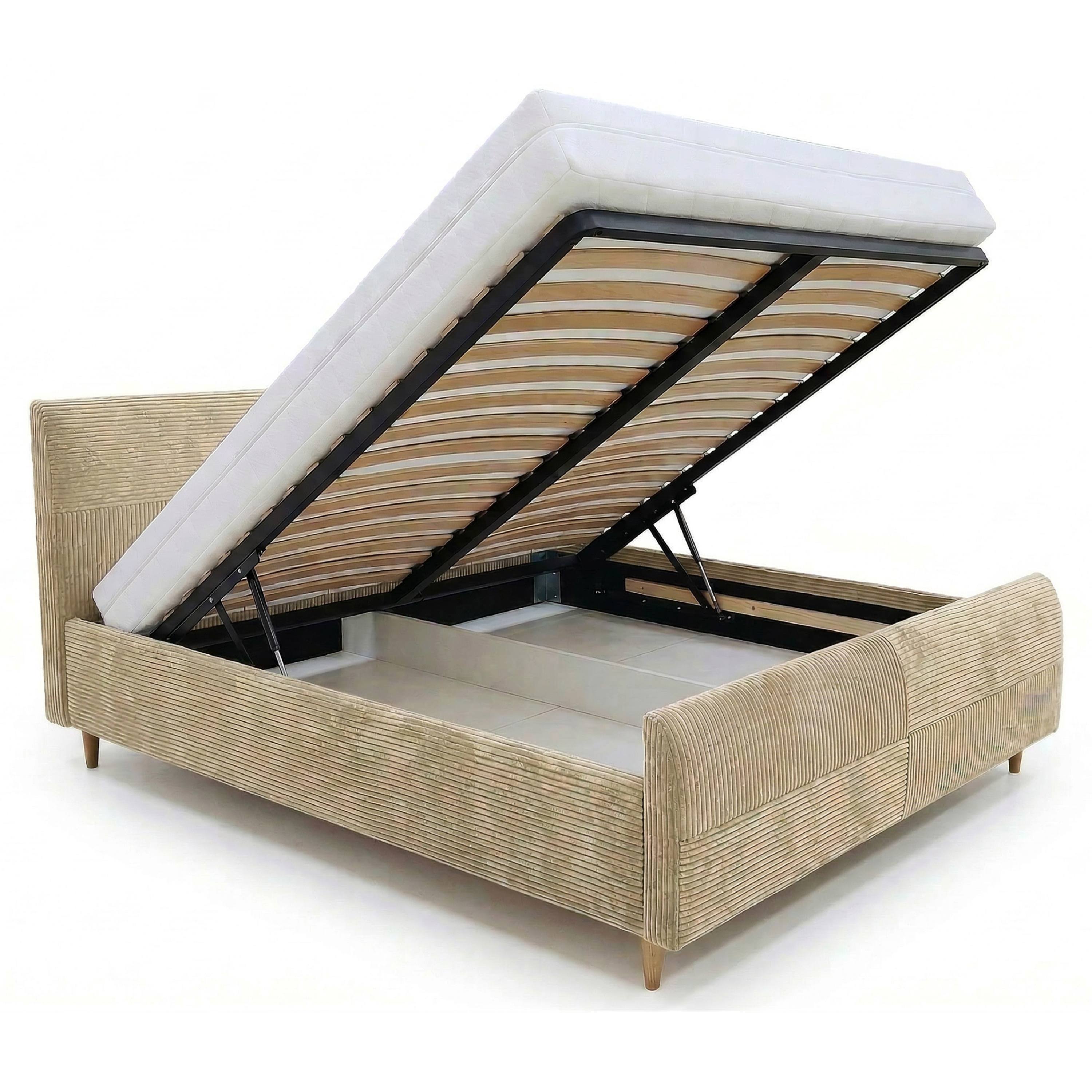 Jej konštrukcia je čalúnená na dotyk príjemnou tkaninou s rebrovaním v jednofarebnom vyhotovení. Vysoké čelo postele umožňuje dopriať si komfortné opretie počas relaxácie. Posteľ je dodávaná vrátane lamelového roštu osadeného do kovového rámu. Predný výklop potom umožňuje jednoduchý prístup do úložného priestoru.