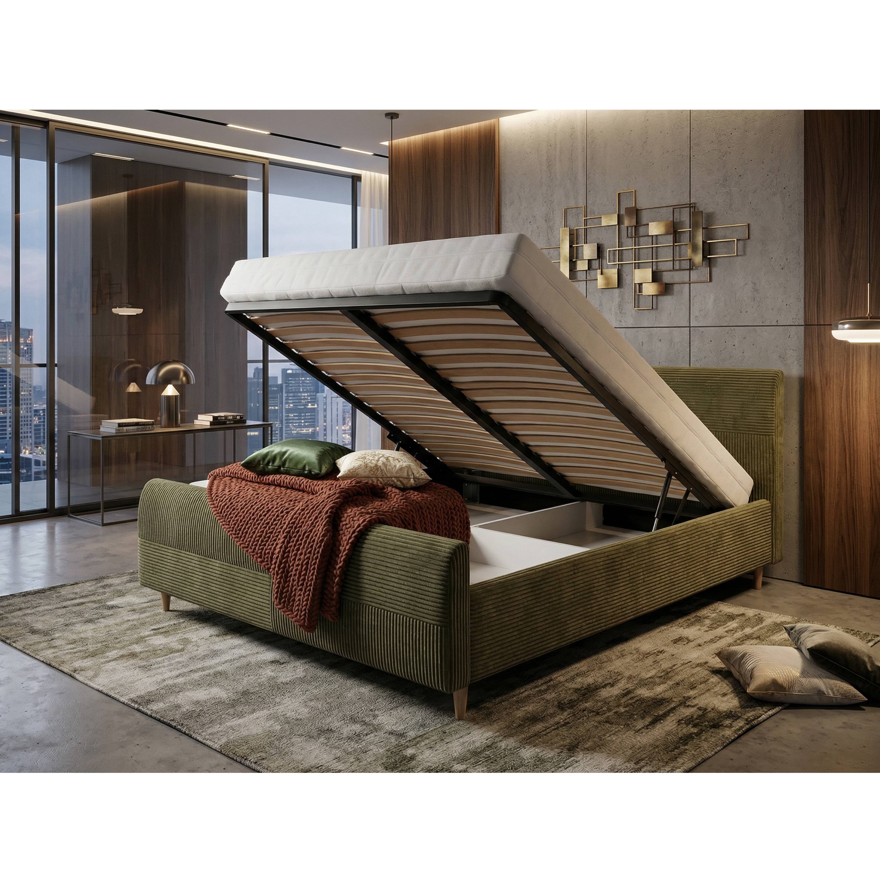 Jej konštrukcia je čalúnená na dotyk príjemnou tkaninou s rebrovaním v jednofarebnom vyhotovení. Vysoké čelo postele umožňuje dopriať si komfortné opretie počas relaxácie. Posteľ je dodávaná vrátane lamelového roštu osadeného do kovového rámu. Predný výklop potom umožňuje jednoduchý prístup do úložného priestoru.