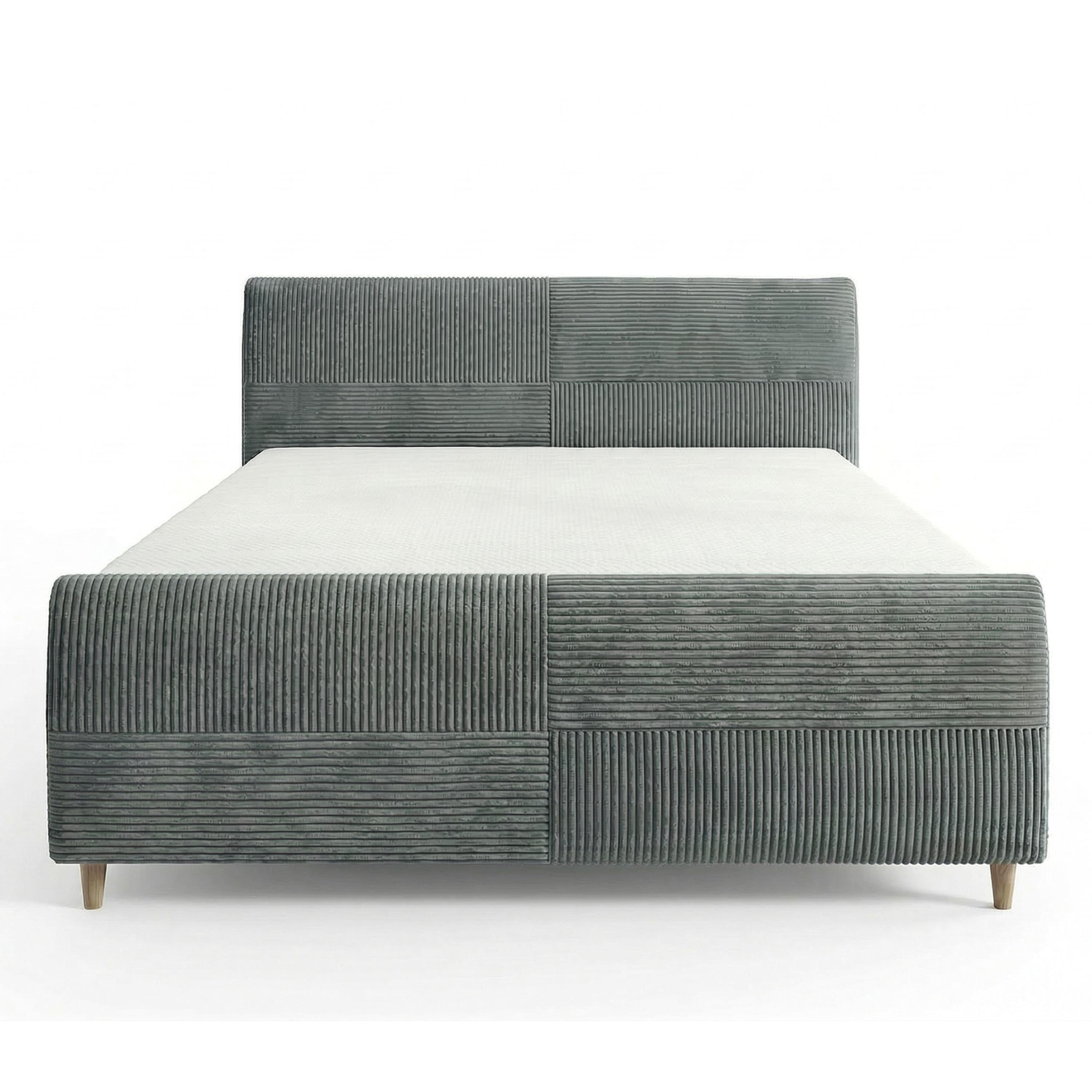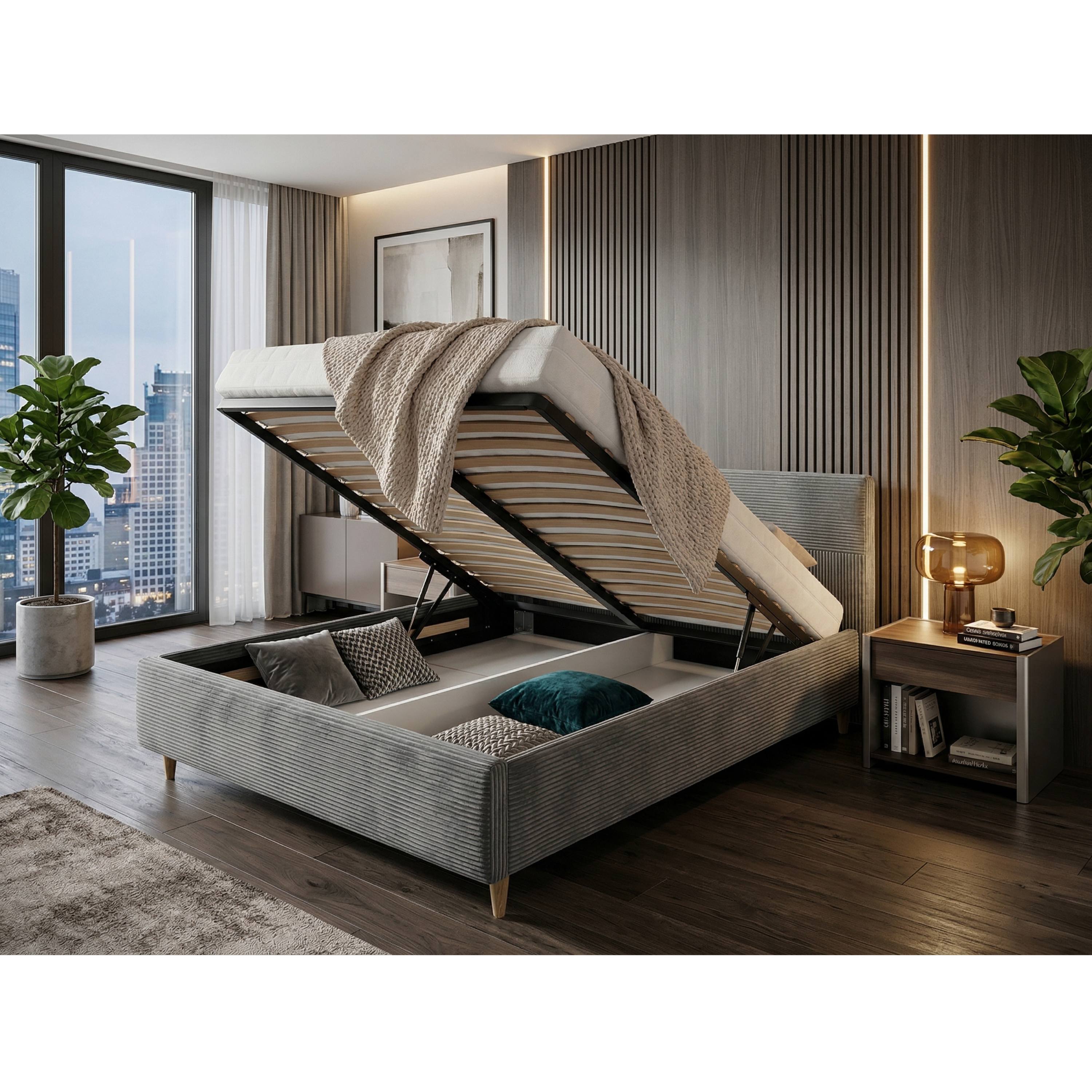 Jej konštrukcia je čalúnená na dotyk príjemnou tkaninou s rebrovaním v jednofarebnom vyhotovení. Vysoké čelo postele umožňuje dopriať si komfortné opretie počas relaxácie. Posteľ je dodávaná vrátane lamelového roštu osadeného do kovového rámu. Predný výklop potom umožňuje jednoduchý prístup do úložného priestoru.