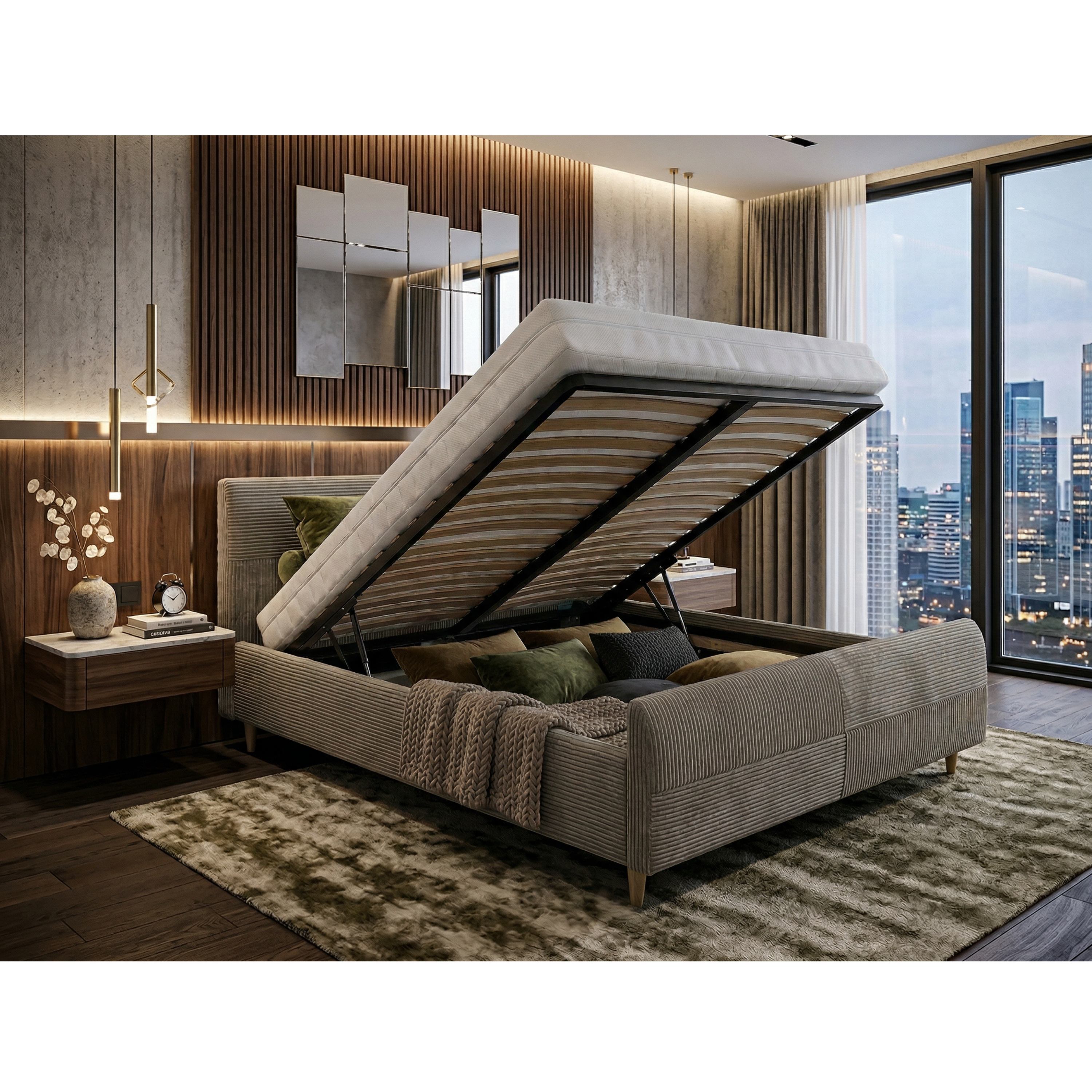Jej konštrukcia je čalúnená na dotyk príjemnou tkaninou s rebrovaním v jednofarebnom vyhotovení. Vysoké čelo postele umožňuje dopriať si komfortné opretie počas relaxácie. Posteľ je dodávaná vrátane lamelového roštu osadeného do kovového rámu. Predný výklop potom umožňuje jednoduchý prístup do úložného priestoru.