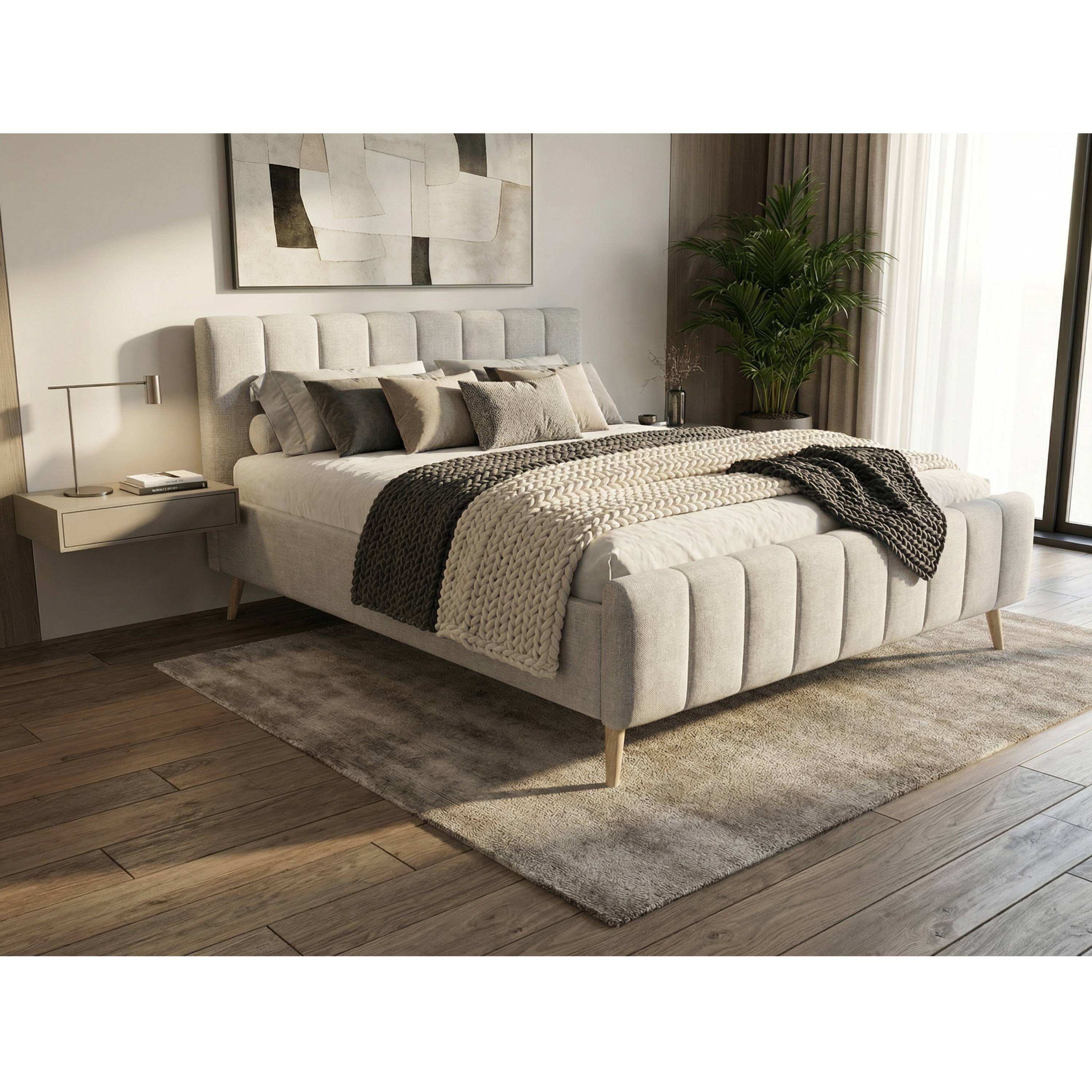 Jej konštrukcia je čalúnená na dotyk príjemnou tkaninou v neutrálnom farebnom vyhotovení, ktoré ľahko zladíte s ďalším vybavením miestnosti. Poťah je navyše v oblasti oboch čiel doplnený o dekoratívne prešívanie. Posteľ je dodávaná vrátane roštu, matrac je však potrebné dokúpiť samostatne. Na skladovanie lôžkovín a ďalších predmetov slúži integrovaný úložný priestor. Celkový vzhľad podčiarkujú drevené nohy v prírodnom odtieni, ktoré zároveň uľahčujú upratovanie pod nábytkom.