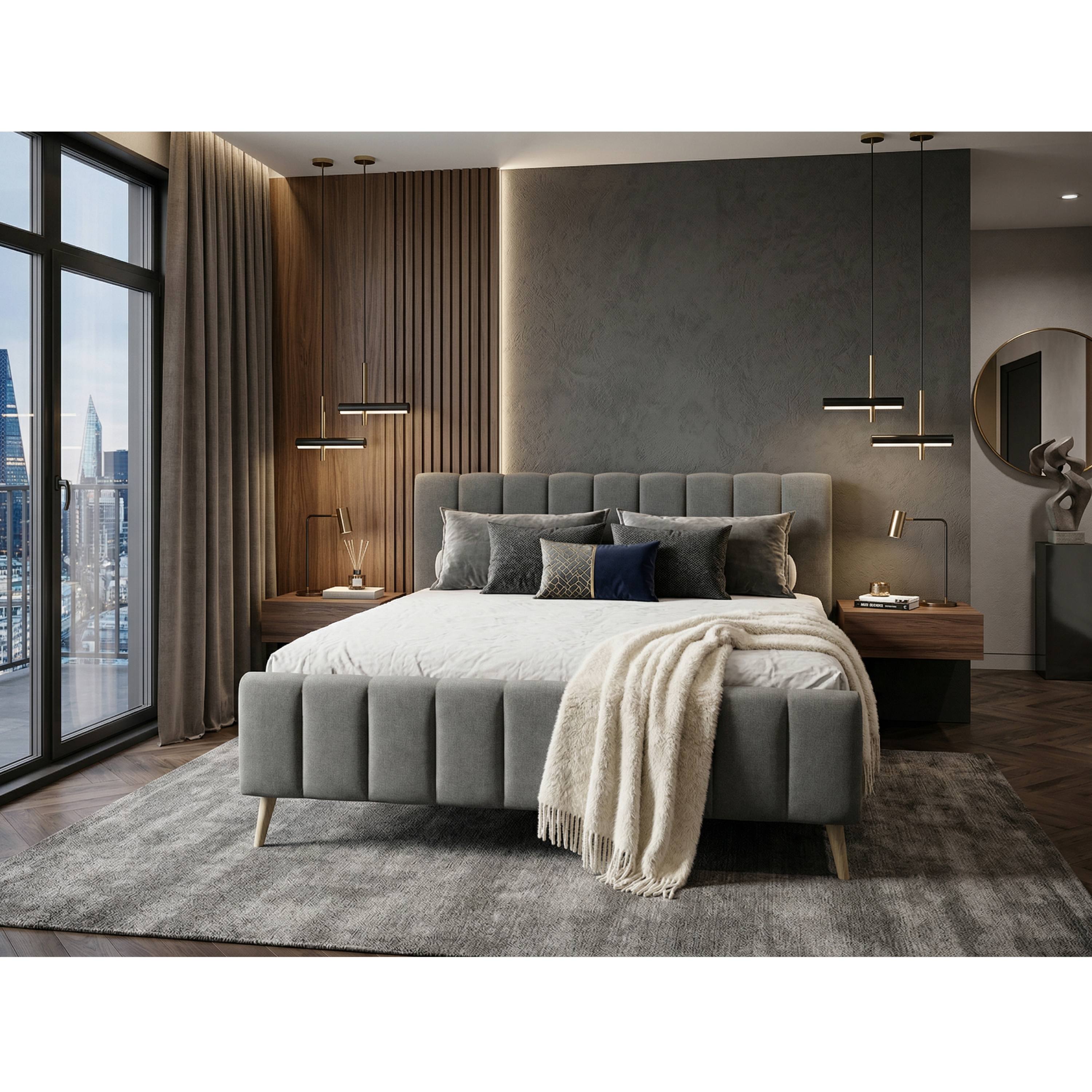 Jej konštrukcia je čalúnená na dotyk príjemnou tkaninou v neutrálnom farebnom vyhotovení, ktoré ľahko zladíte s ďalším vybavením miestnosti. Poťah je navyše v oblasti oboch čiel doplnený o dekoratívne prešívanie. Posteľ je dodávaná vrátane roštu, matrac je však potrebné dokúpiť samostatne. Na skladovanie lôžkovín a ďalších predmetov slúži integrovaný úložný priestor. Celkový vzhľad podčiarkujú drevené nohy v prírodnom odtieni, ktoré zároveň uľahčujú upratovanie pod nábytkom.