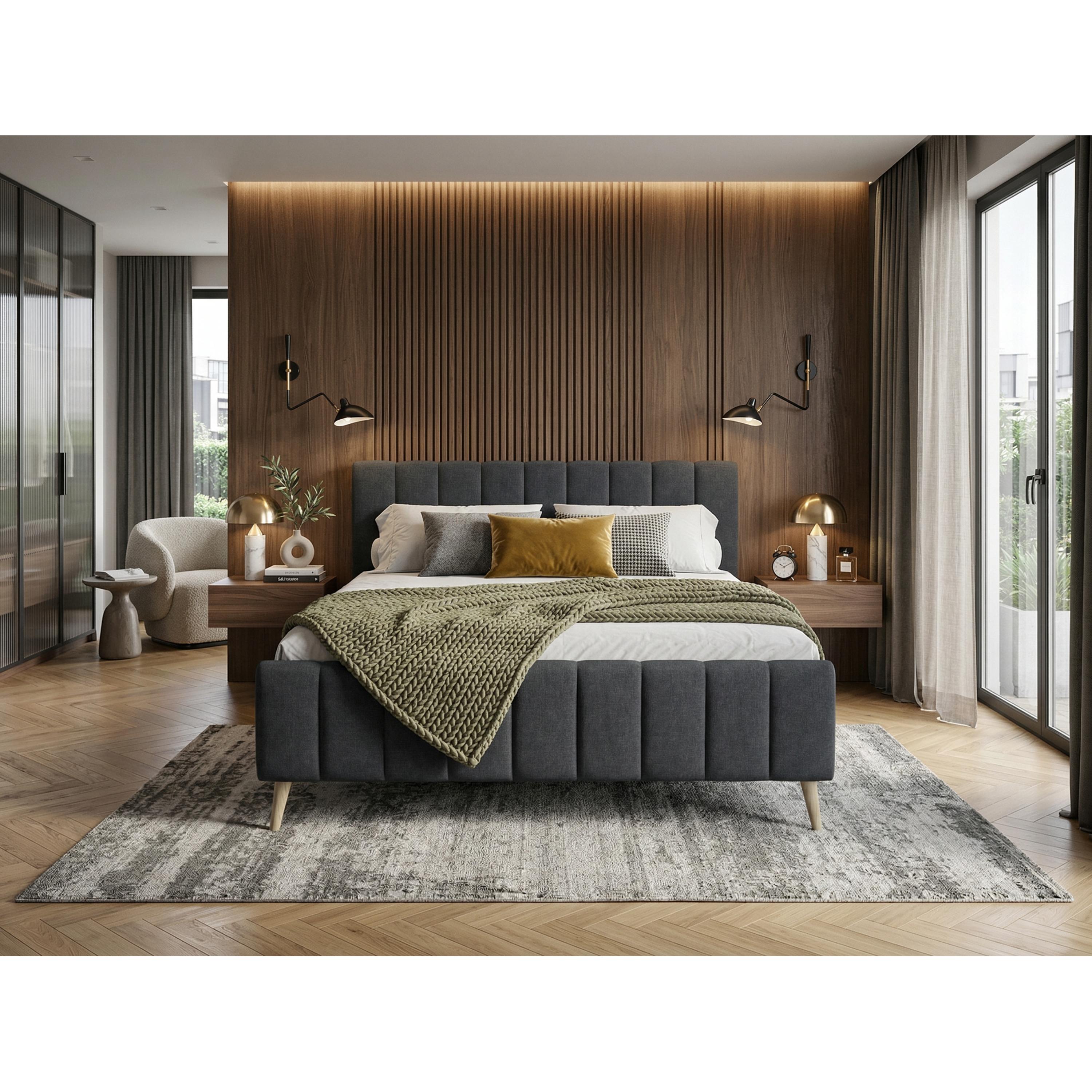 Jej konštrukcia je čalúnená na dotyk príjemnou tkaninou v neutrálnom farebnom vyhotovení, ktoré ľahko zladíte s ďalším vybavením miestnosti. Poťah je navyše v oblasti oboch čiel doplnený o dekoratívne prešívanie. Posteľ je dodávaná vrátane roštu, matrac je však potrebné dokúpiť samostatne. Na skladovanie lôžkovín a ďalších predmetov slúži integrovaný úložný priestor. Celkový vzhľad podčiarkujú drevené nohy v prírodnom odtieni, ktoré zároveň uľahčujú upratovanie pod nábytkom.