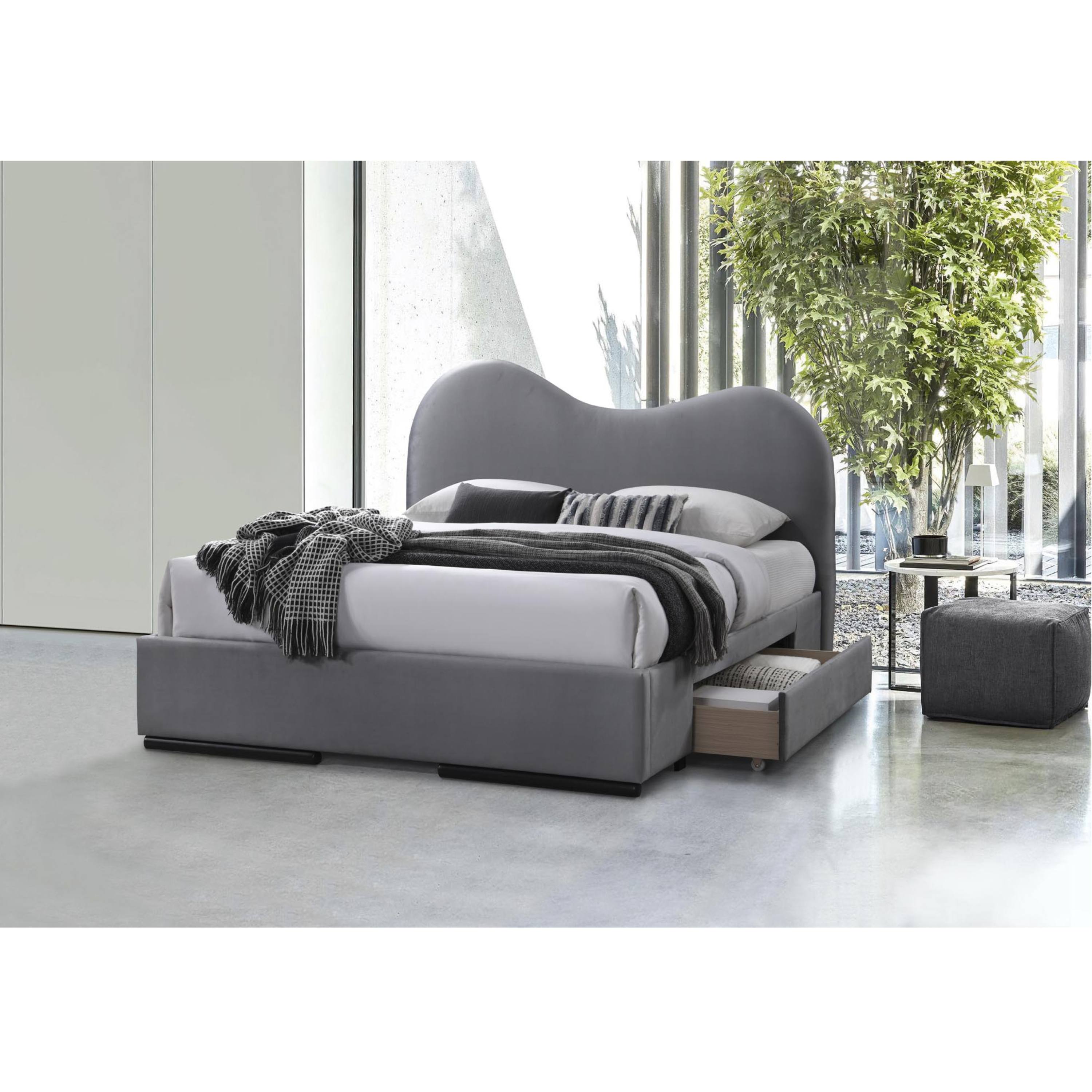 Konštrukcia postele je potiahnutá príjemným čalúnením zamatového vzhľadu v neutrálnom sivom odtieni. Dominantným prvkom je vysoké zaoblené čelo, ktoré ponúka možnosť pohodlne sa oprieť a zároveň pôsobí ako dekoratívny prvok.