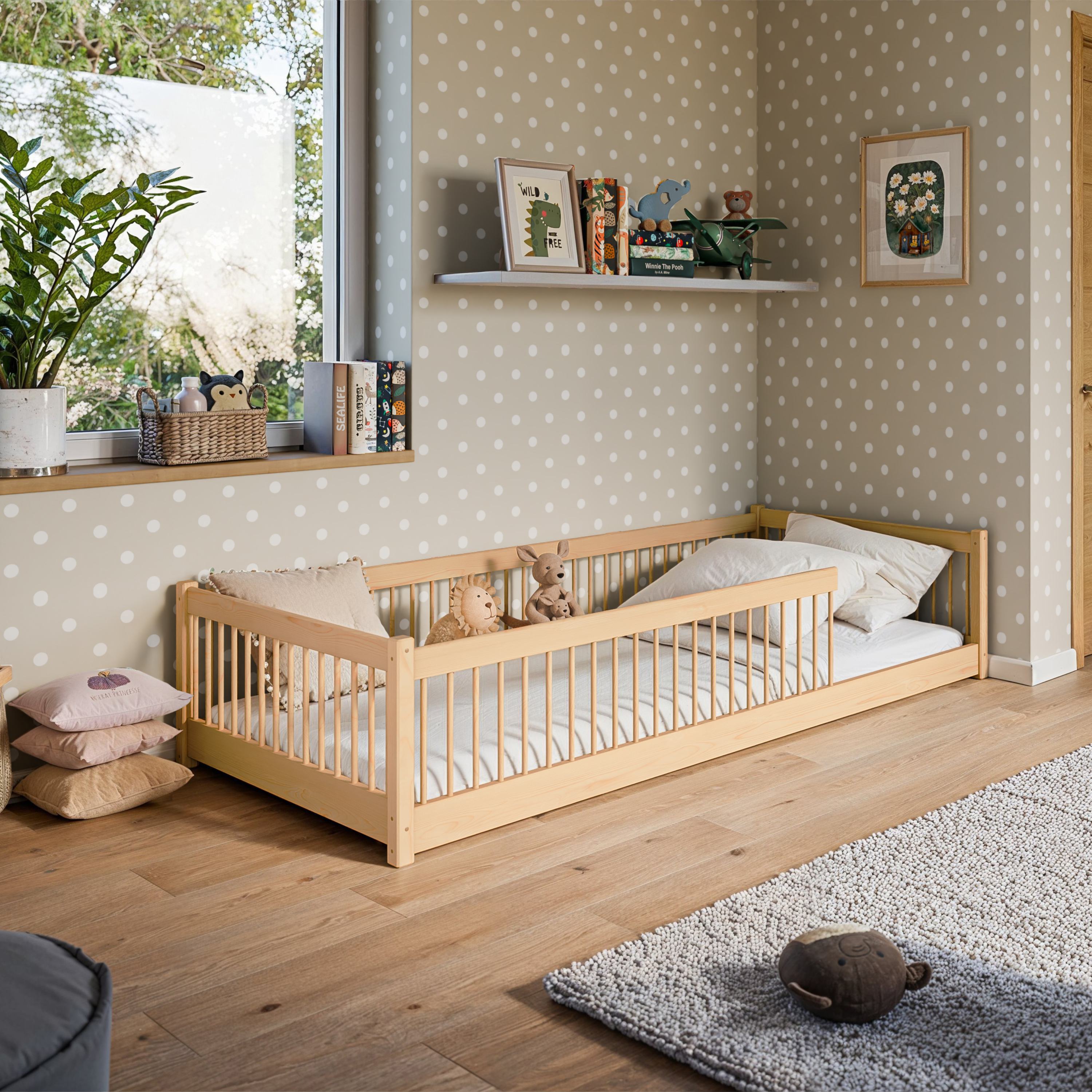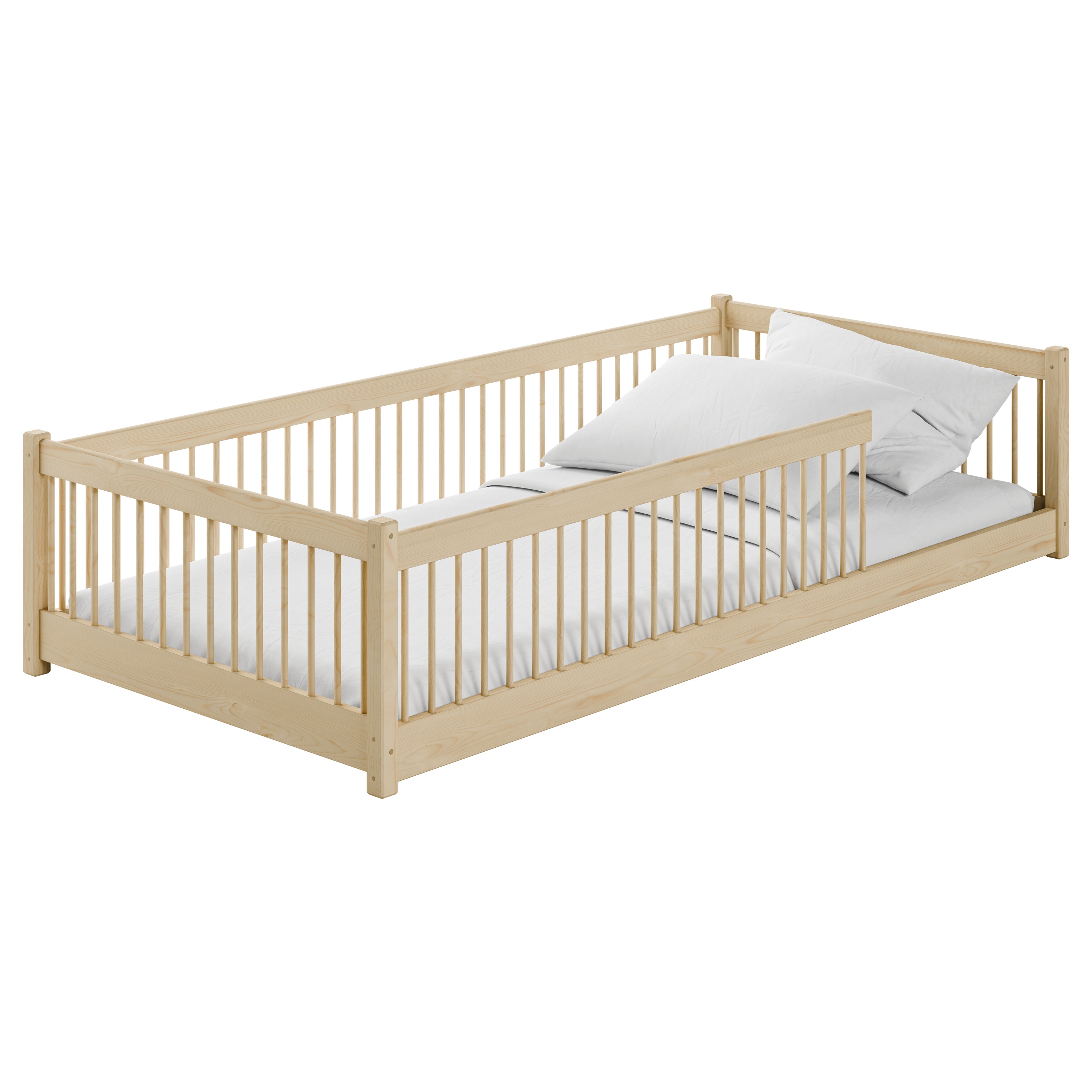 Vyrobená je z kvalitného borovicového dreva, ktoré je ošetrené lakovaným povrchom na zvýšenie odolnosti a dlhej životnosti. Vďaka bezpečnostným zábranám je zaistená ochrana vášho dieťaťa nielen počas spánku, ale aj počas hry. Posteľ má nízku konštrukciu, čo umožňuje deťom samostatne vstávať a uľahčuje ich pohyb v priestore.