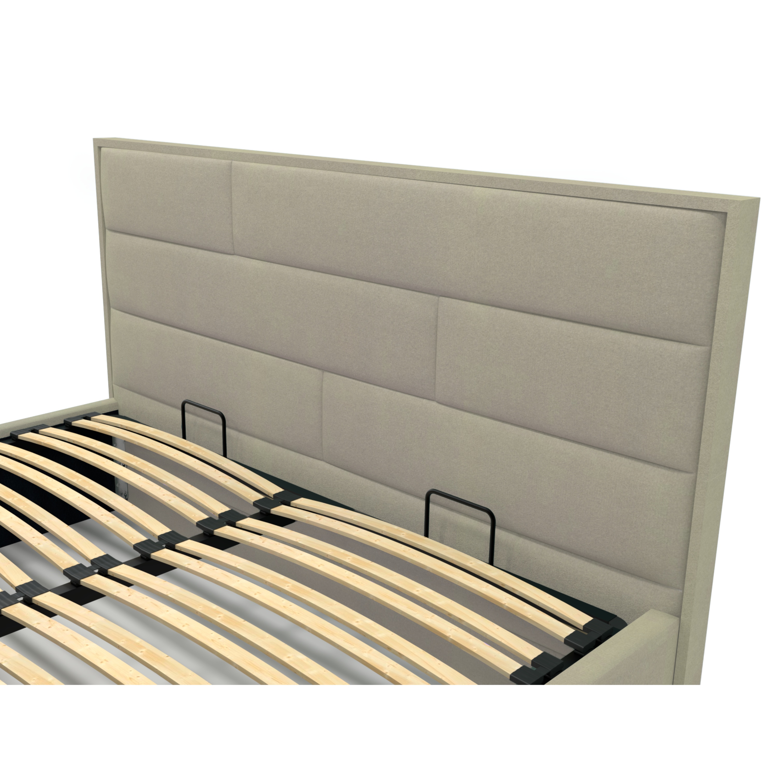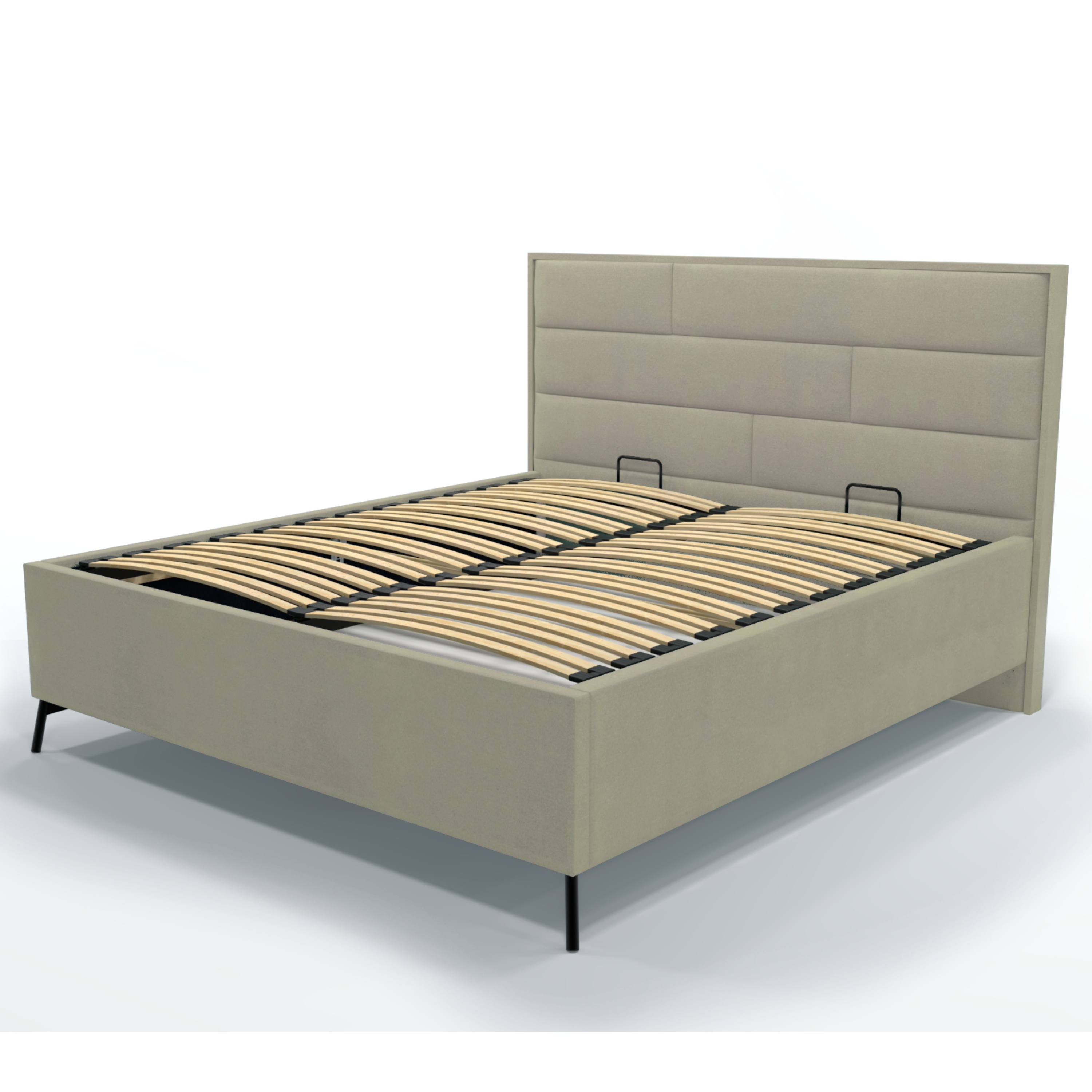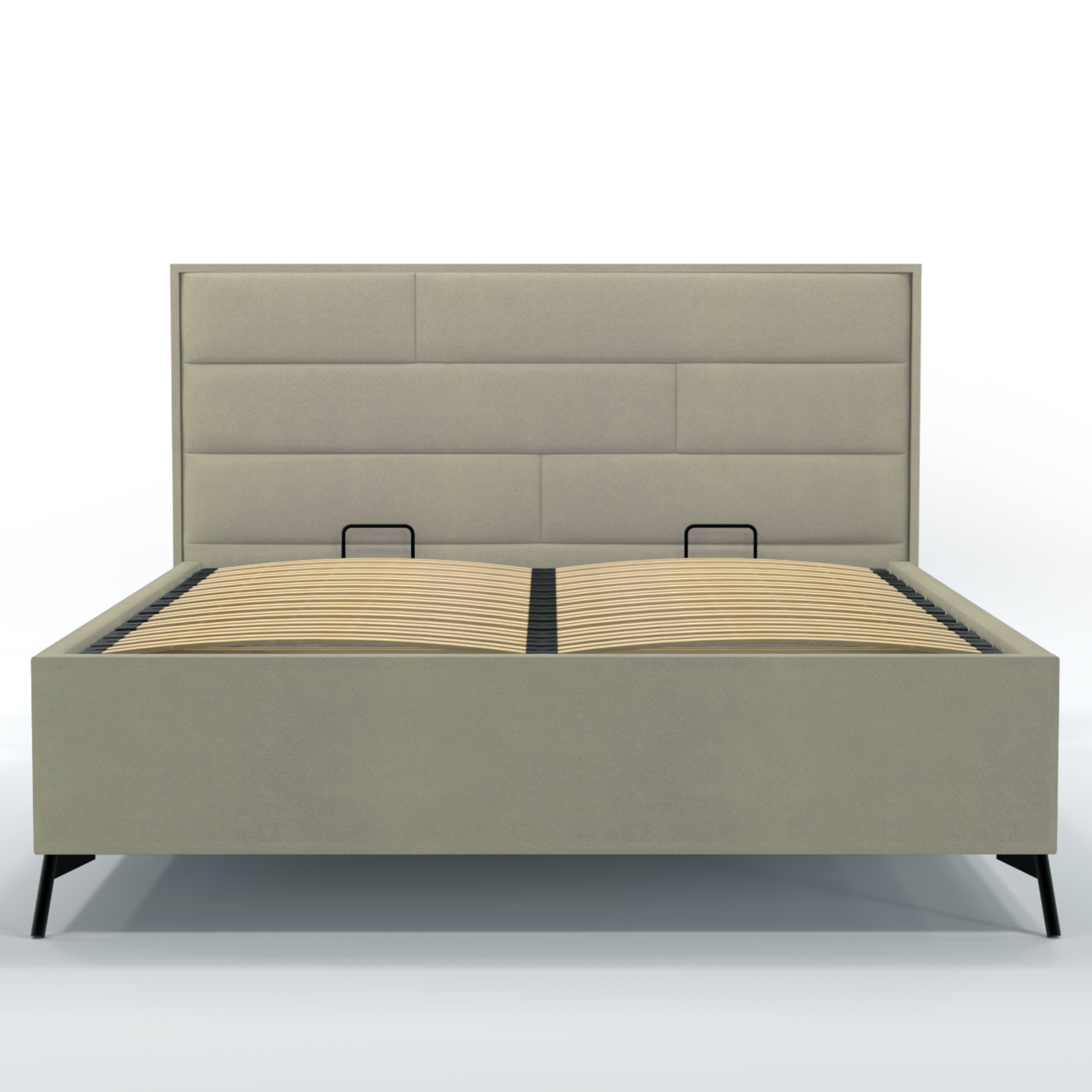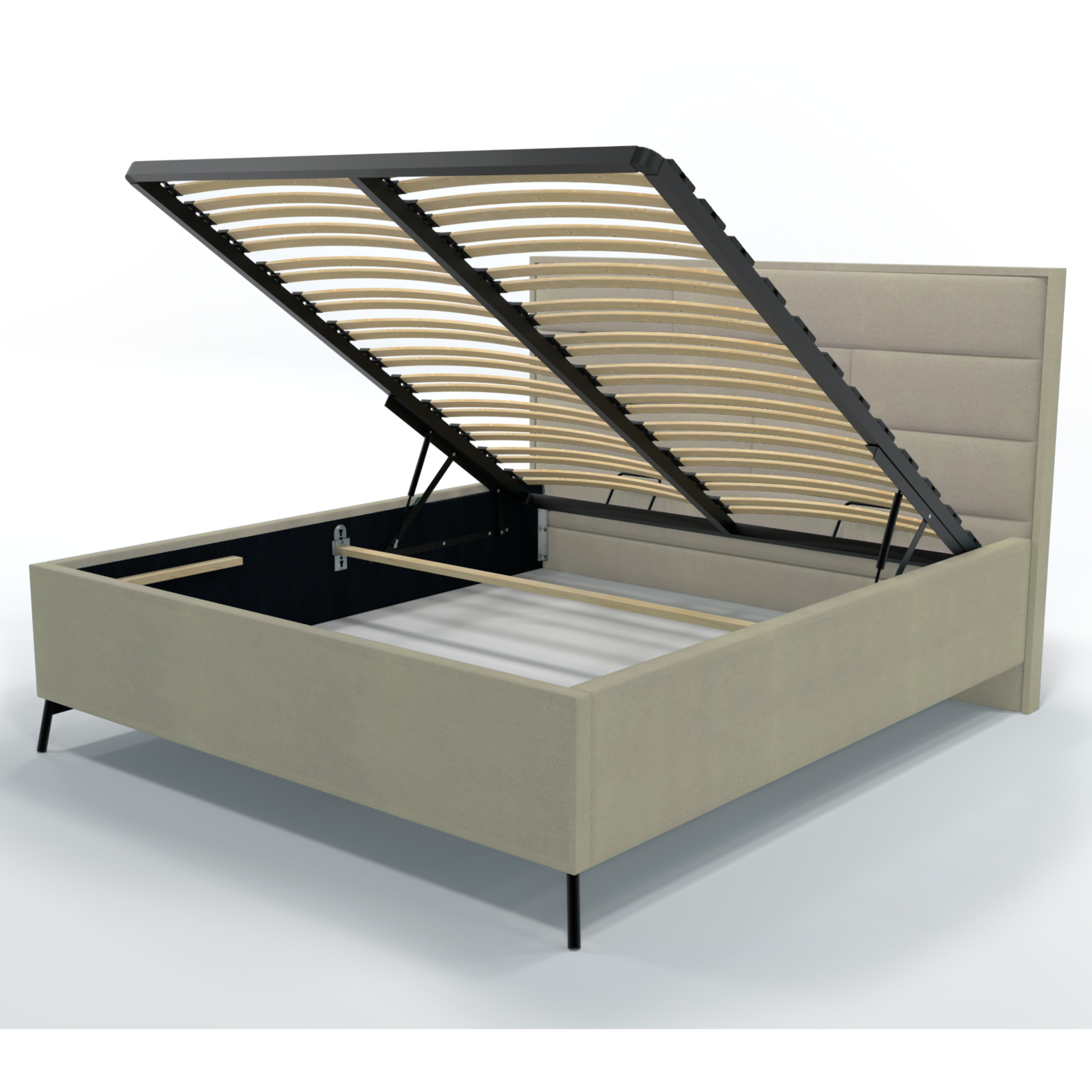 Dominantným prvkom postele je vysoké čelo, ktoré okrem estetickej funkcie umožňuje dopriať si komfortné opretie počas relaxácie. Posteľ je dodávaná vrátane lamelového roštu osadeného v kovovom ráme. Predný výklop následne umožňuje jednoduchý prístup do úložného priestoru pod ložnou plochou.
