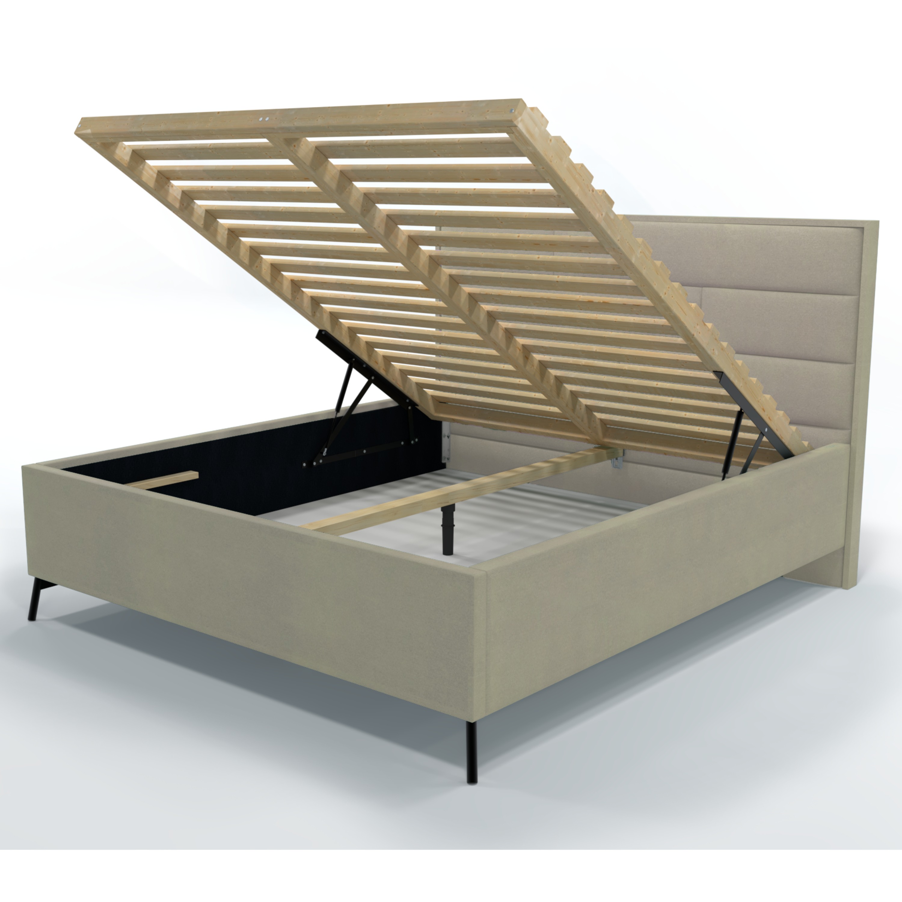 Dominantným prvkom postele je vysoké čelo, ktoré okrem estetickej funkcie umožňuje dopriať si komfortné opretie počas relaxácie. Posteľ je dodávaná vrátane latkového roštu osadeného v drevenom ráme. Predný výklop následne umožňuje jednoduchý prístup do úložného priestoru pod ložnou plochou.