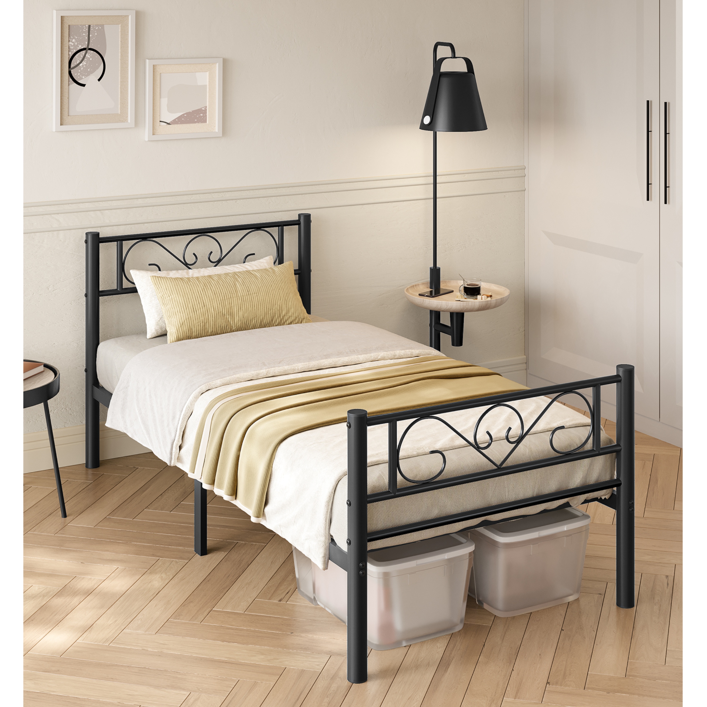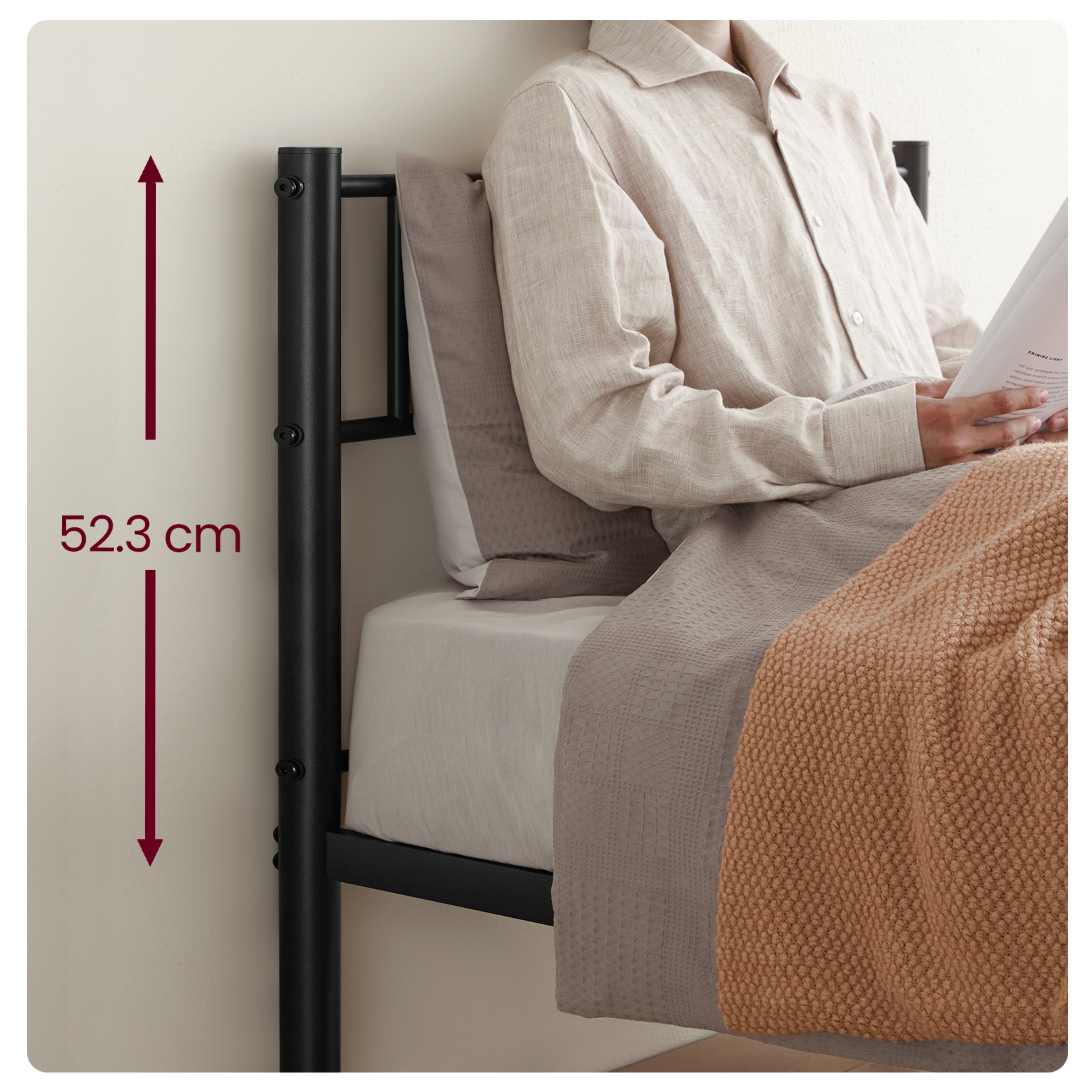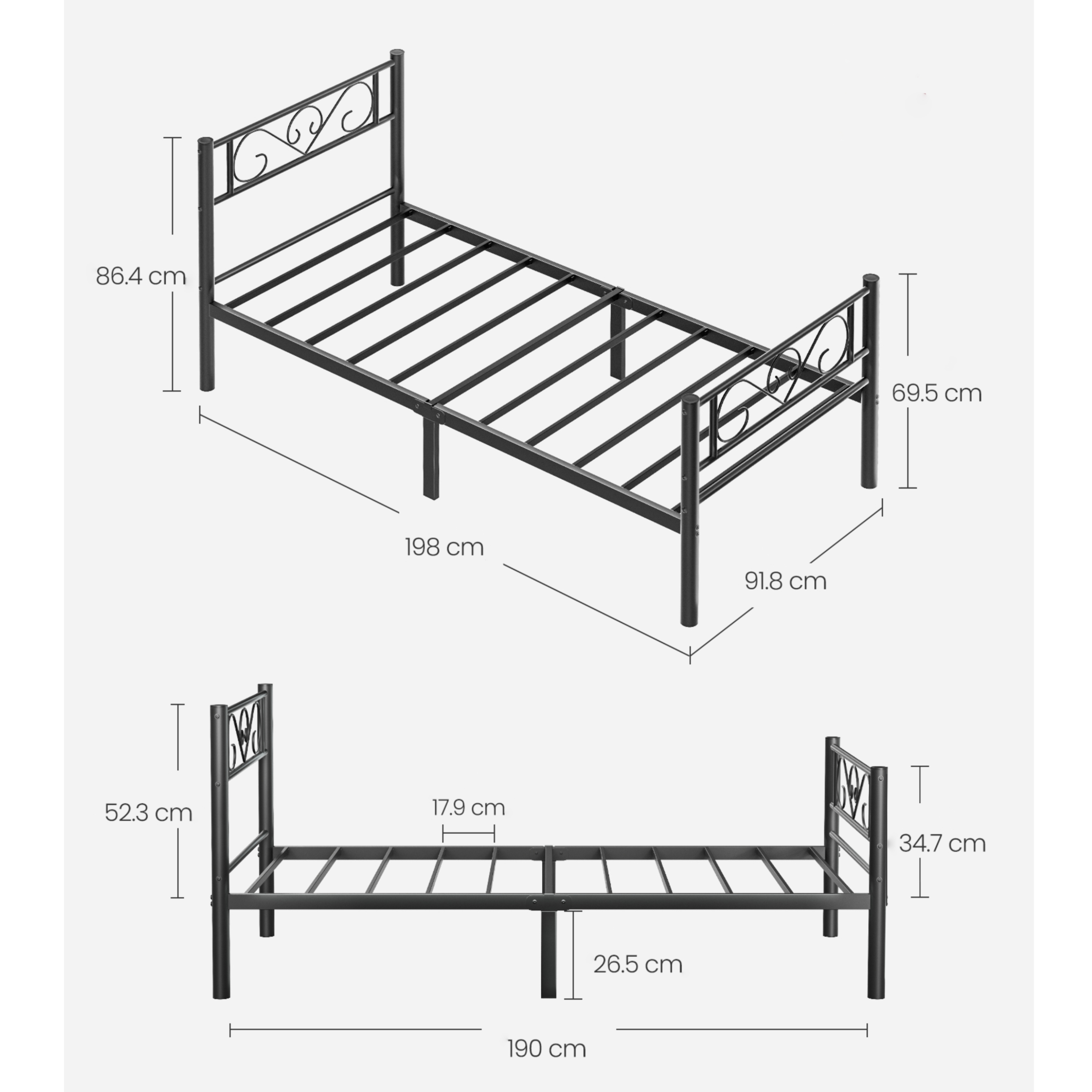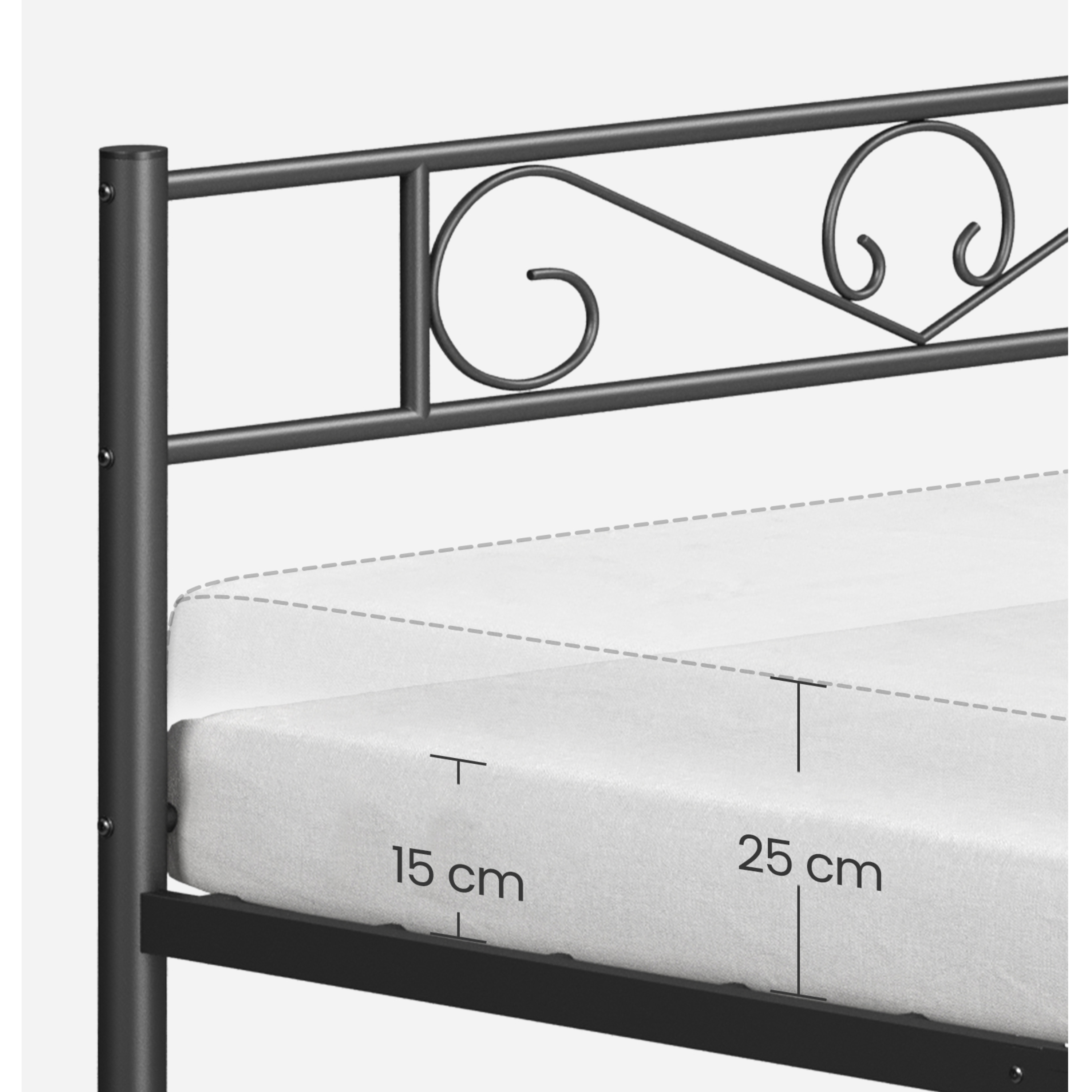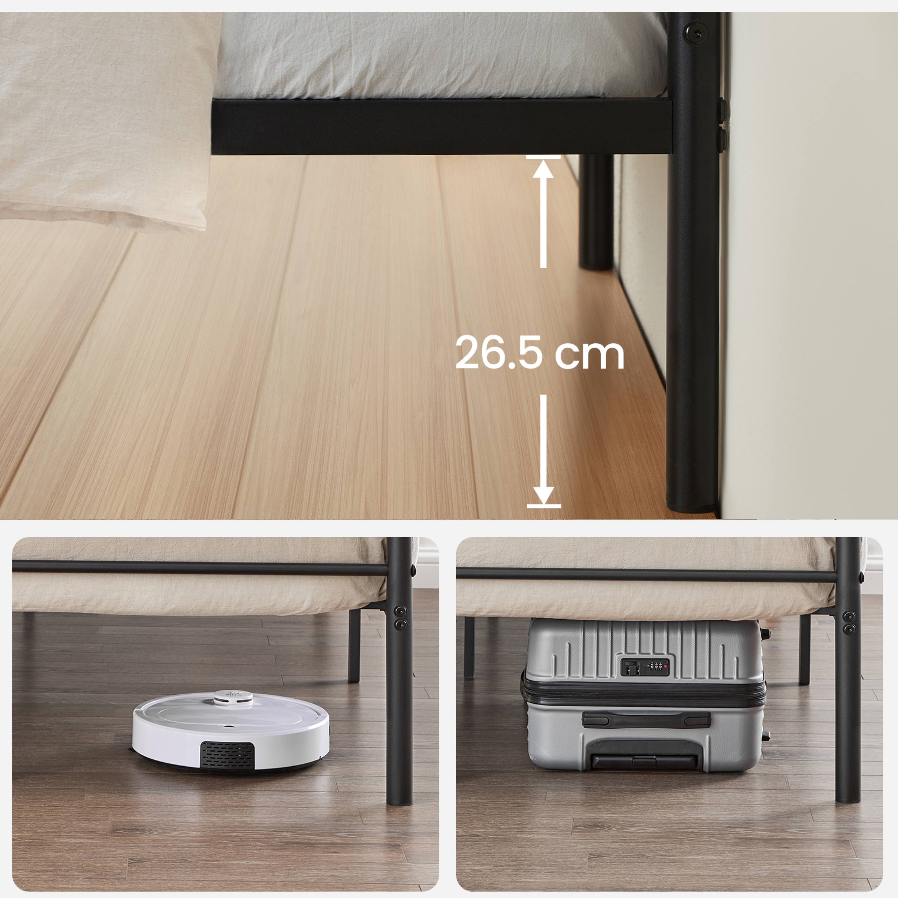 Konštrukcia je vyrobená z práškovo lakovaného kovu, ktorý zaisťuje pevnosť, odolnosť a jednoduchú údržbu. Stabilitu podporuje 6 nôh, ktoré rovnomerne rozkladajú zaťaženie. Tie sú navyše vybavené protišmykovými podložkami, ktoré ochránia podlahu pred poškriabaním. Výhodou je tiež dostatok priestoru pod posteľou, ktorý umožňuje skladovanie úložných boxov a zároveň jednoduché upratovanie. Posteľ sa dodáva vrátane integrovaného roštu, matrac je však potrebné dokúpiť samostatne.
