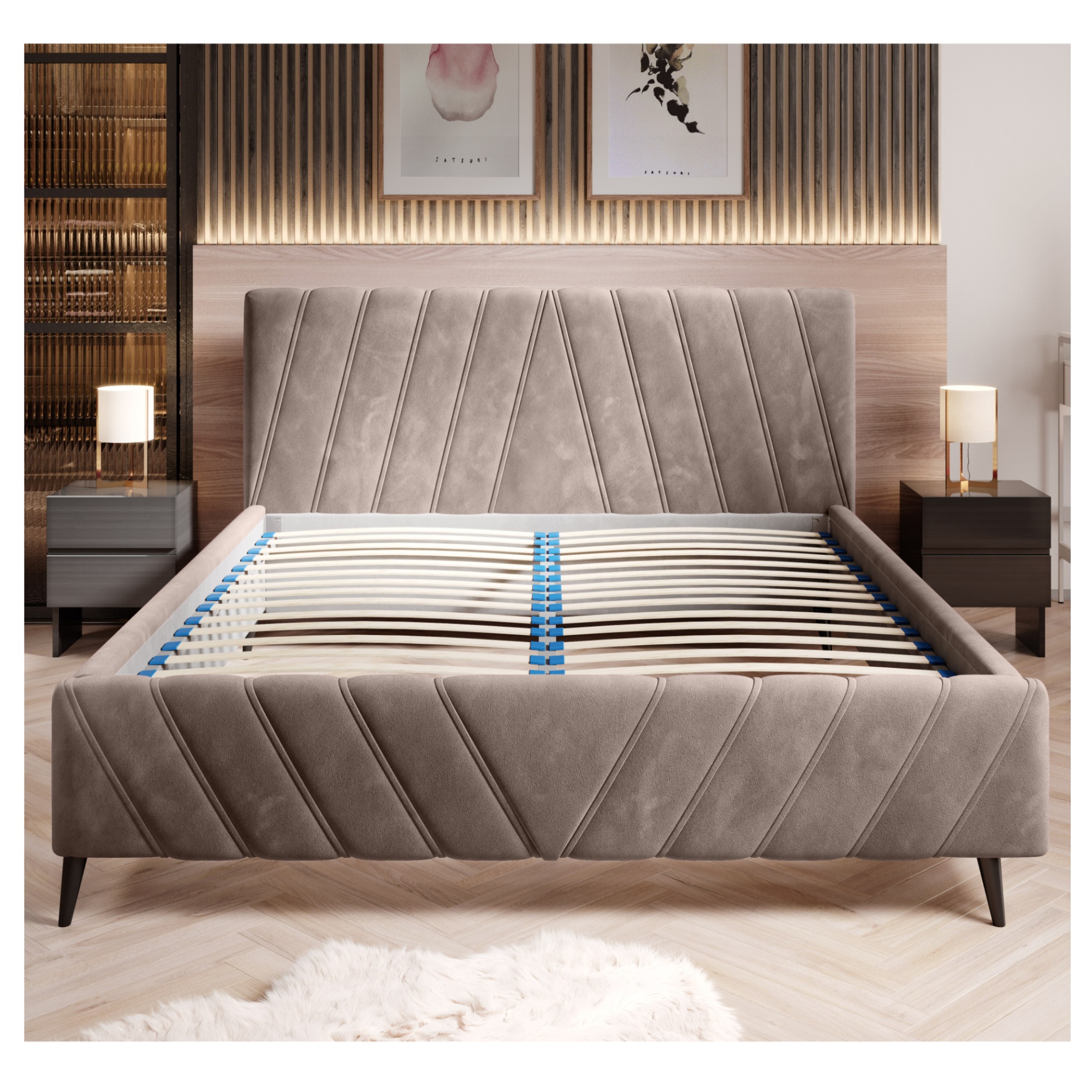Dvojlôžková posteľ TIA predstavuje kombináciu moderného dizajnu s retro nádychom a s praktickými prvkami. Posteľ je čalúnená príjemnou látkou. Čelo postele je elegantne prešívané a ponúka možnosť sa pohodlne oprieť. Stabilitu postele zaručujú nožičky z masívneho dreva.