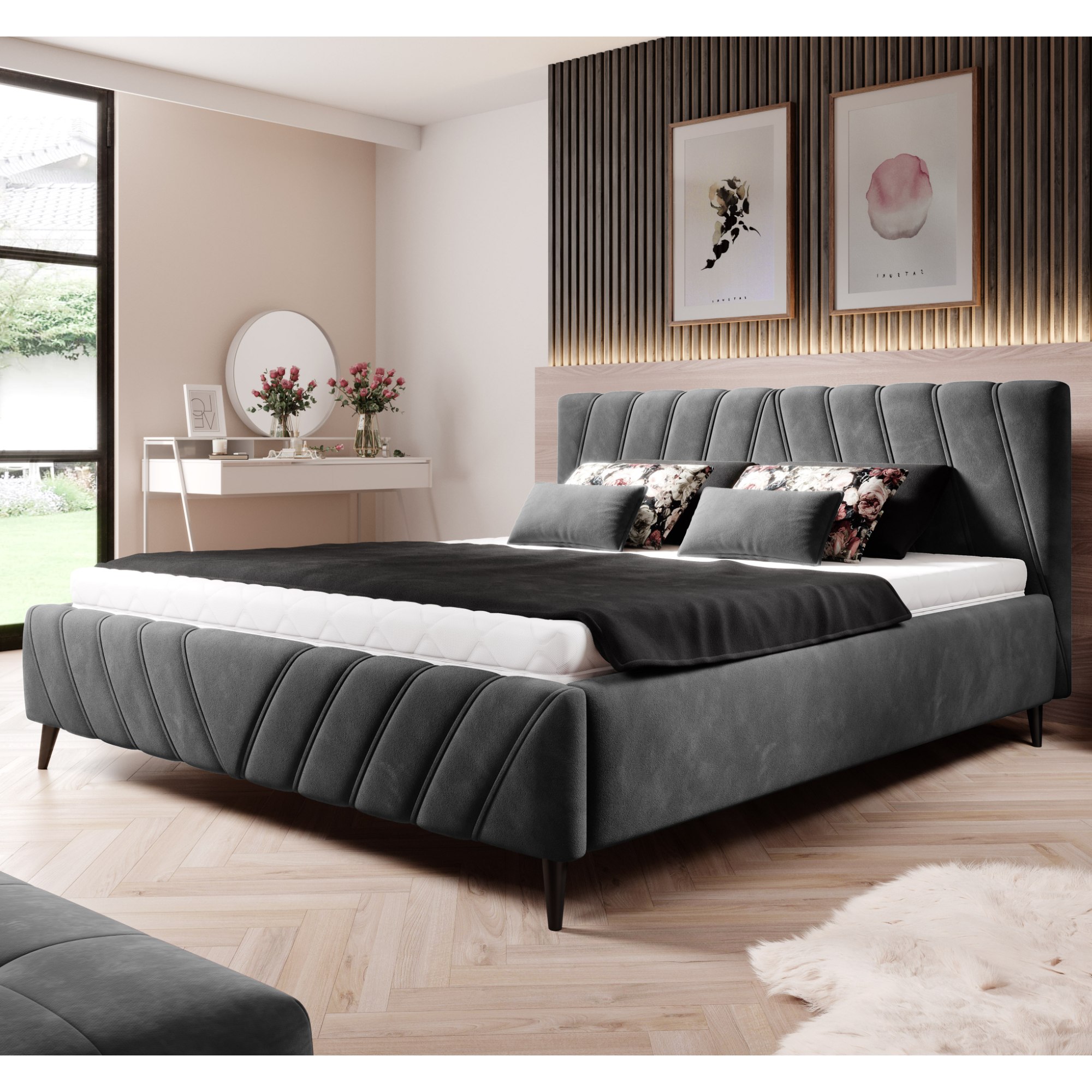 Dvojlôžková posteľ TIA predstavuje kombináciu moderného dizajnu s retro nádychom a s praktickými prvkami. Posteľ je čalúnená príjemnou látkou. Čelo postele je elegantne prešívané a ponúka možnosť sa pohodlne oprieť. Stabilitu postele zaručujú nožičky z masívneho dreva.