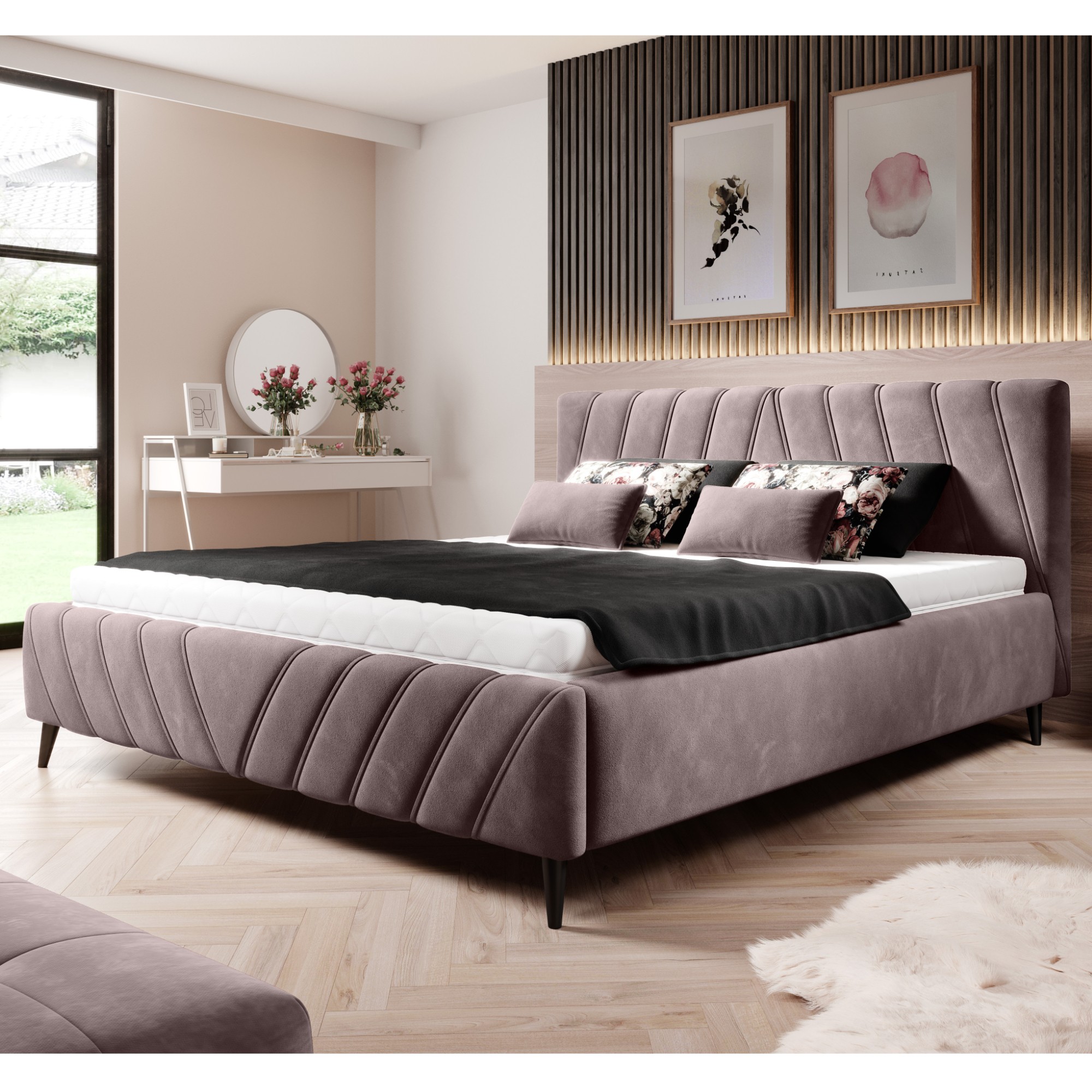 Dvojlôžková posteľ TIA predstavuje kombináciu moderného dizajnu s retro nádychom a s praktickými prvkami. Posteľ je čalúnená príjemnou látkou. Čelo postele je elegantne prešívané a ponúka možnosť sa pohodlne oprieť. Stabilitu postele zaručujú nožičky z masívneho dreva.