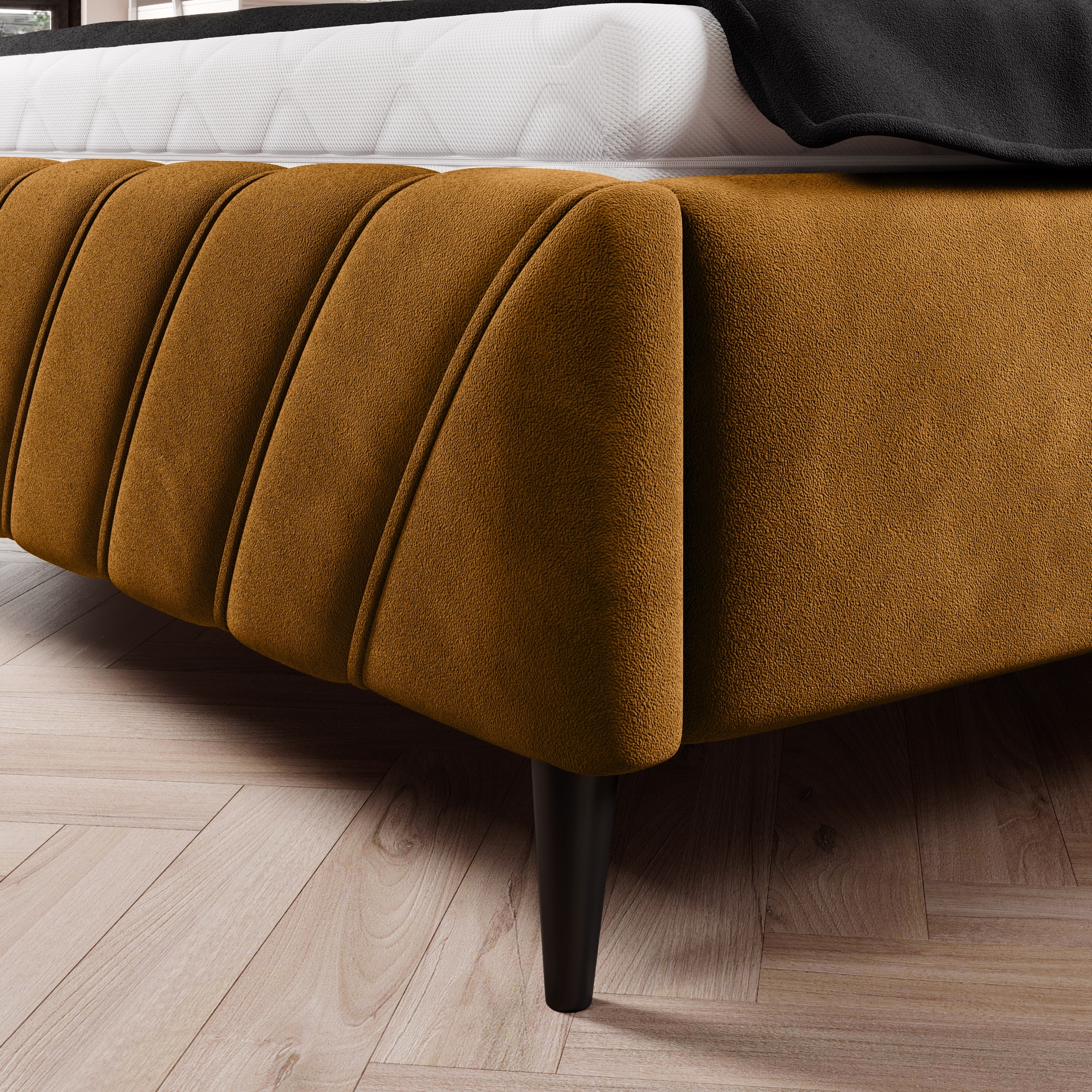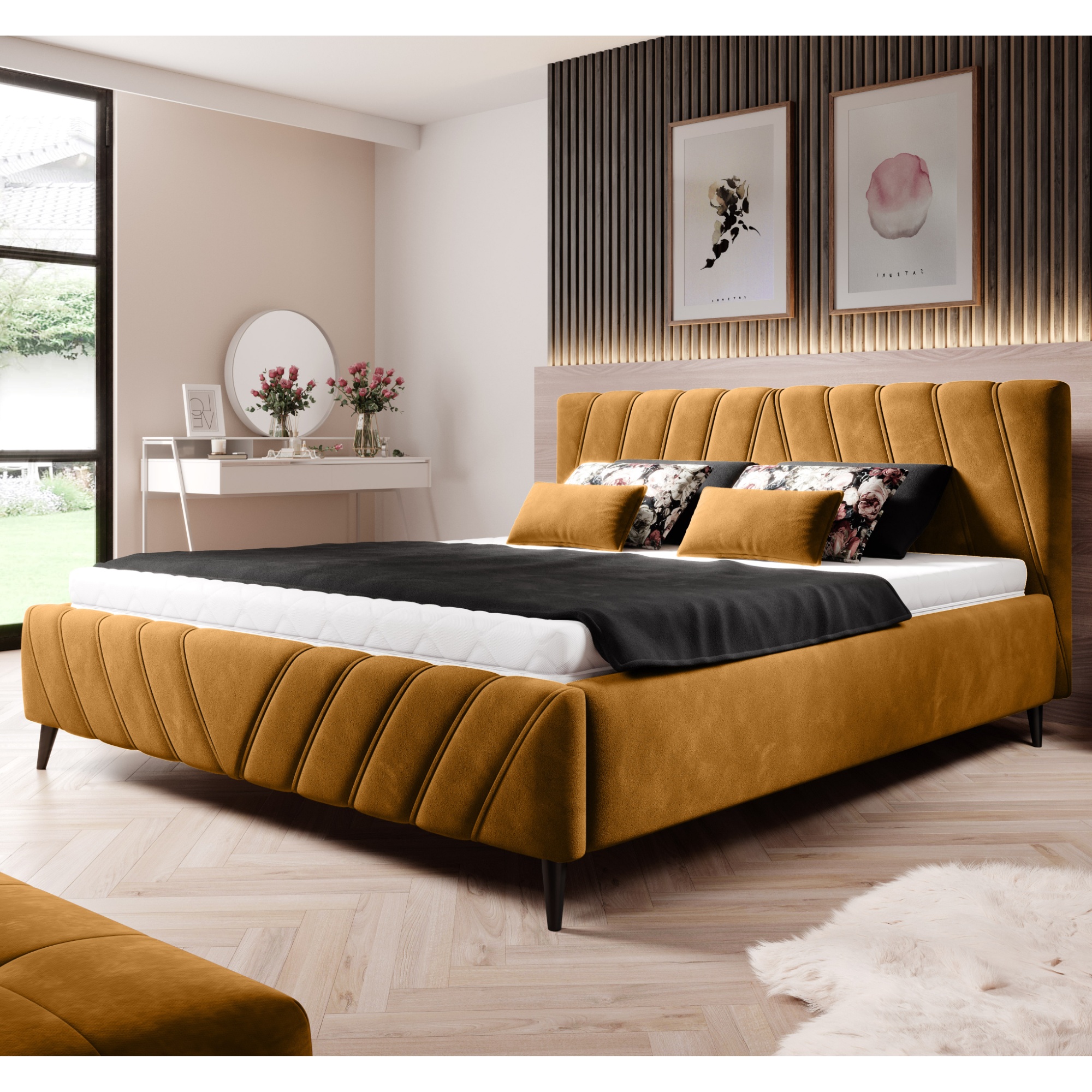 Dvojlôžková posteľ TIA predstavuje kombináciu moderného dizajnu s retro nádychom a s praktickými prvkami. Posteľ je čalúnená príjemnou látkou. Čelo postele je elegantne prešívané a ponúka možnosť sa pohodlne oprieť. Stabilitu postele zaručujú nožičky z masívneho dreva.