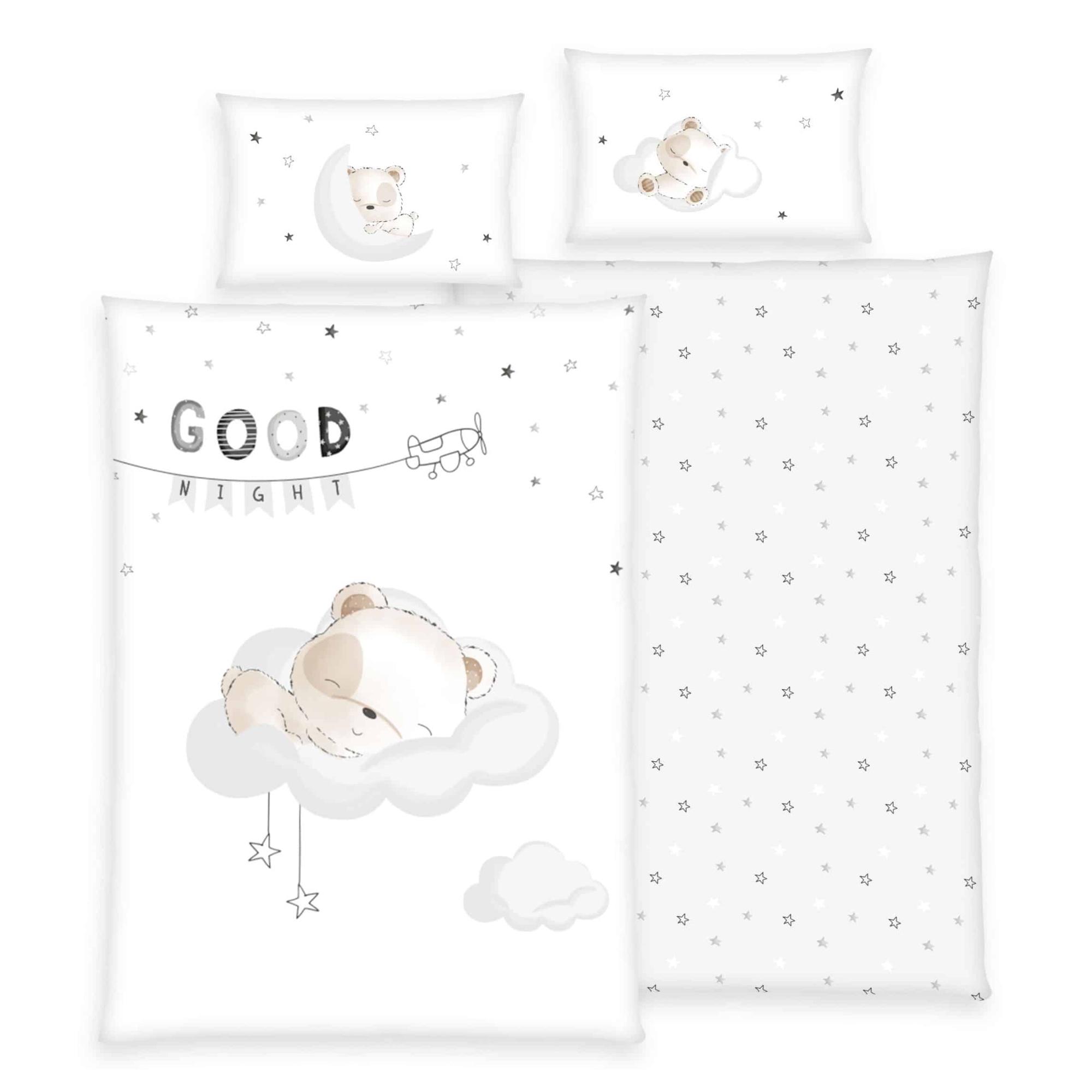 Detská posteľná bielizeň SLEEPING LITTLE BEAR s ilustráciou spiaceho medvedíka, zaistí deťom spánok ako na obláčiku, vďaka jej bavlnenému zloženiu.