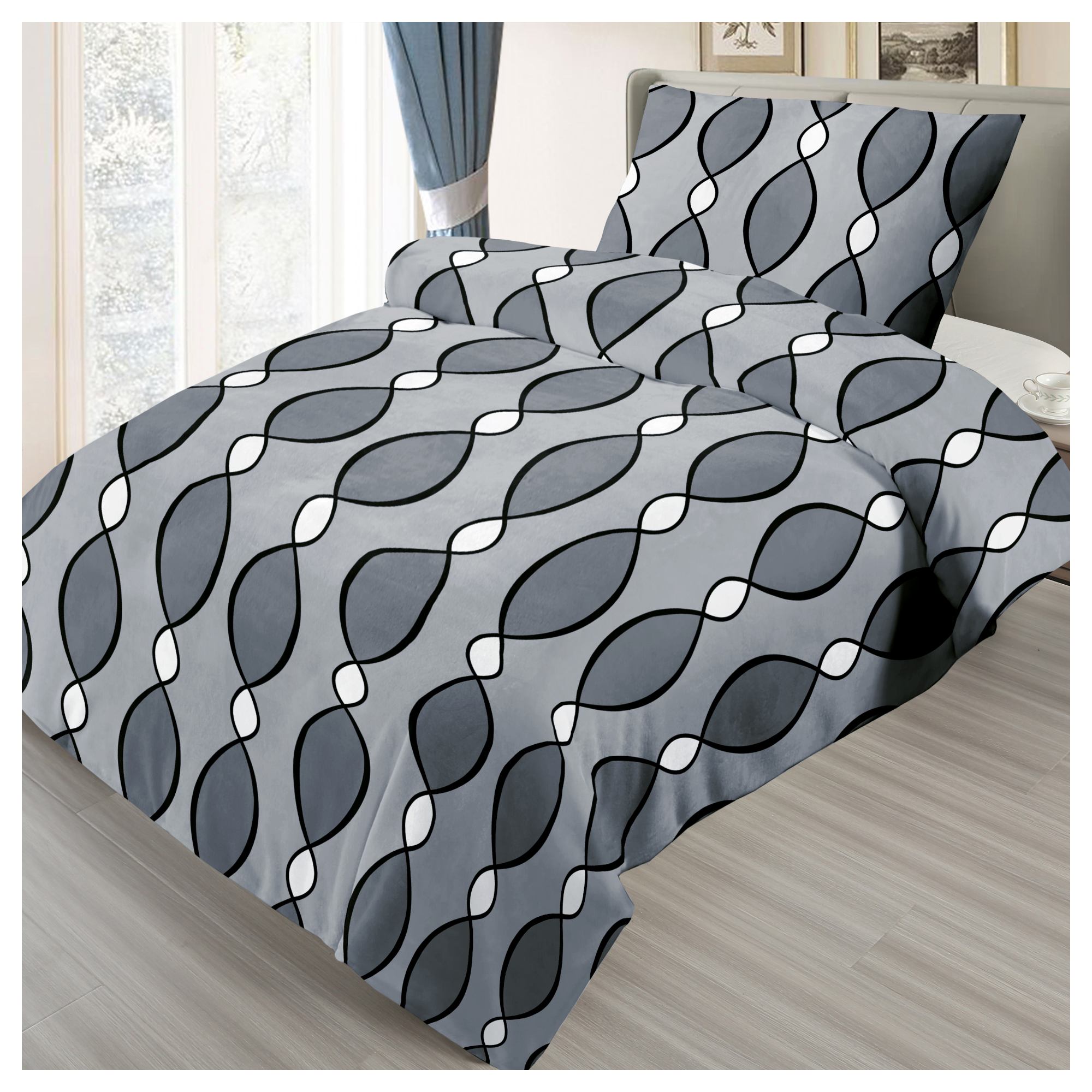 Súprava posteľnej bielizne na francúzske lôžka TORNERO vďaka svojmu jednoduchému spracovaniu v sivých tónoch a zaujímavému vzoru ľahko doplní akúkoľvek spálňu.