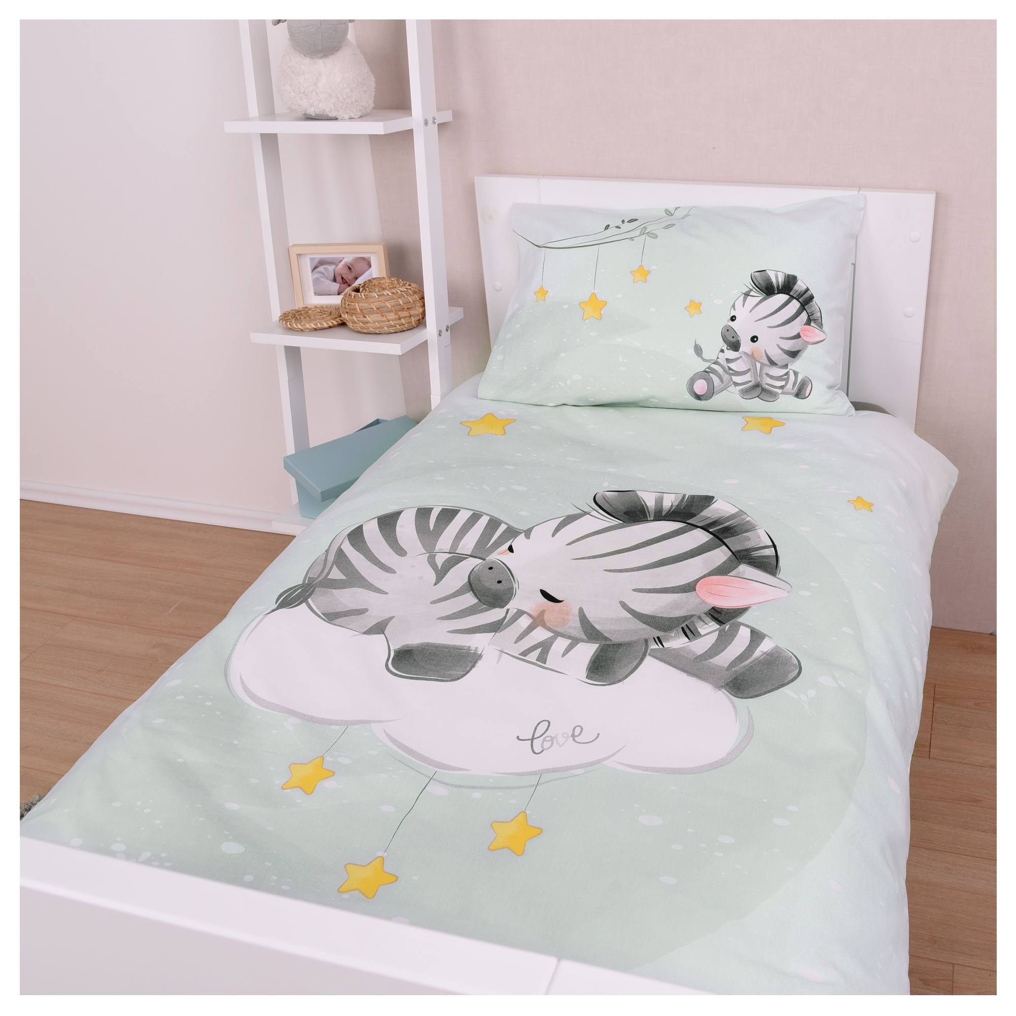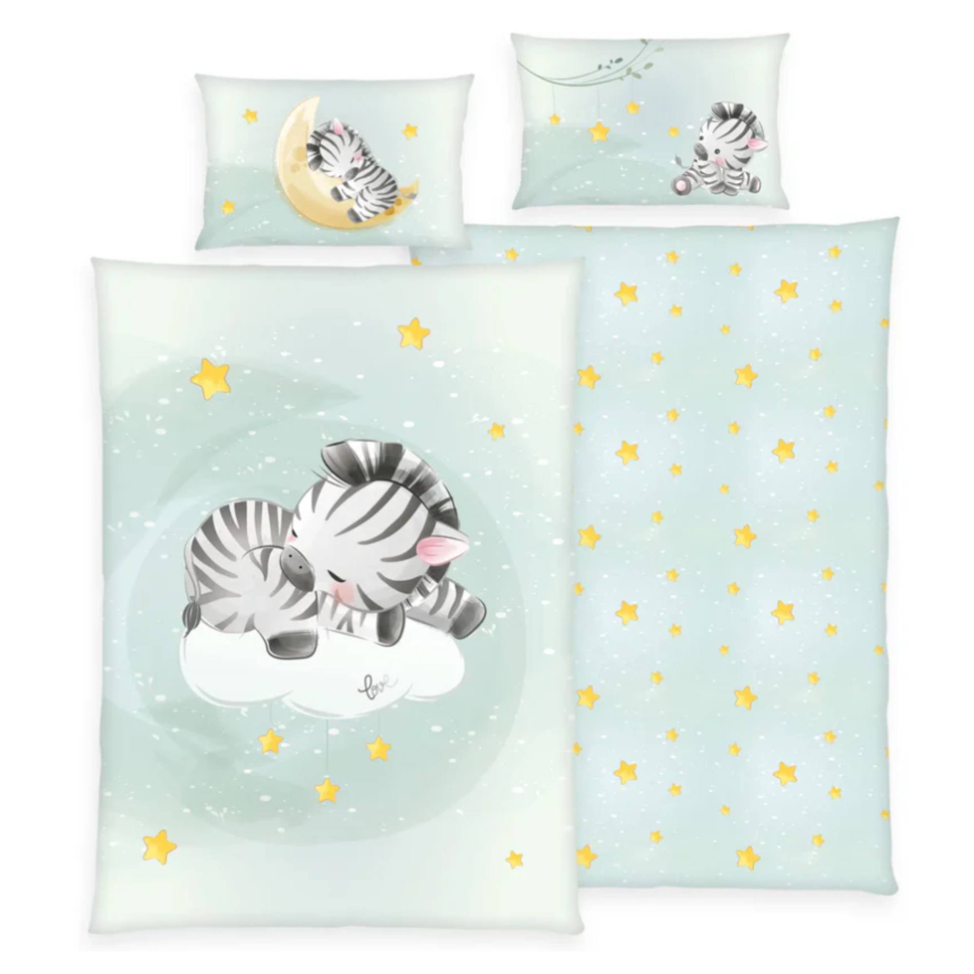 Detská posteľná bielizeň ZEBRA s ilustráciou spiaceho zebrieho mláďaťa, zaistí deťom spánok ako na obláčiku, vďaka jej bavlnenému zloženiu.