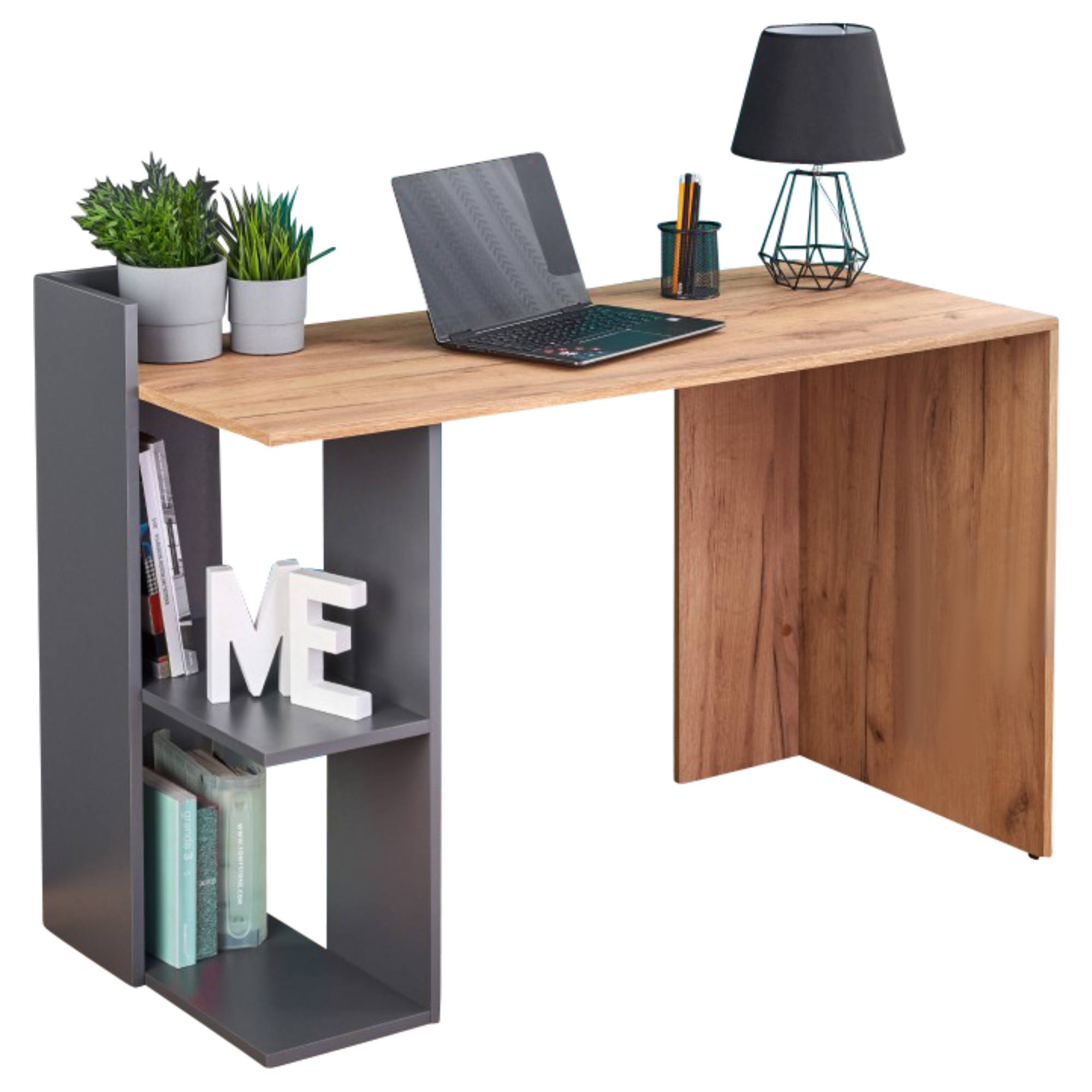 Písací stôl FANU sa hodí do každej moderne zariadenej domácej pracovne či kancelárie. Vyniká svojim minimalistickým vzhľadom, priestrannou doskou a praktickým bočným úložným priestorom. Do otvorených políc si môžete uložiť všetko, čo potrebujete mať hneď po ruke. Laminovaný drevený materiál sa vyznačuje jednoduchou údržbou.