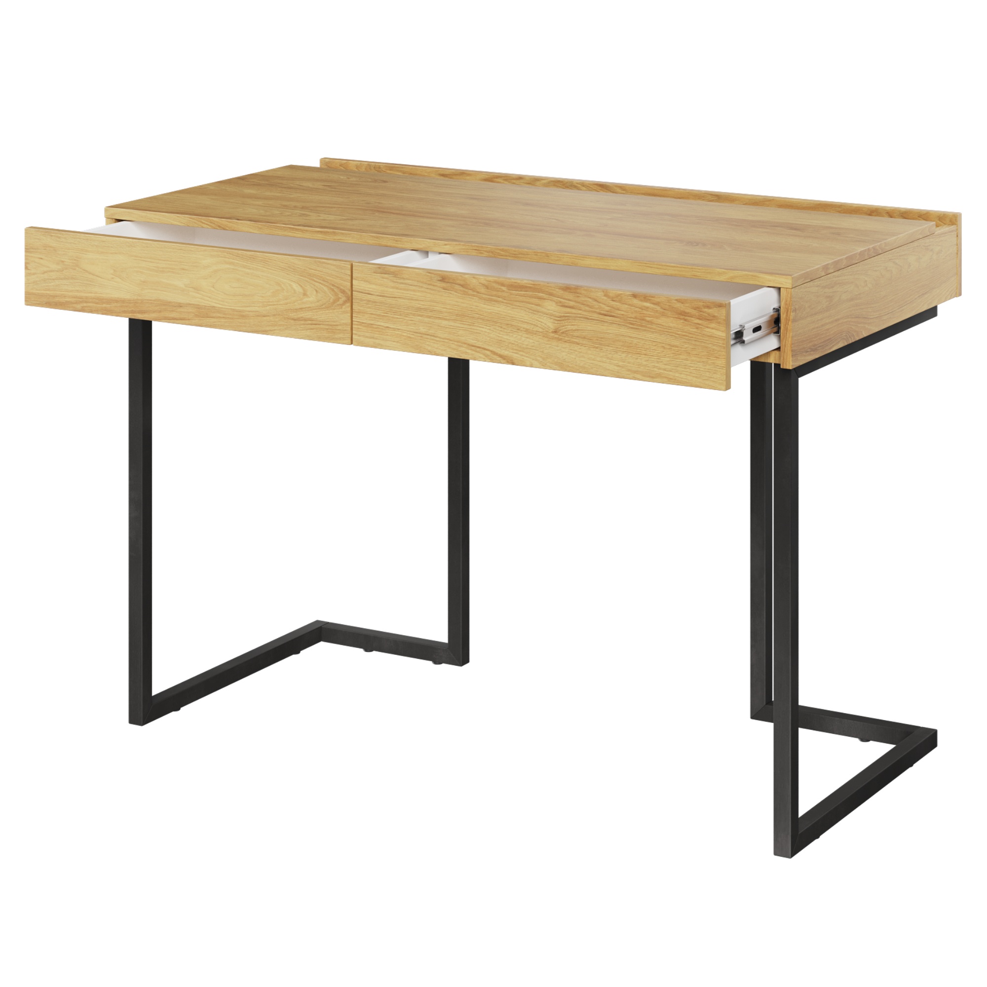 Stôl ponúka dostatočne veľkú pracovnú plochu a súčasťou dosky sú tiež 2 integrované zásuvky na uschovanie dokumentov či školských potrieb. Predné plochy sú v minimalistickom vyhotovení bez rúčok. Konštrukciu podopierajú originálne riešené nohy z ocele zaisťujúce celkovú pevnosť a stabilitu stola. Doska je vyrobená z laminovanej drevotriesky, ktorá sa vyznačuje ľahkou udržiavateľnosťou.