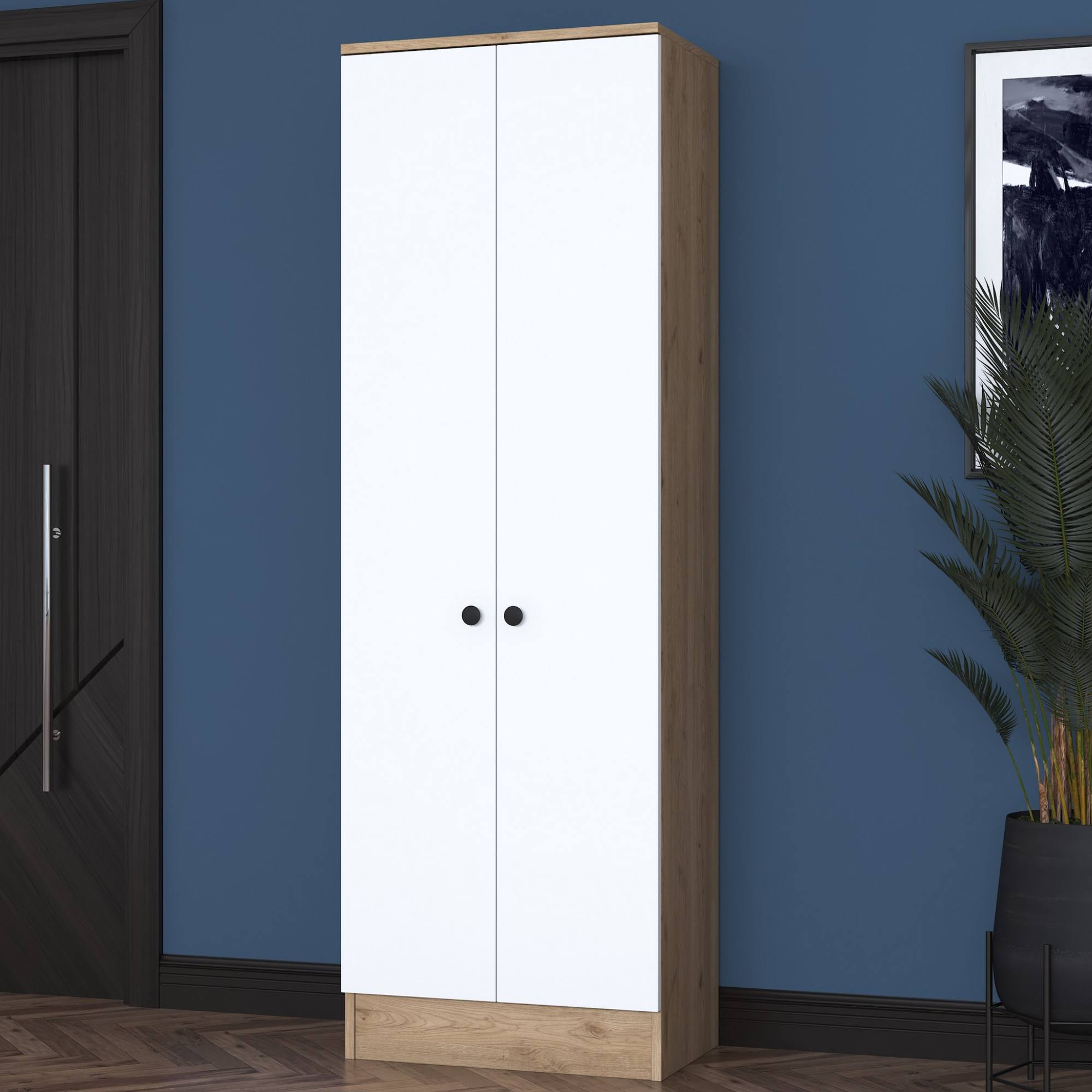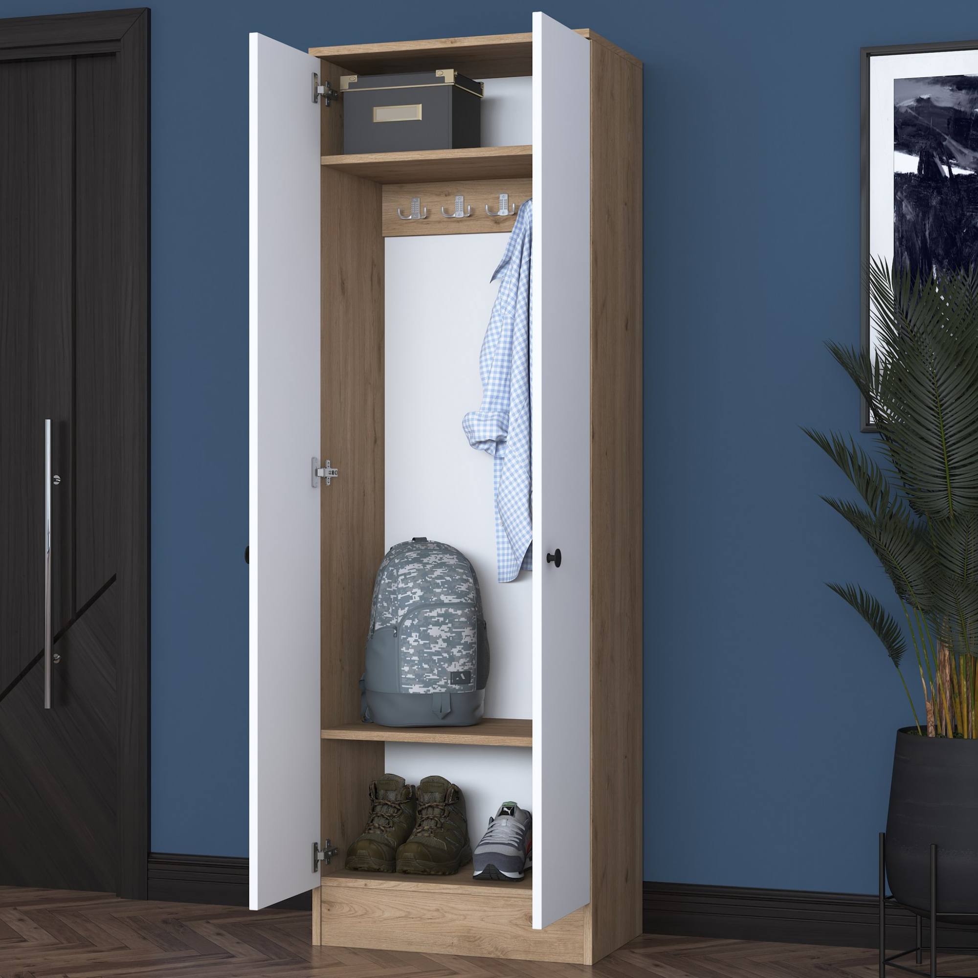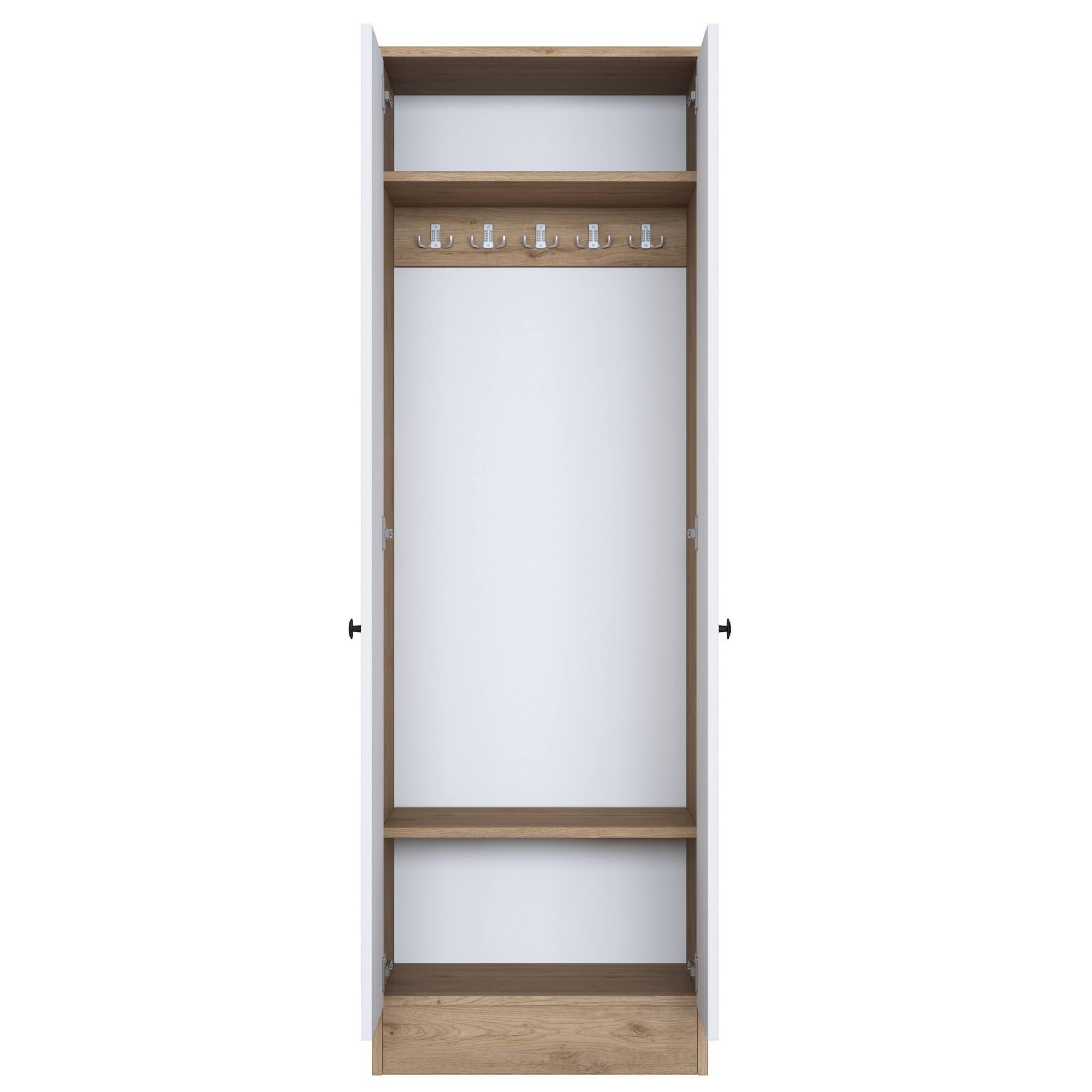 Skriňa ponúka dostatok úložného priestoru. Za jej dverami, ktoré sú pre lepšiu manipuláciu vybavené rúčkami, sa nachádzajú nielen 2 vložené police. Nechýba ani 5 dvojitých háčikov, na ktoré si môžete zavesiť bundy, kabáty aj módne doplnky.