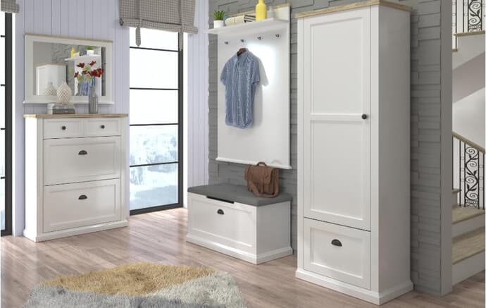 Súčasťou tejto série je aj predsieňová skriňa GALINEO, ktorá ponúka dostatok úložného priestoru. Okrem priestoru za výklopnými dvierkami je vybavená aj 1 výsuvnou šatníkovou tyčou. Aby sa s dvierkami dobre manipulovalo, sú vybavené kovovými úchytkami.