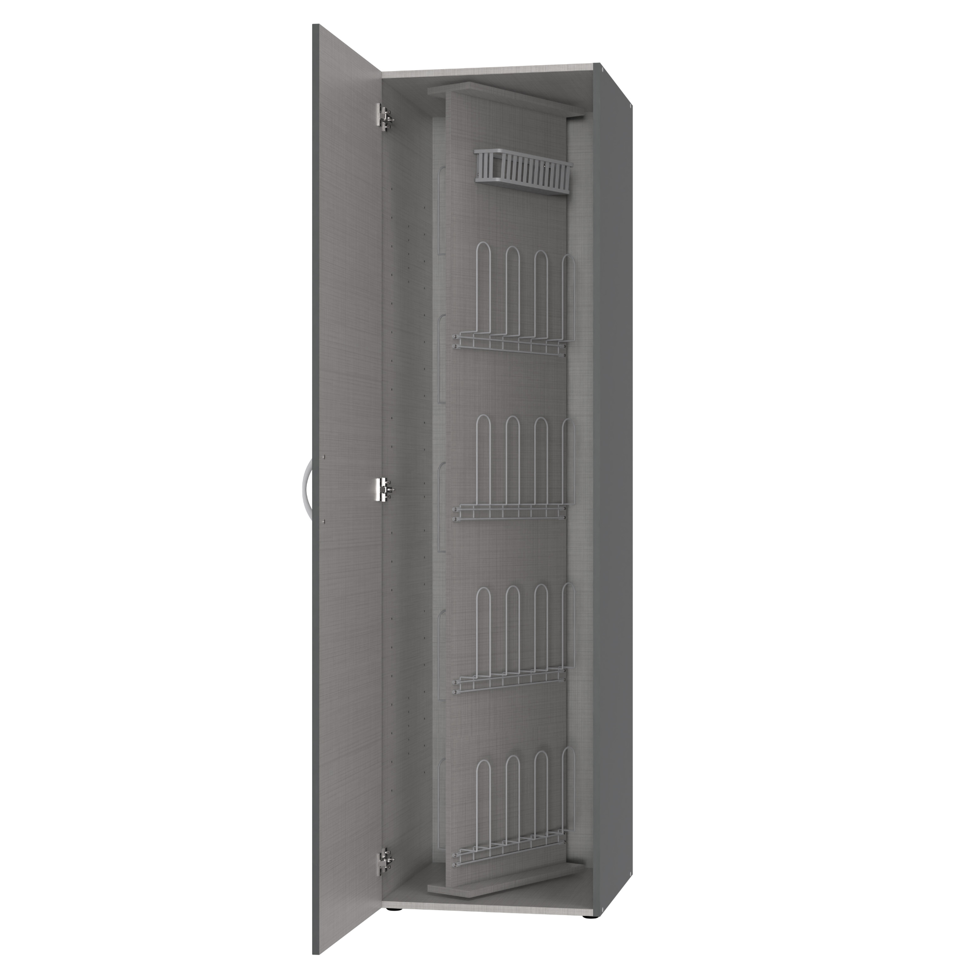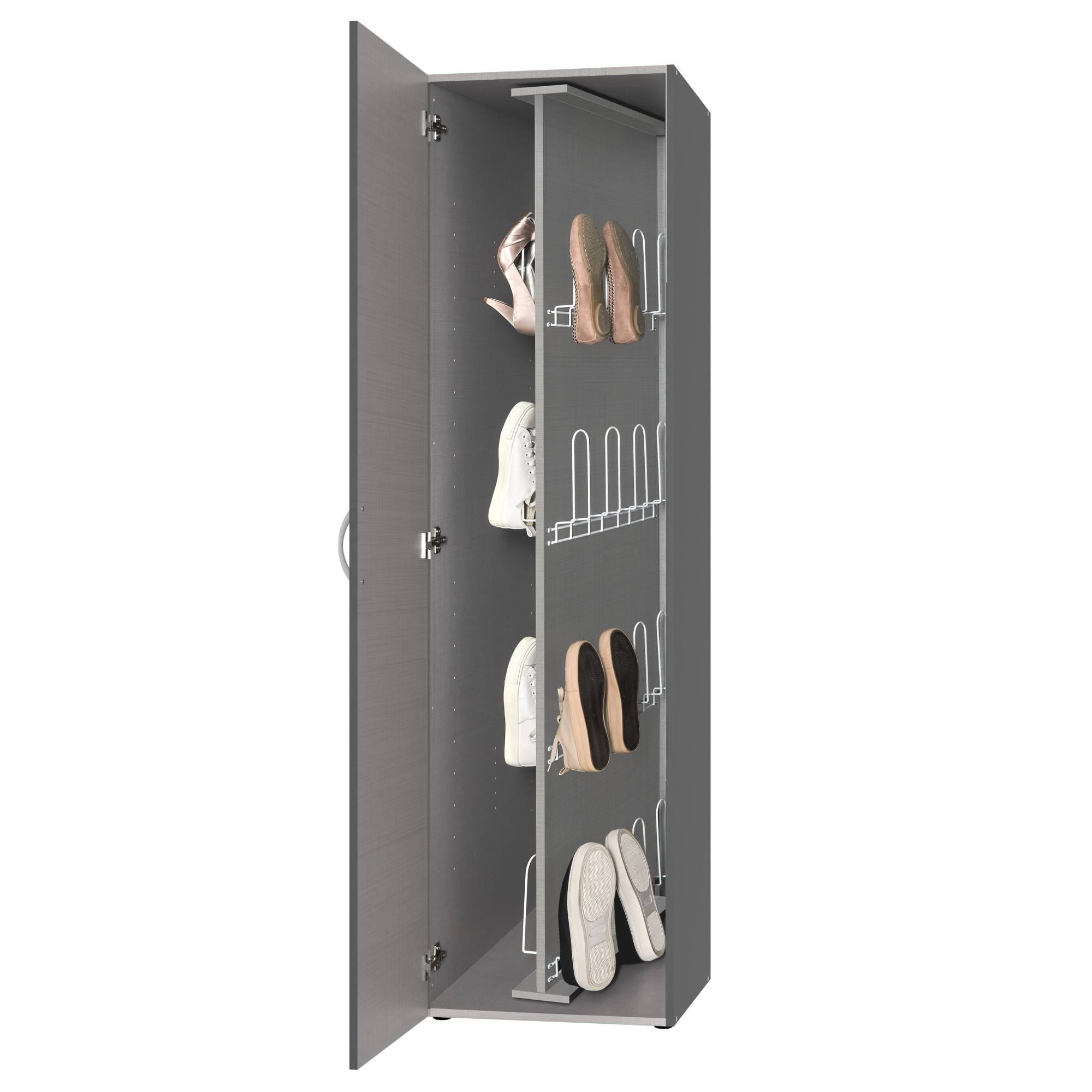 Skriňa je vybavená otočnými dverami, za ktorými sa v niekoľkých výškových úrovniach nachádzajú vešiaky na prehľadné usporiadanie vašej obuvi a tiež praktický košík na drobnosti. Jednoduchú každodennú manipuláciu s dverami umožňuje rúčka vo farbe kovu. Korpus skrine je vyrobený z laminovaného dreveného materiálu a dvere z fóliovaného dreveného materiálu. Tieto materiály sú nenáročné na údržbu.