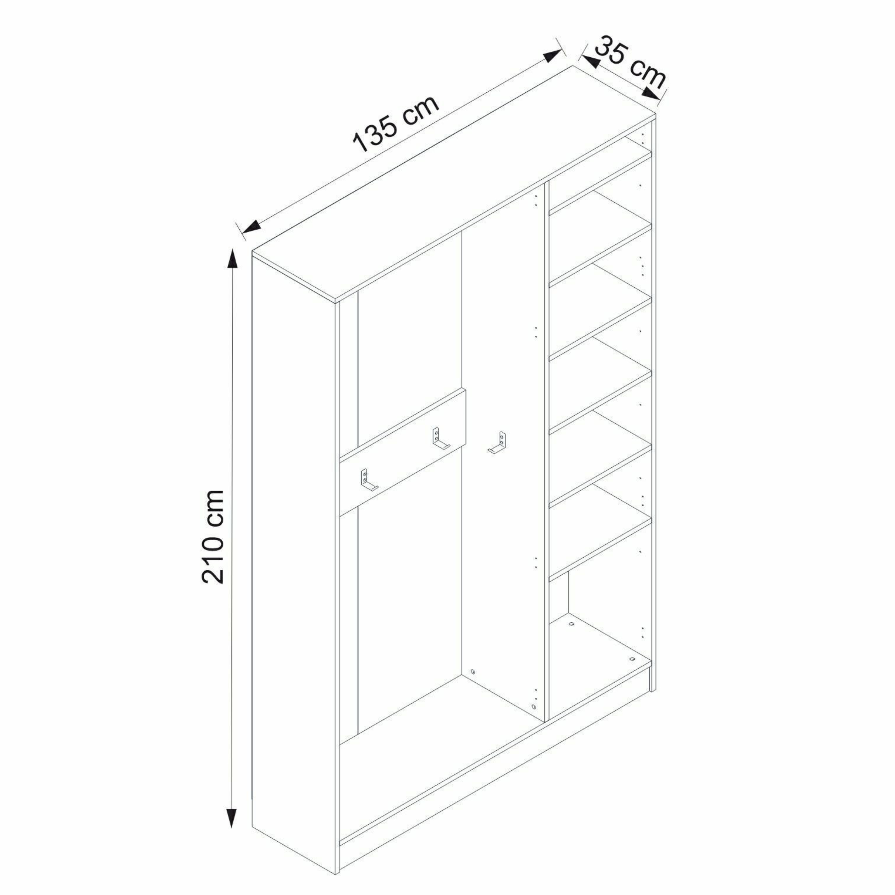 Skriňa ponúka dostatok uzatvárateľného úložného priestoru na prehľadné uloženie vašich zvrškov, obuvi, doplnkov a ďalších nevyhnutností. Vnútorné vybavenie pozostáva celkovo zo 6 odkladacích háčikov a 6 vložených políc. Konštrukcia je vybavená otočnými dverami, ktoré sú osadené praktickými úchytkami. Skriňa je vyrobená z laminovaného dreveného materiálu s povrchom nenáročným na údržbu.