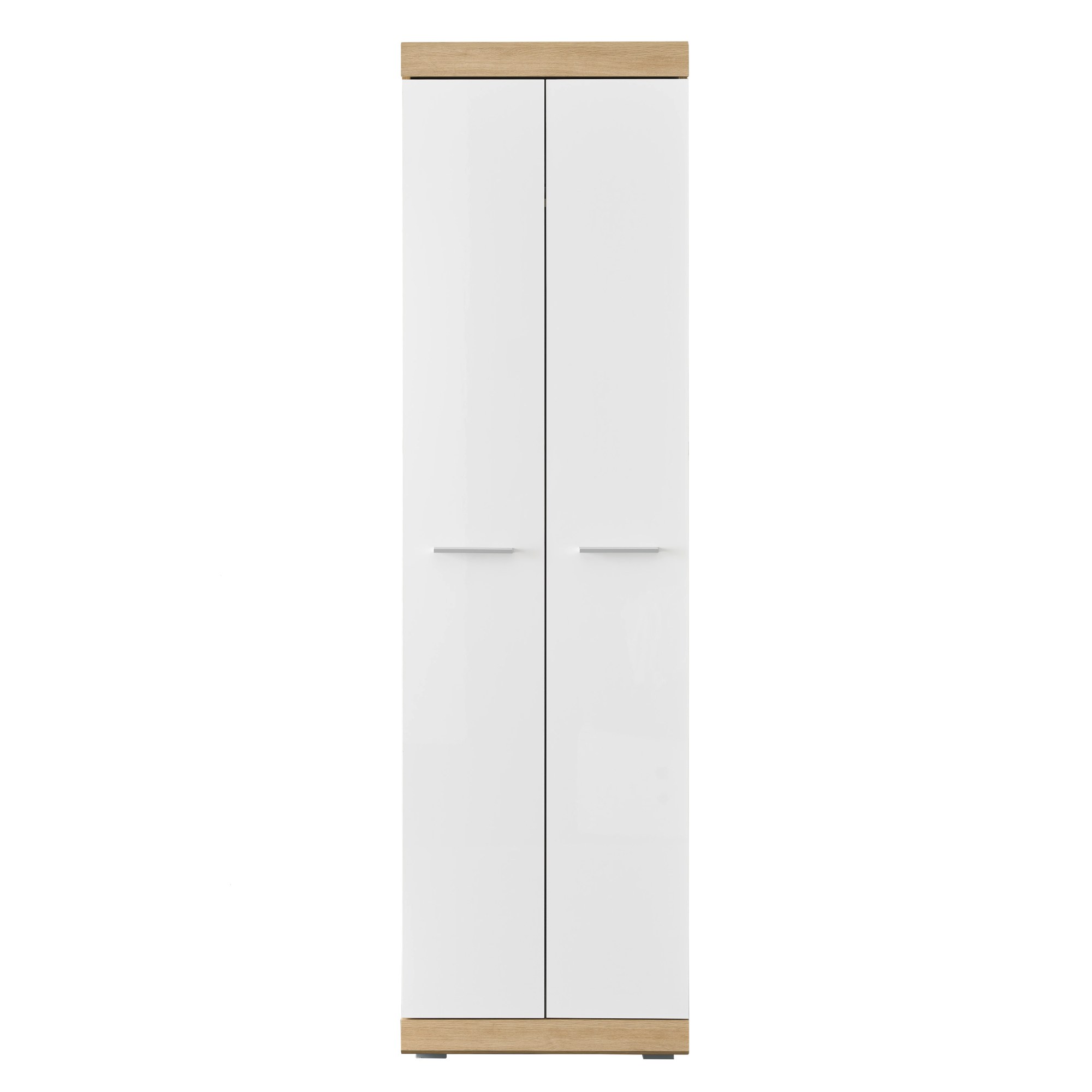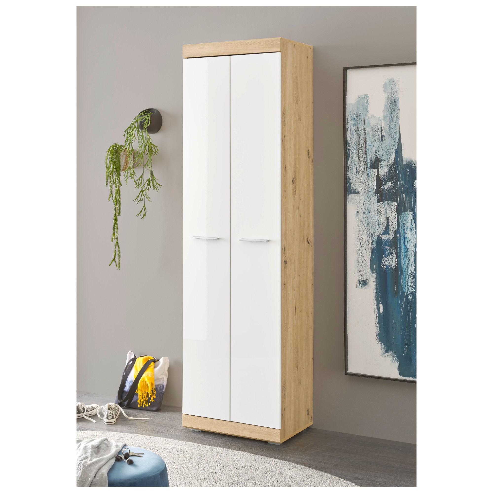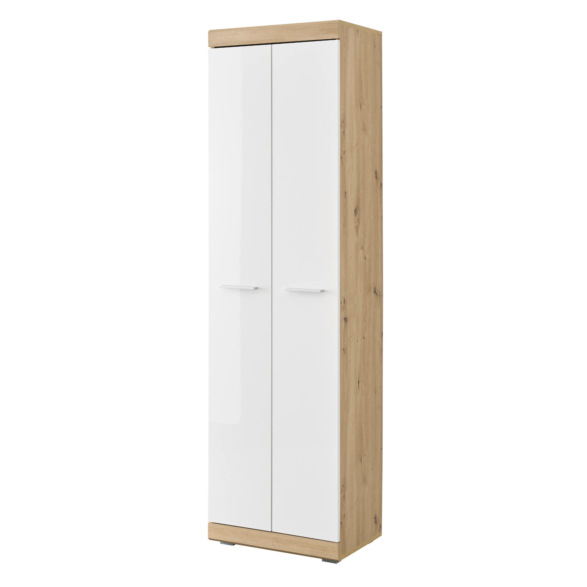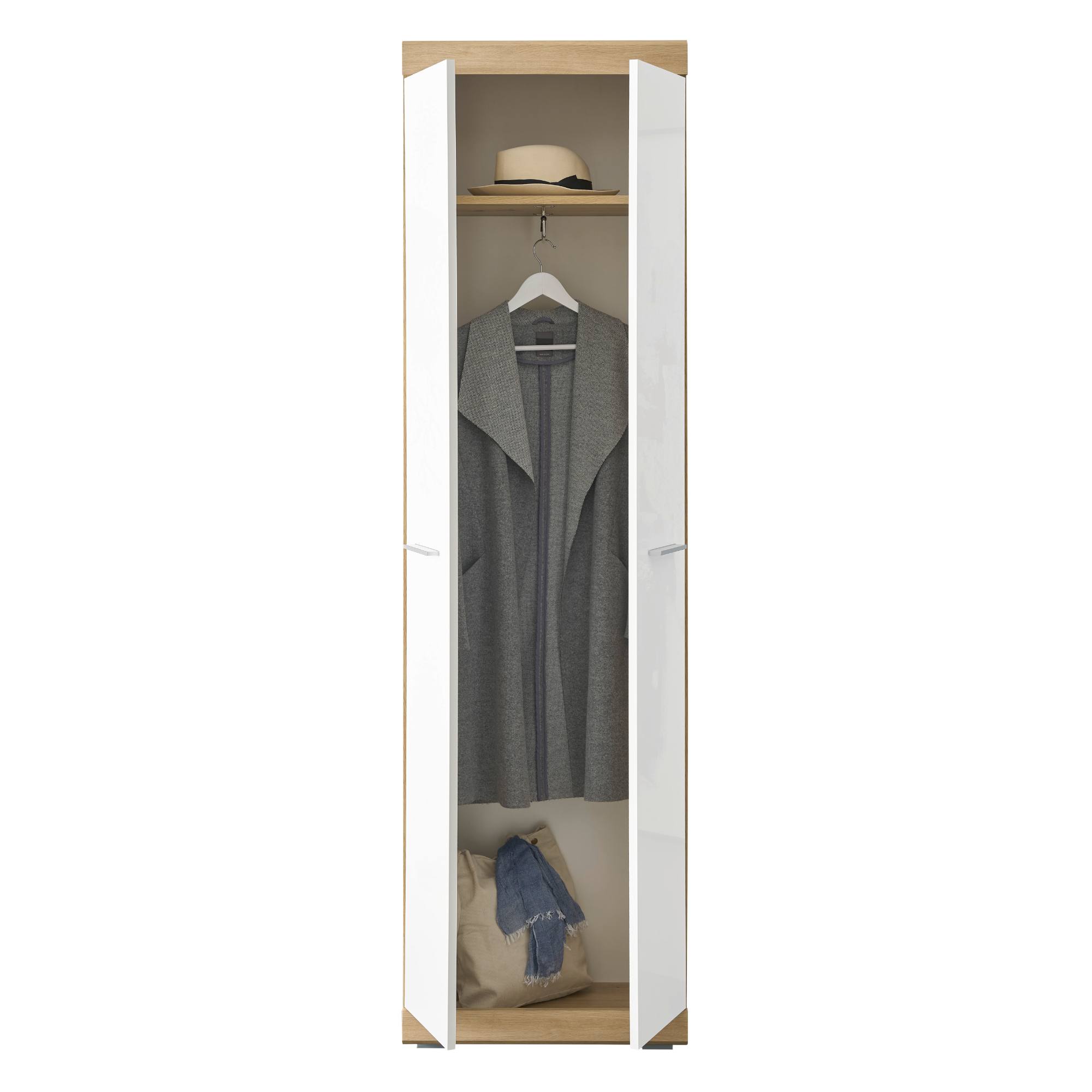 Vyrobená je z laminovaného dreveného materiálu, ktorý sa vyznačuje ľahkou udržiavateľnosťou aj dlhou životnosťou. Korpus je ladený do dekora duba artisan s decentnou kresbou dreva, zatiaľ čo predné plochy dvierok sú v kontrastnom bielom odtieni vo vysokom lesku. Dvoje dvierka s praktickými rúčkami skrývajú dostatočne veľký úložný priestor s policou a šatníkovou tyčou. Nosnosť vloženej police je max. 5 kg.