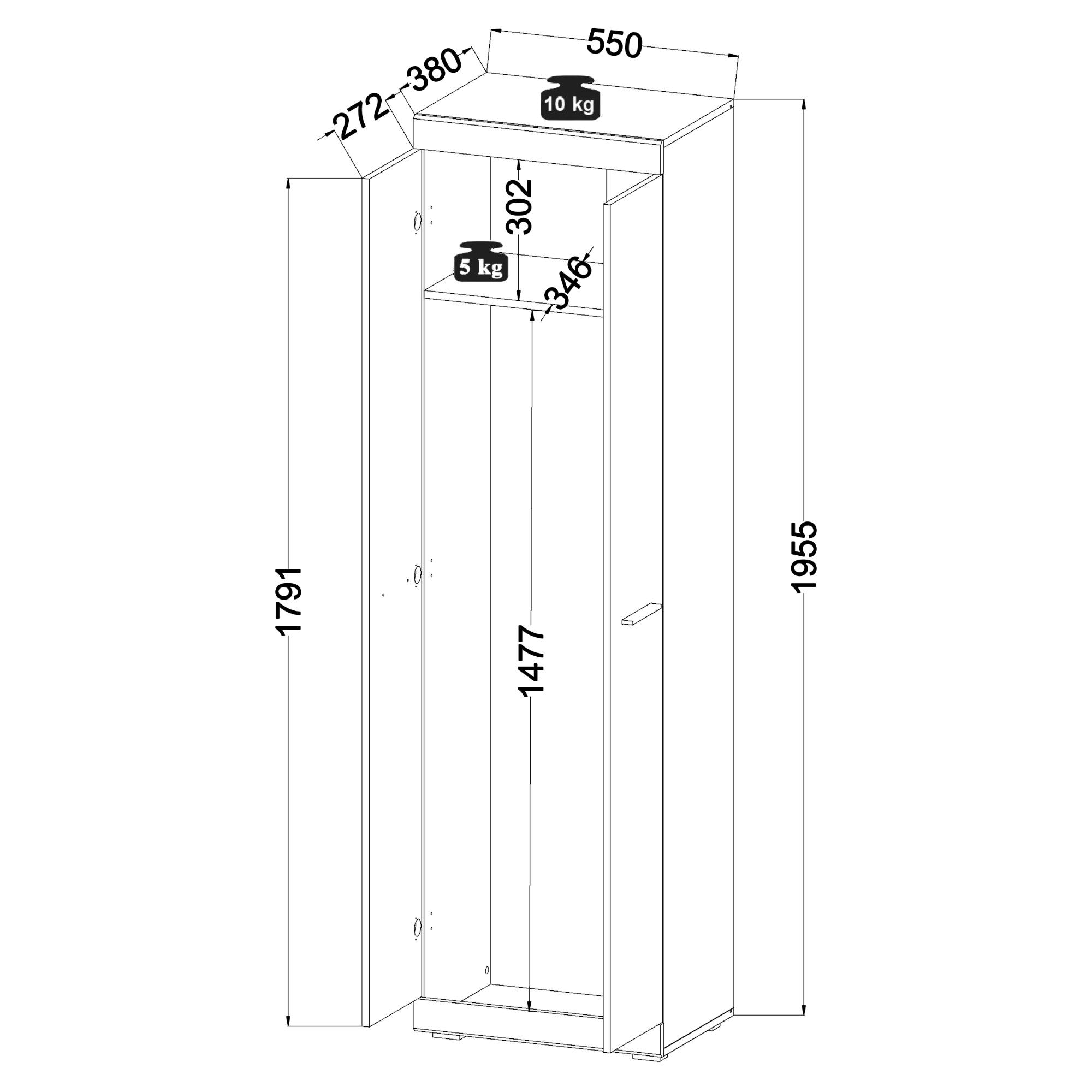 - Vybavená 1 šatníkovou tyčou a 1 vloženou policou