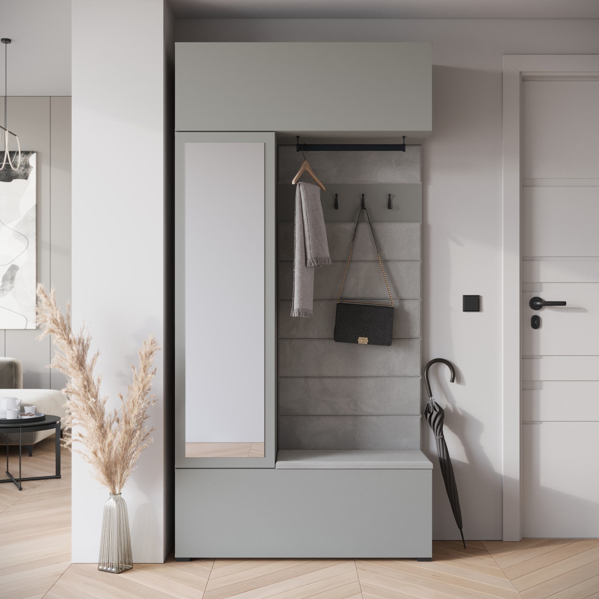 Táto predsieňová stena ponúka dostatok úložného priestoru na 28 párov topánok a jej nosnosť je 65 kg. Stena je vybavená nielen 6 nastaviteľnými policami umiestnenými za dvierkami, ale aj 1 šatníkovou tyčou a 4 háčikmi, na ktoré si môžete zavesiť práve nosené oblečenie, kabelky aj rôzne módne doplnky. Nechýba ani zrkadlo, ktoré vám umožní vždy pred odchodom z domu skontrolovať váš vzhľad. Pretože skrinku so zrkadlovými dverami je možné namontovať na pravú aj ľavú stranu, môžete stenu dokonale prispôsobiť vašim potrebám.